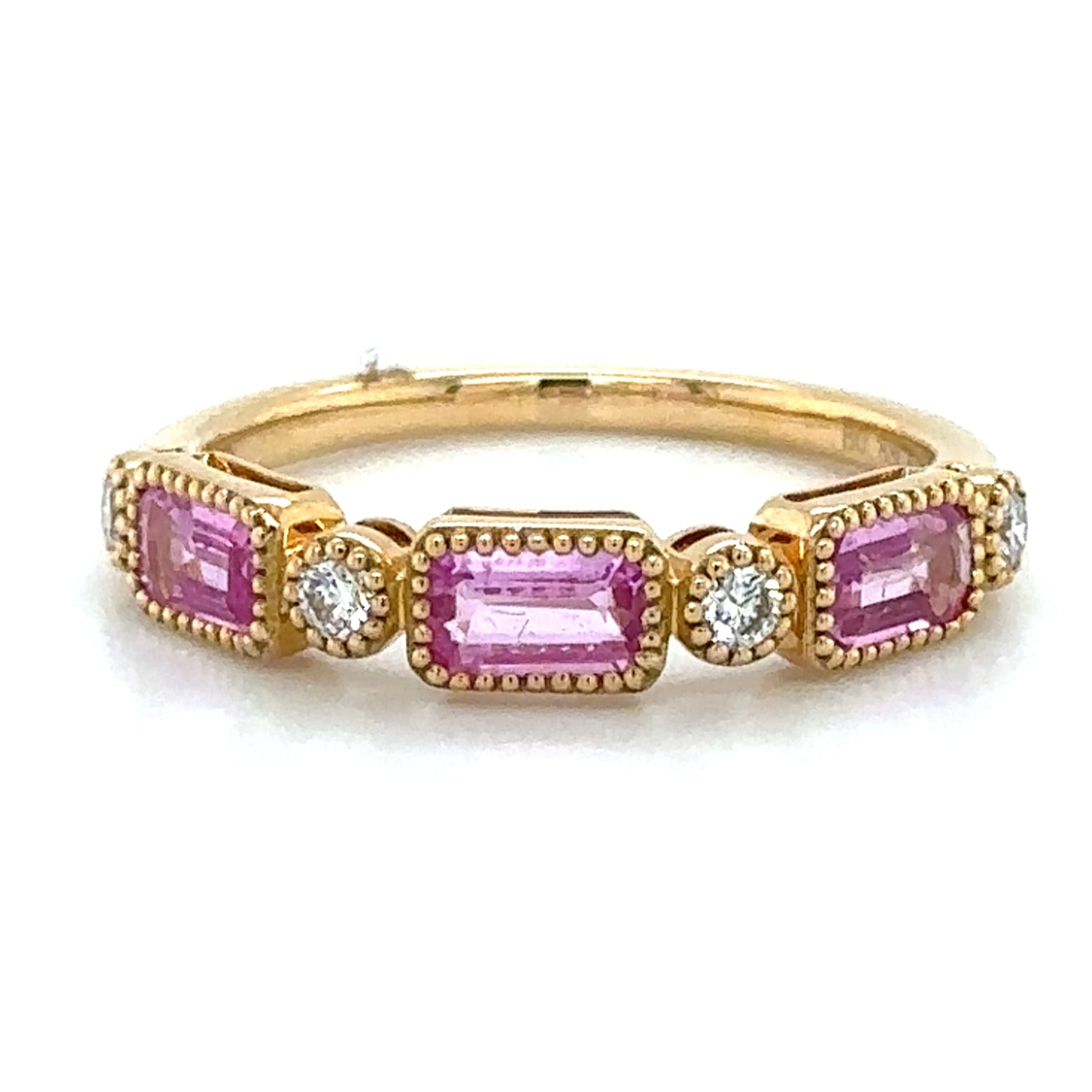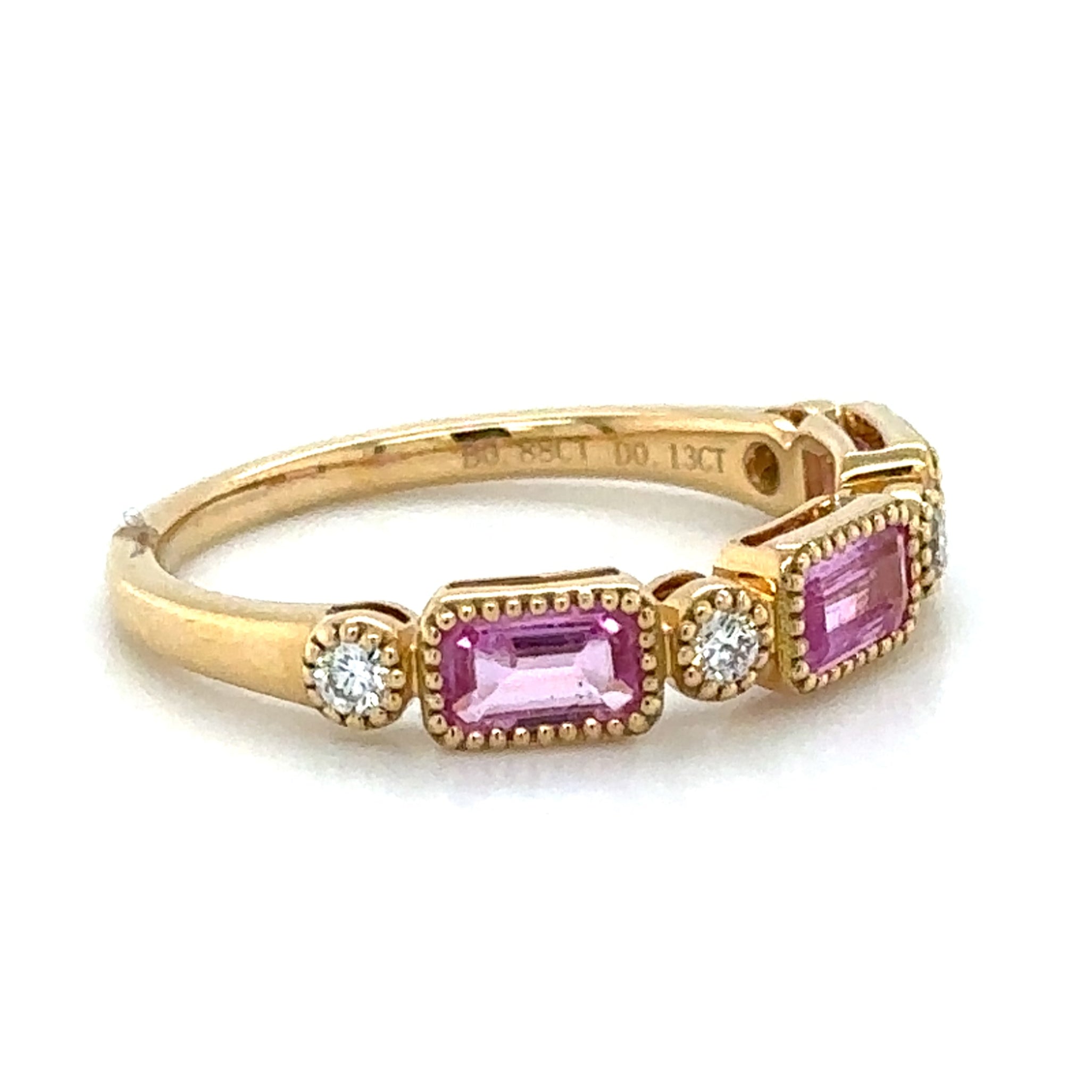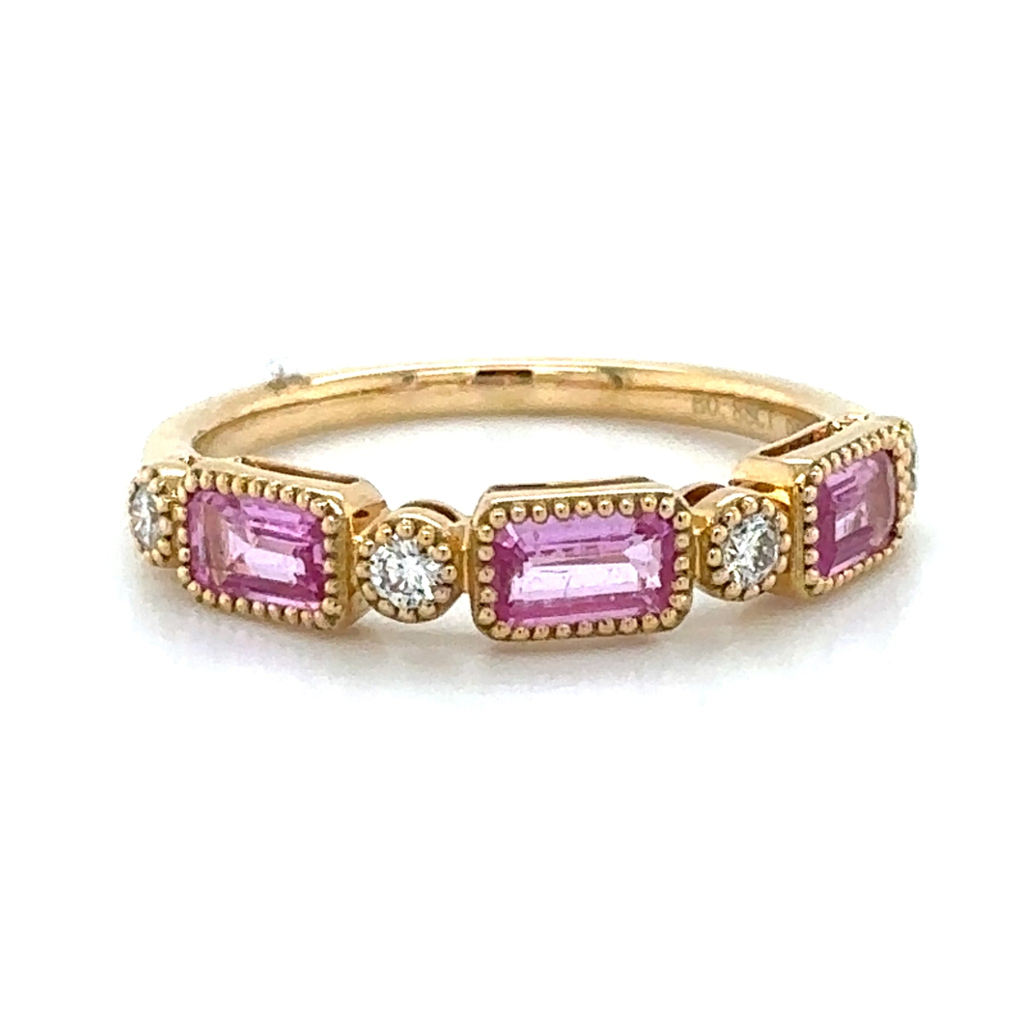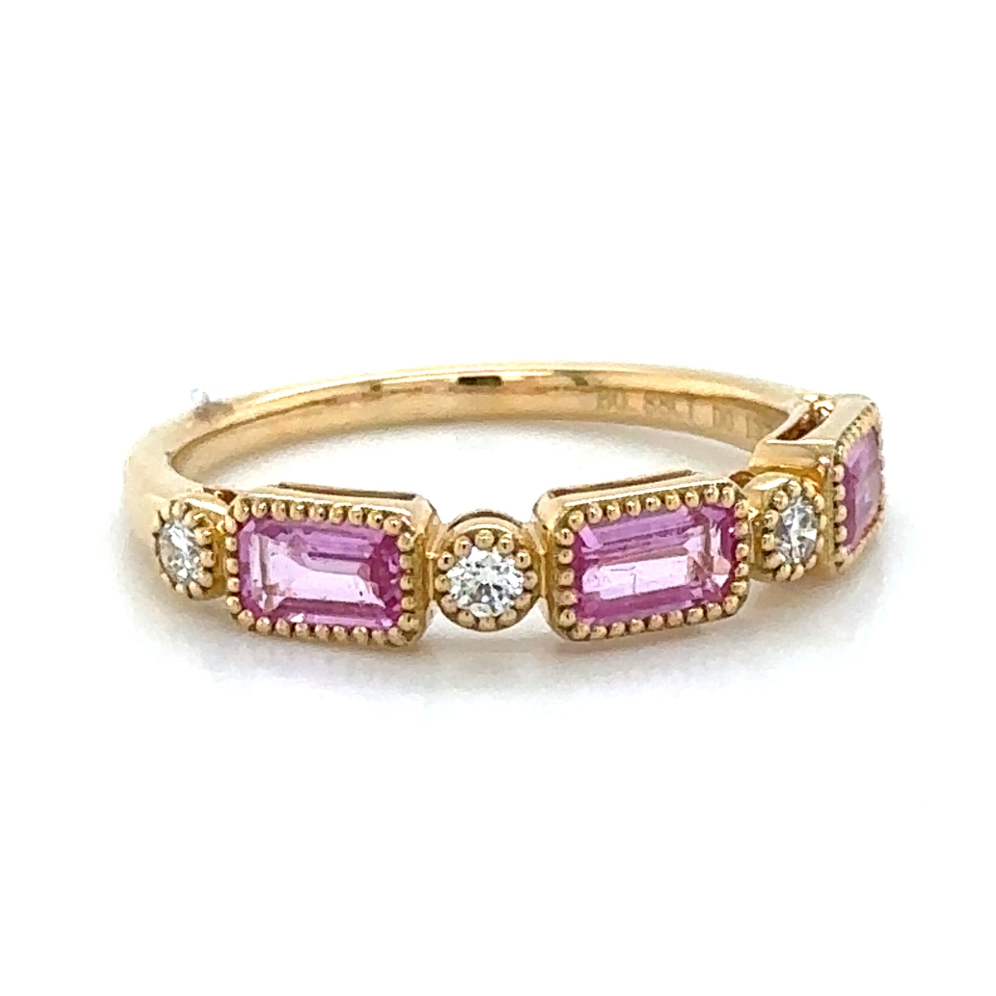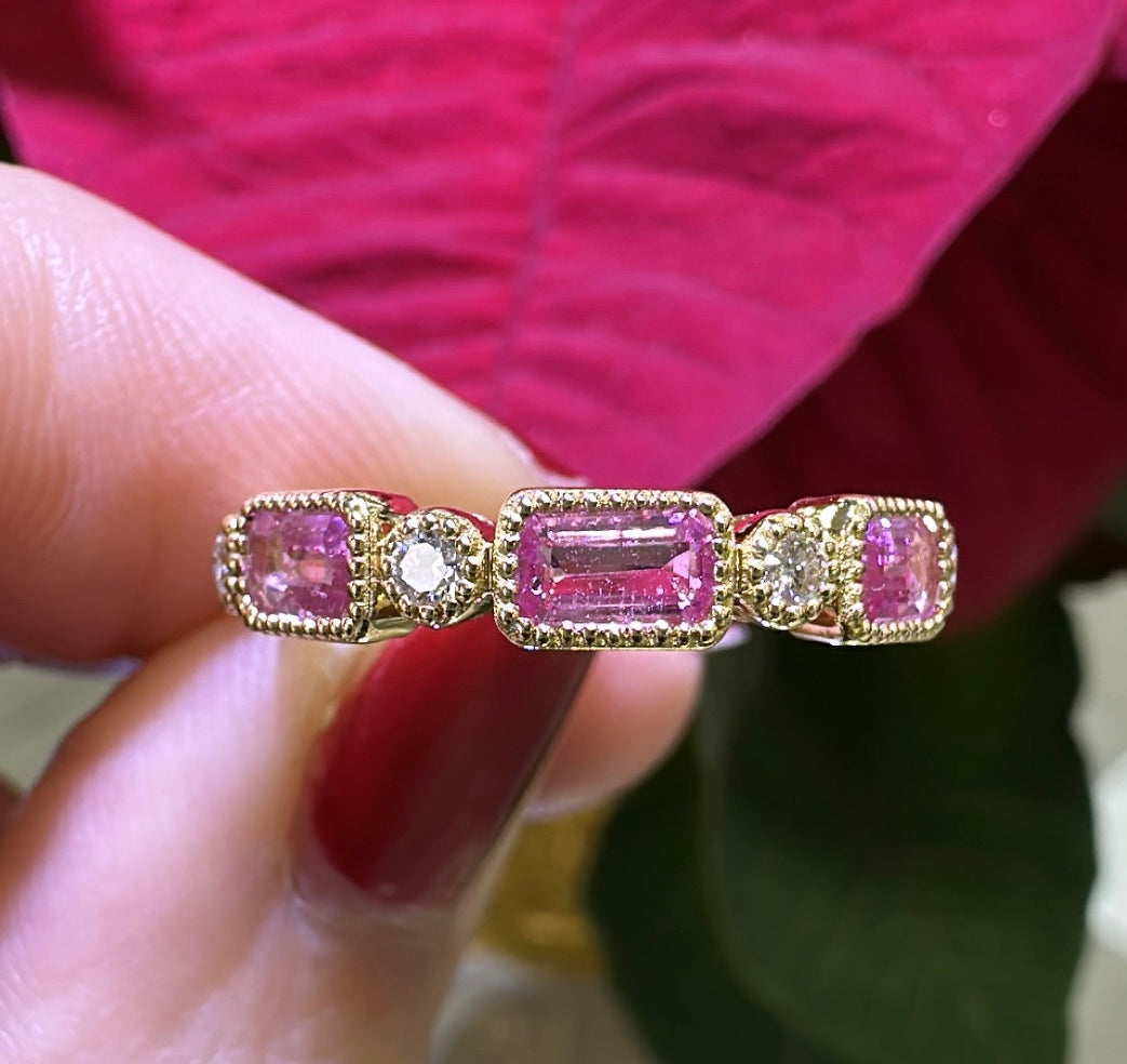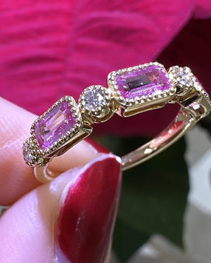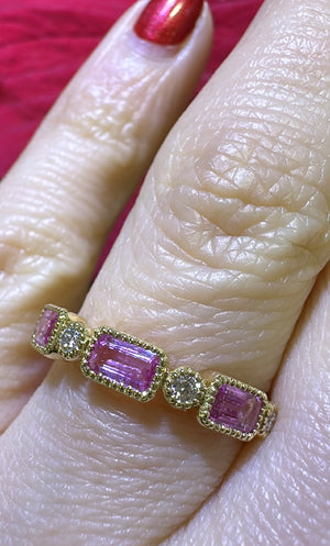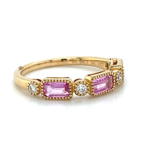 Celebrate in style with our stunning 1.01ct tw emerald-cut pink sapphire and diamond celebration stackable ring! Made with gorgeous pink sapphires and sparkling diamonds, this ring will add a touch of elegance to any outfit. Perfect for stacking or wearing alone, it's a must-have for any jewelry collection.