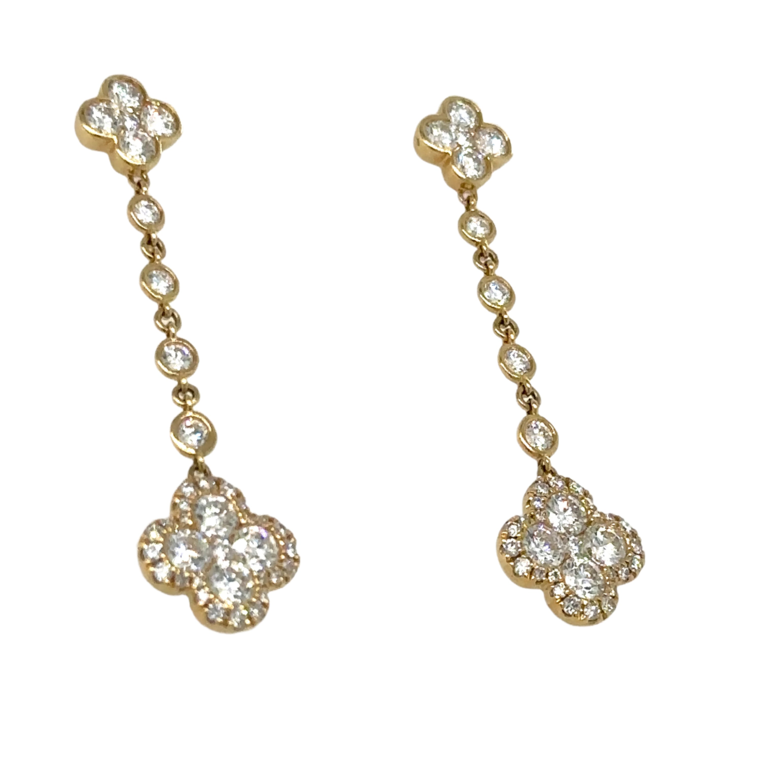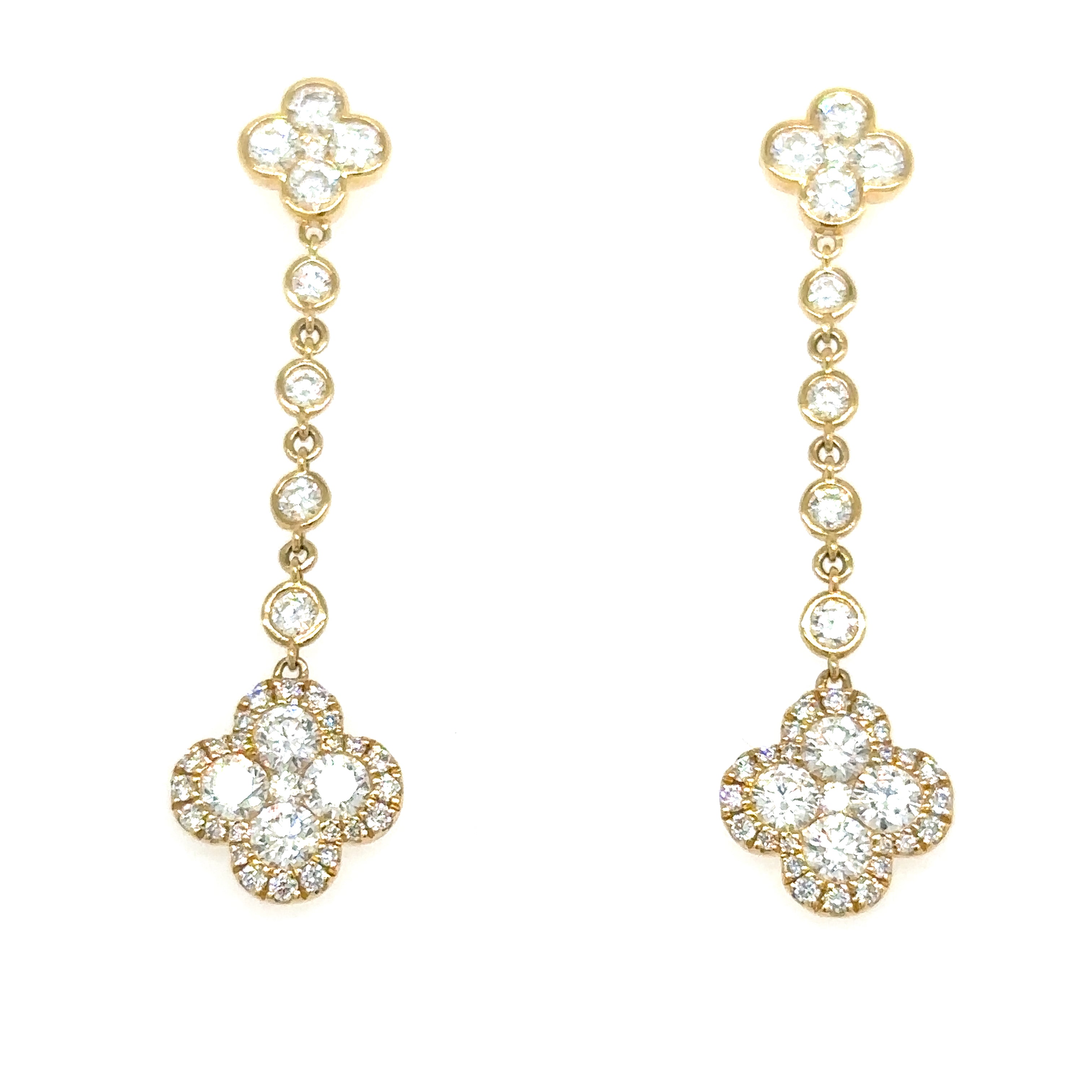 "Add a touch of elegance and sparkle to any outfit with our 2.06ct tw diamond clover flower dangling earrings. Featuring a stunning clover flower design and 2.06 carats of diamonds, these earrings will make you feel like a glamorous diva! Perfect for any occasion and sure to turn heads. Order now!"