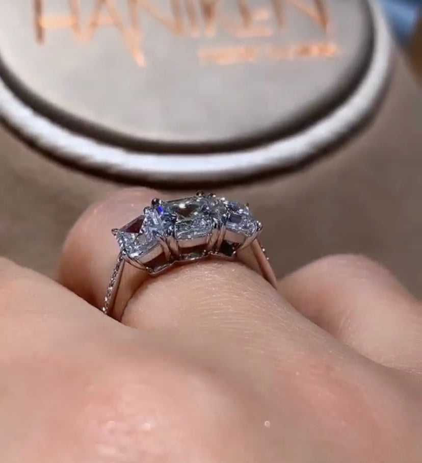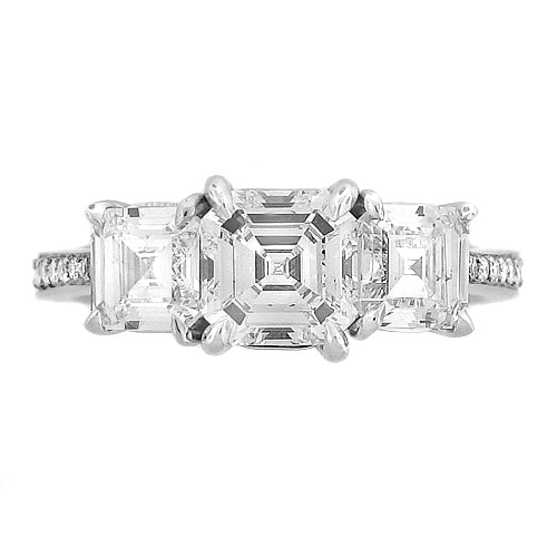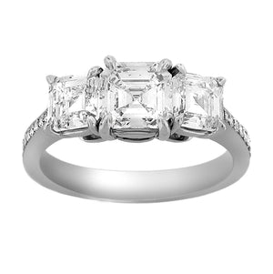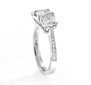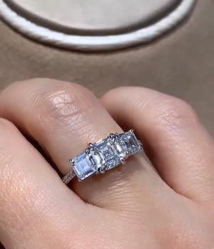 This three stone diamond engagement ring all shine bright with this Asscher cut diamonds. Center, prong-set stone measures 1.08carats, and two side Asscher diamonds measure 1.14ct in total weight. In addition, this platinum ring has smaller accent diamonds on the band set pave style and measuring at 0.14ct t.w. Metal: Platinum Center Diamond: 1.08ct G-VS1 Asscher (GIA) Side Diamonds (2): 1.14ctw Asscher Cuts Pave Diamonds (18): 0.14ctw Round Brilliant Setting: Prong, Pave