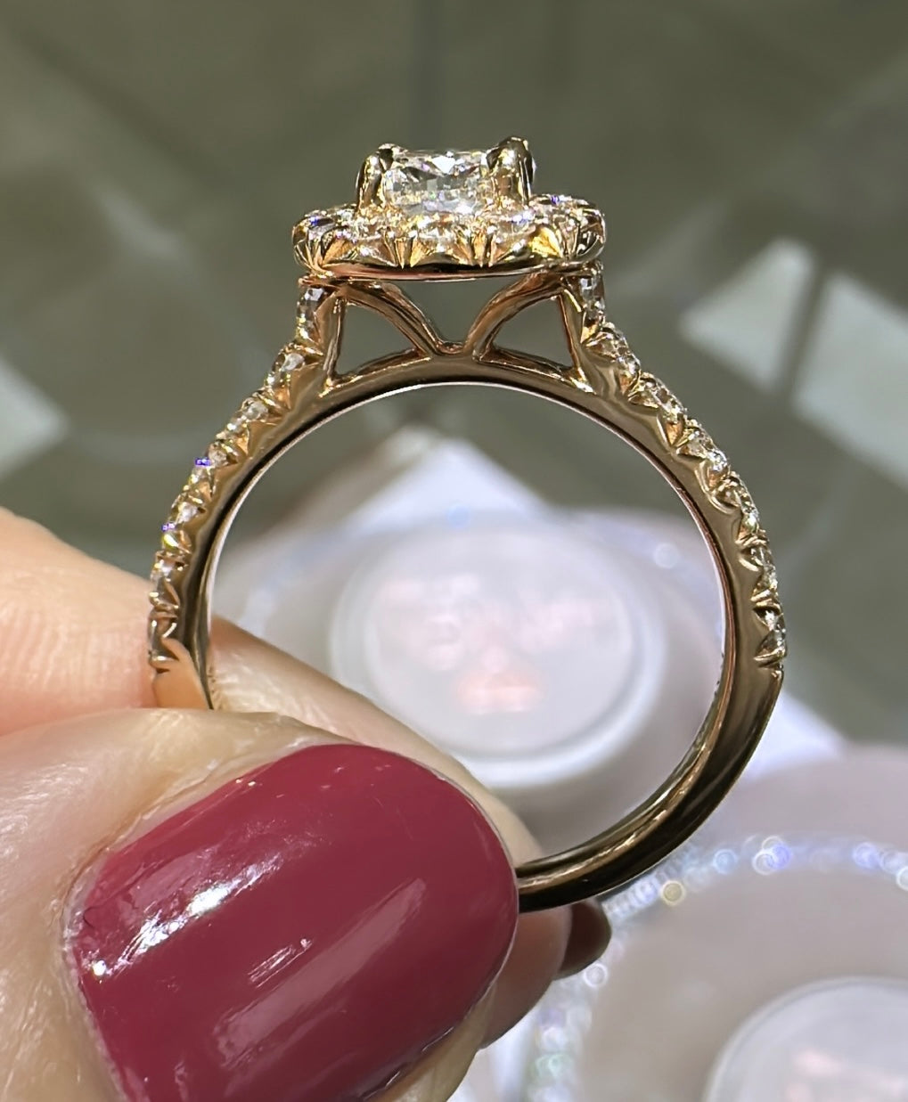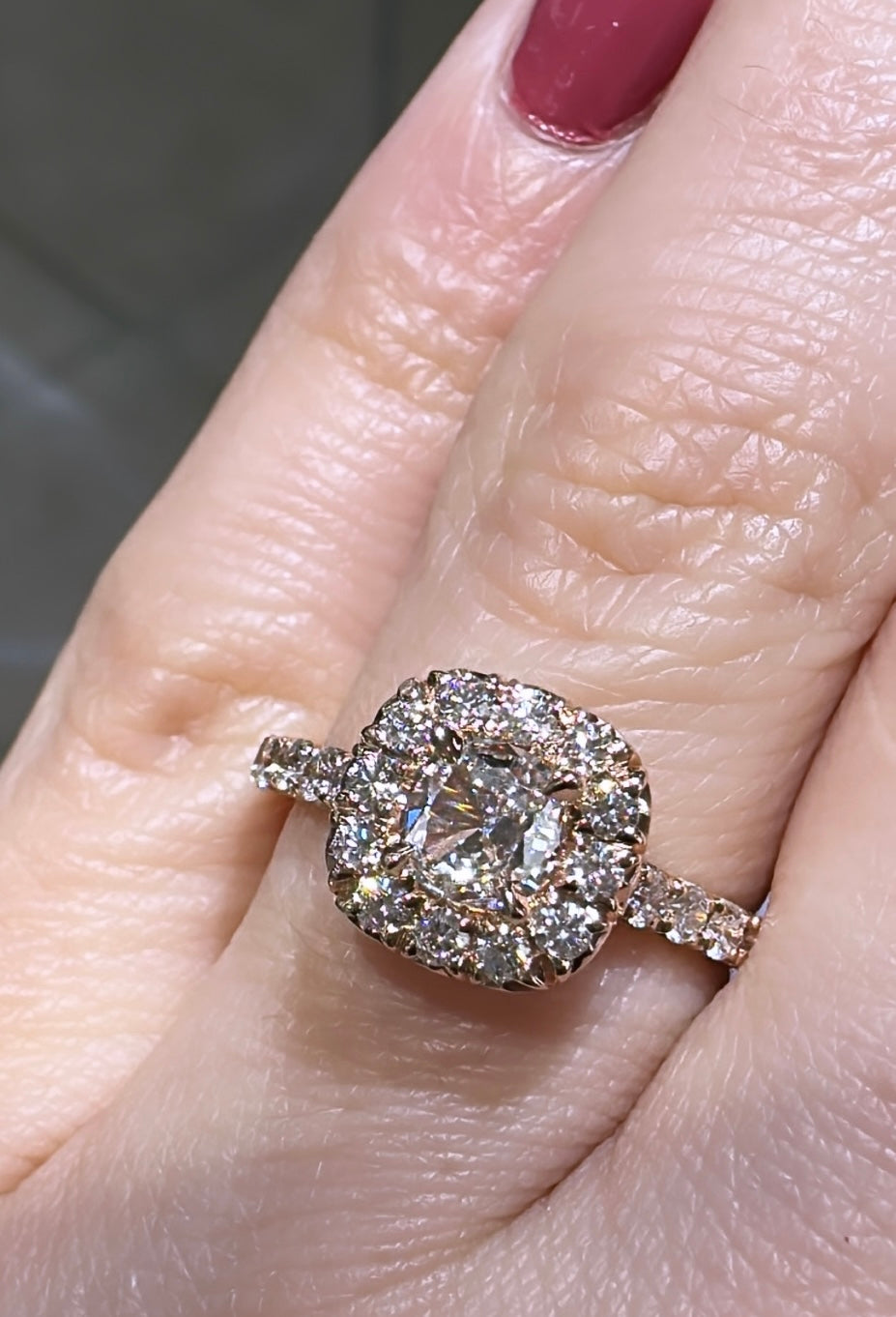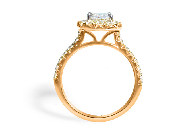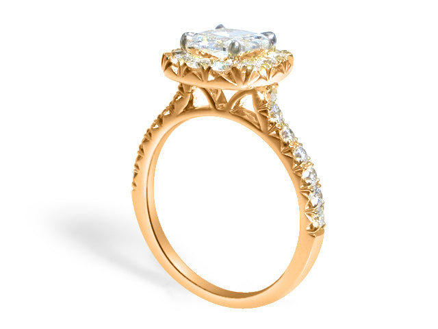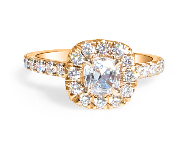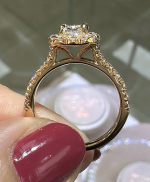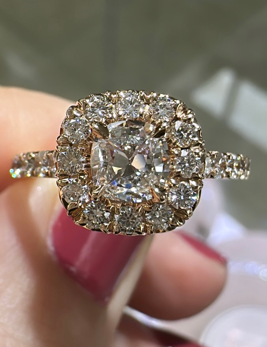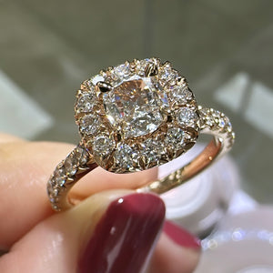 Henri Daussi diamond engagement ring featuring a pave halo and totaling 1.13 carats. This ring comes with Henri Daussi certified, signature cushion cut in the center. Metal: 14K Rose Gold Cushion Center: 0.51ct Halo, Side: Round 0.62ct tw Color: E Clarity: VS1