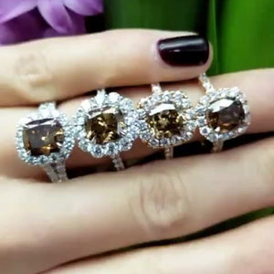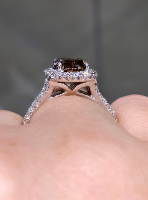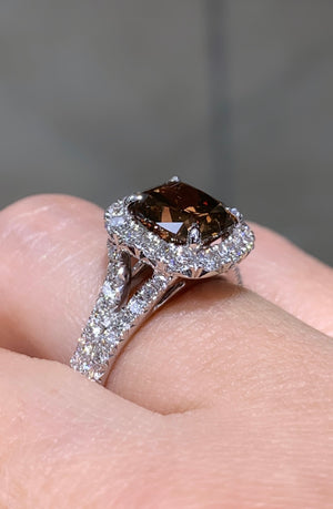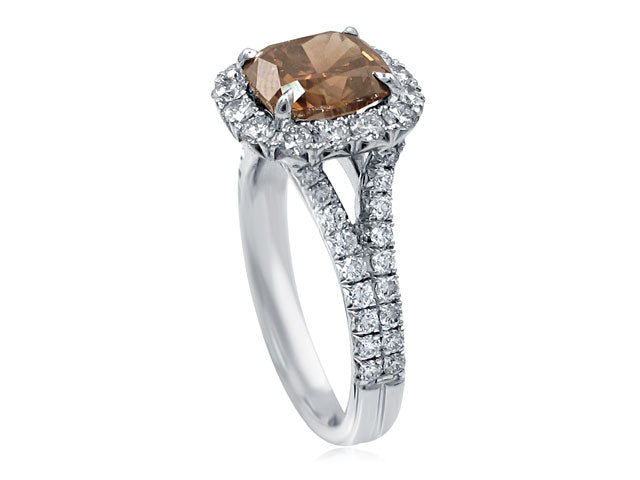 Be swept away by the scintillating beauty of Henri Daussi’s incredible 2.19ct Fancy Dark Orange Brown Cushion Cut Halo Engagement Ring. Dare to be different and make a statement with this bold and beautiful ring. Will you be the lucky one to wear it?