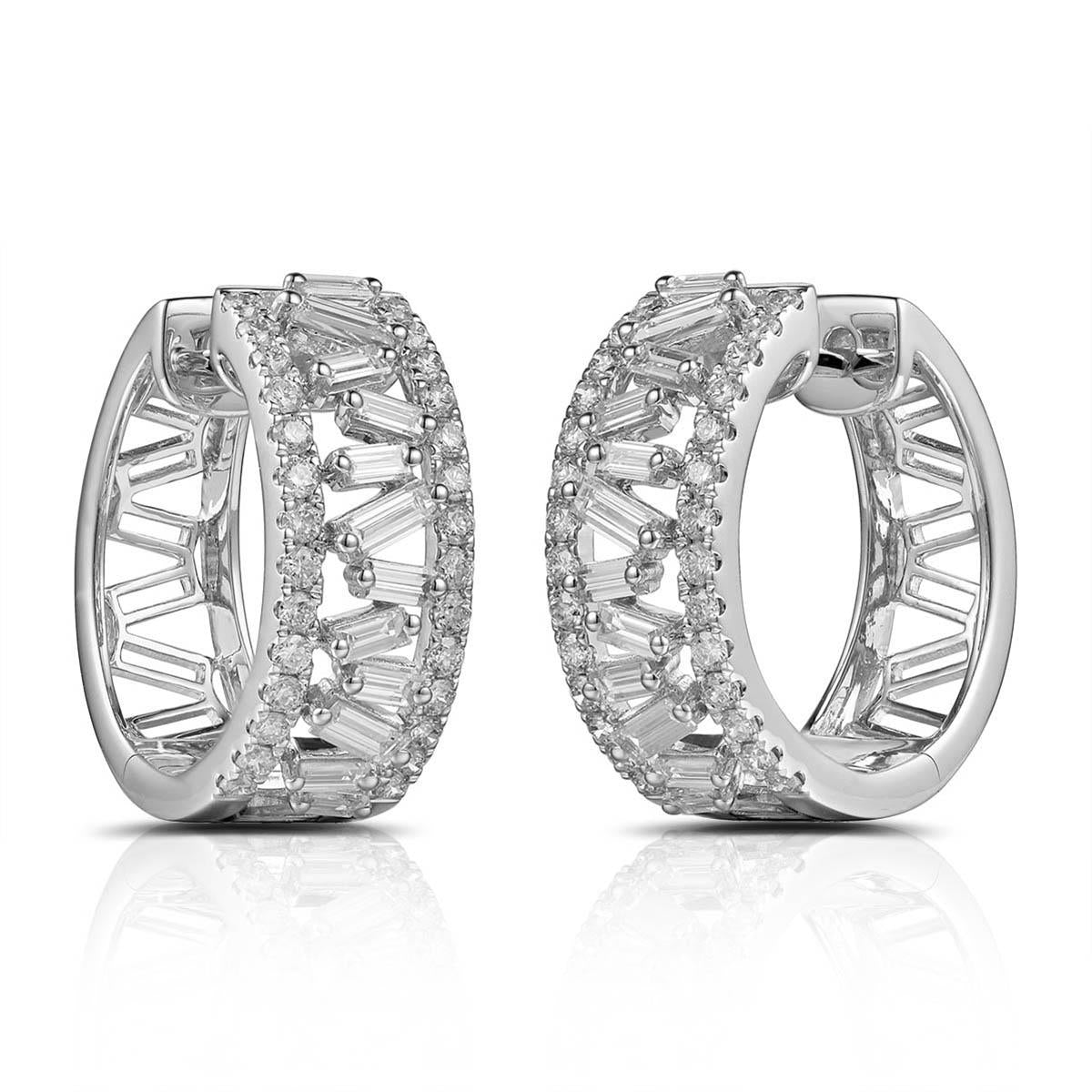 Elevate your style with our diamond 1.28carat baguette and round hoop earrings. Featuring sparkling diamonds in a unique baguette and round hoop design, these earrings will add a touch of luxury to any outfit. Indulge in the timeless elegance of these hoop earrings and make a statement wherever you go!