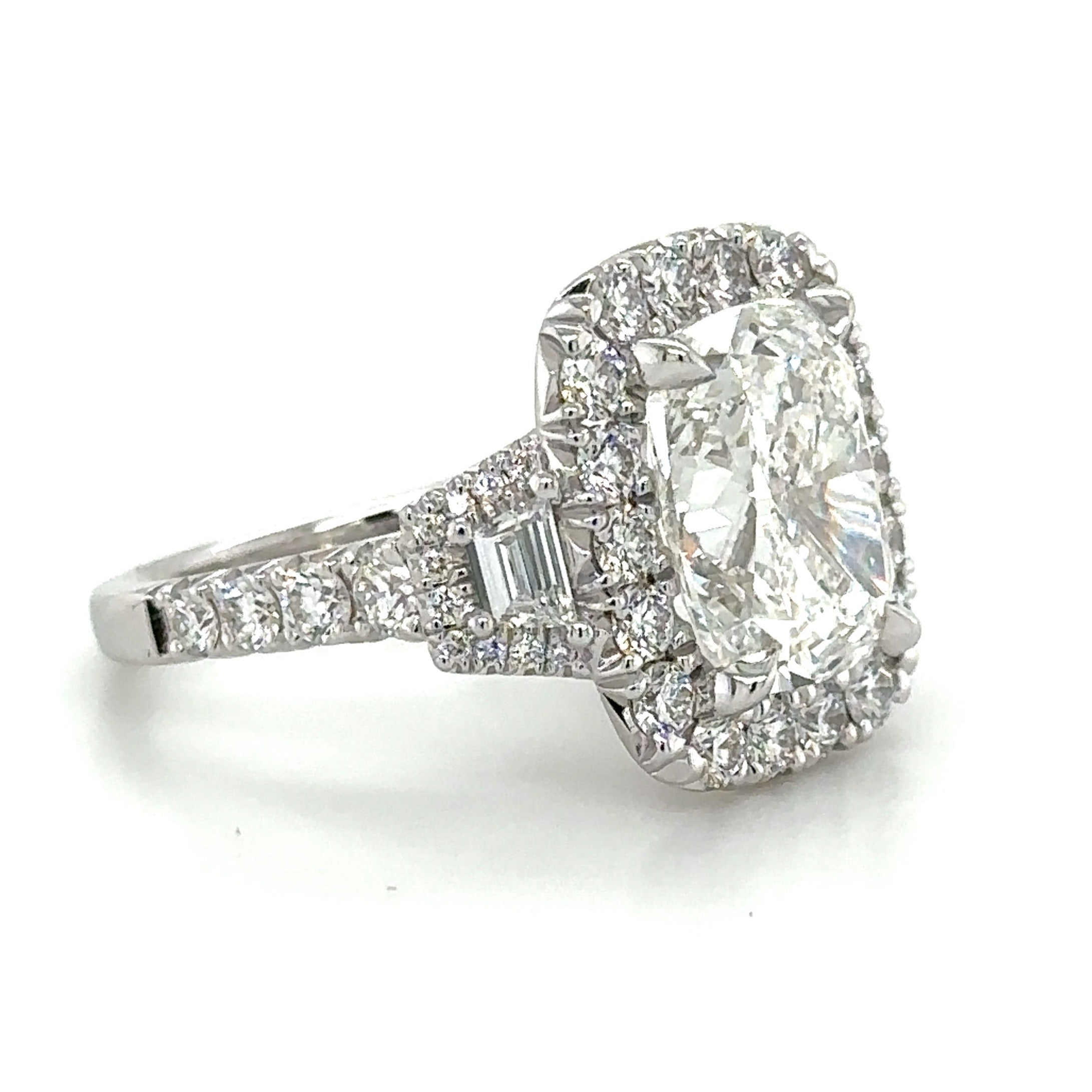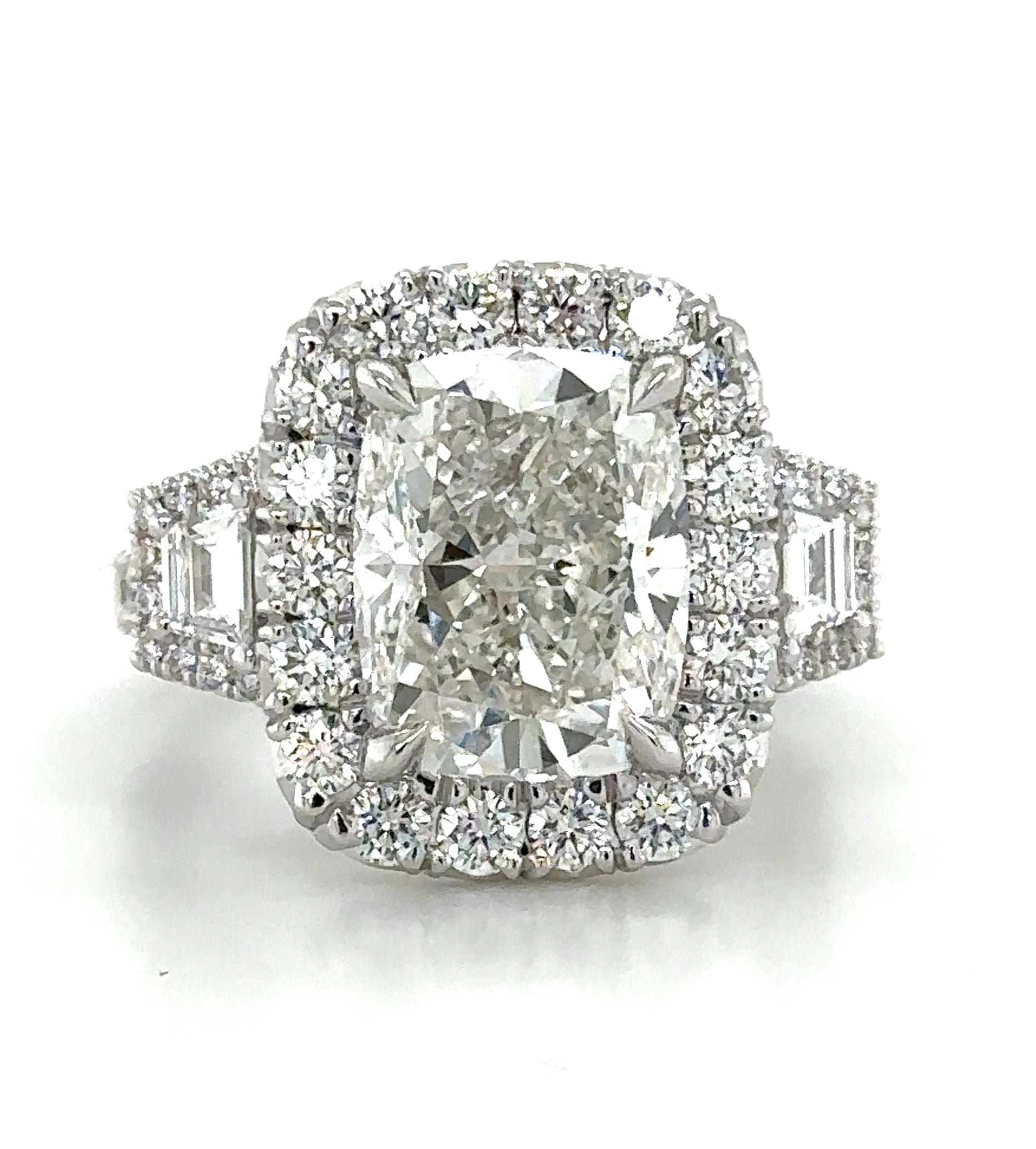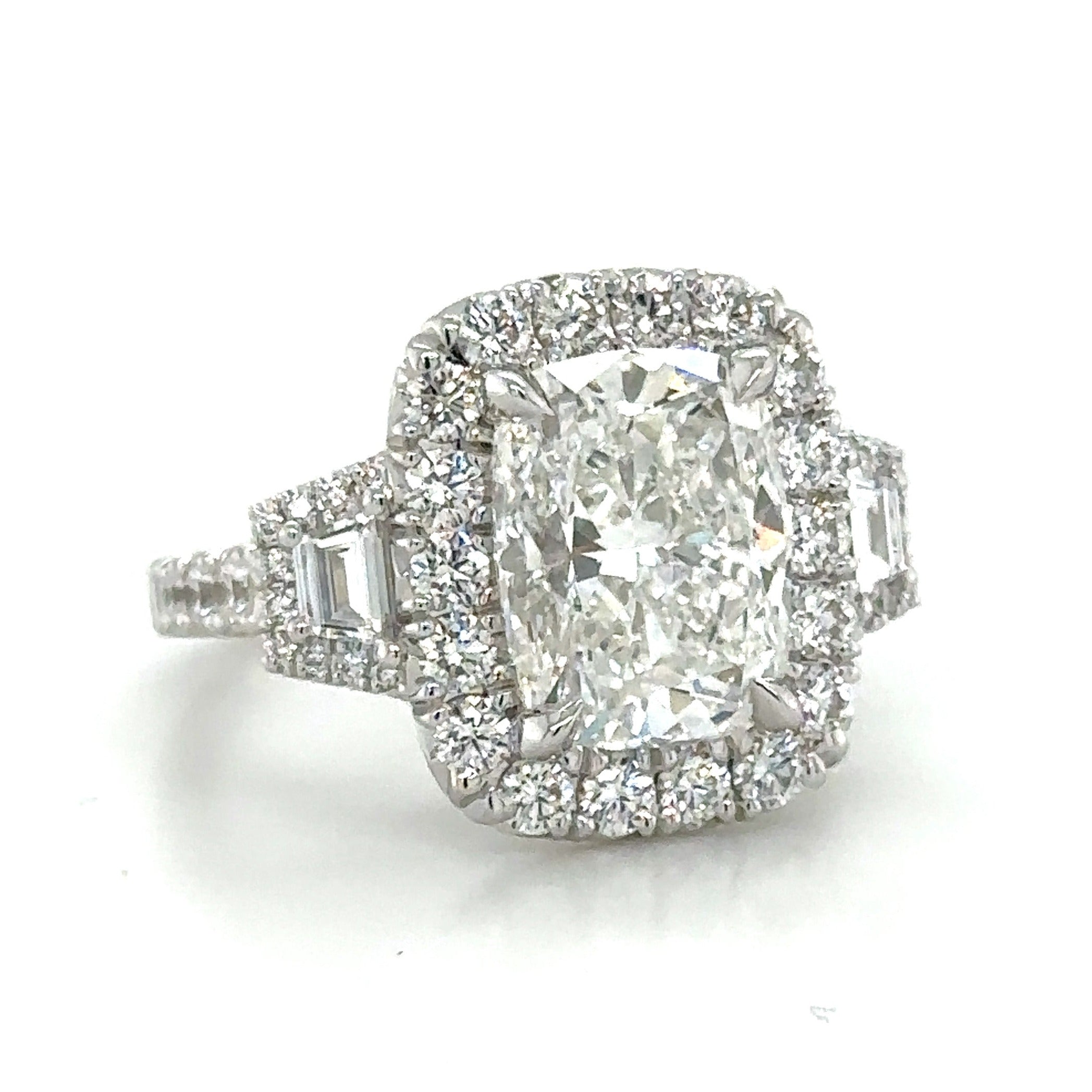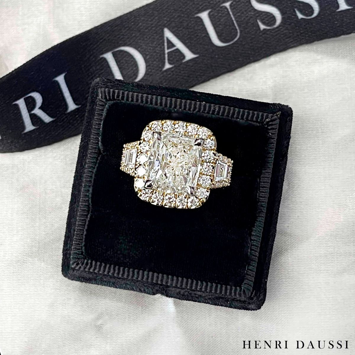 This Henri Daussi 6.58ct t.w. 3 Stone Engagement & Anniversary Ring showcases an cushion cut center diamond with trapezoid side stones, framed in a timeless white gold setting. An exquisite designer piece certified by GIA and accompanied by the designer's signature, the ring is perfect for an unforgettable proposal or celebrating an anniversary.