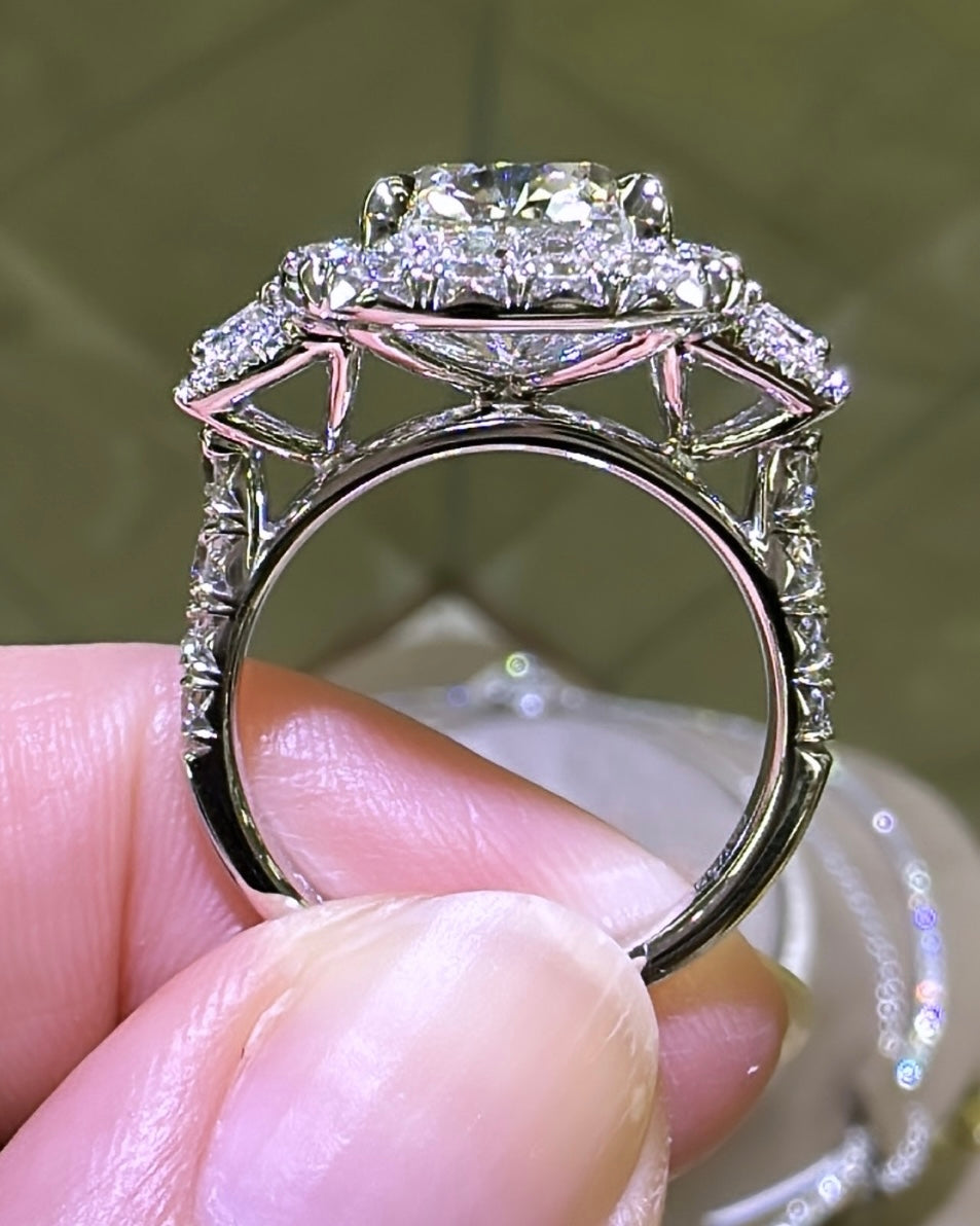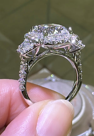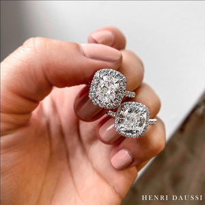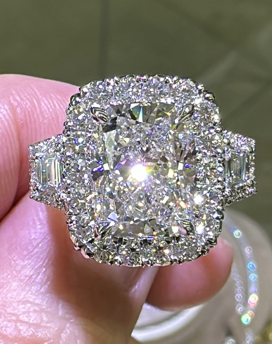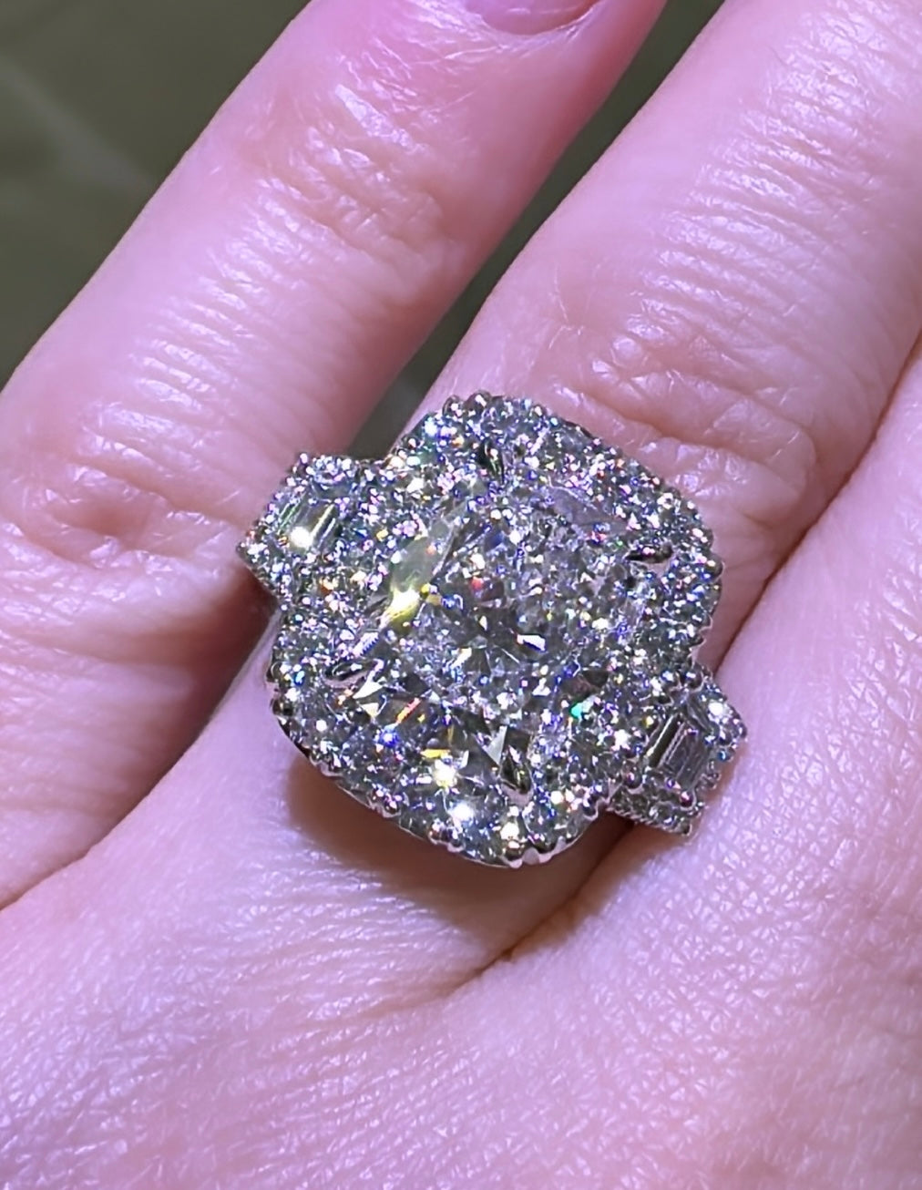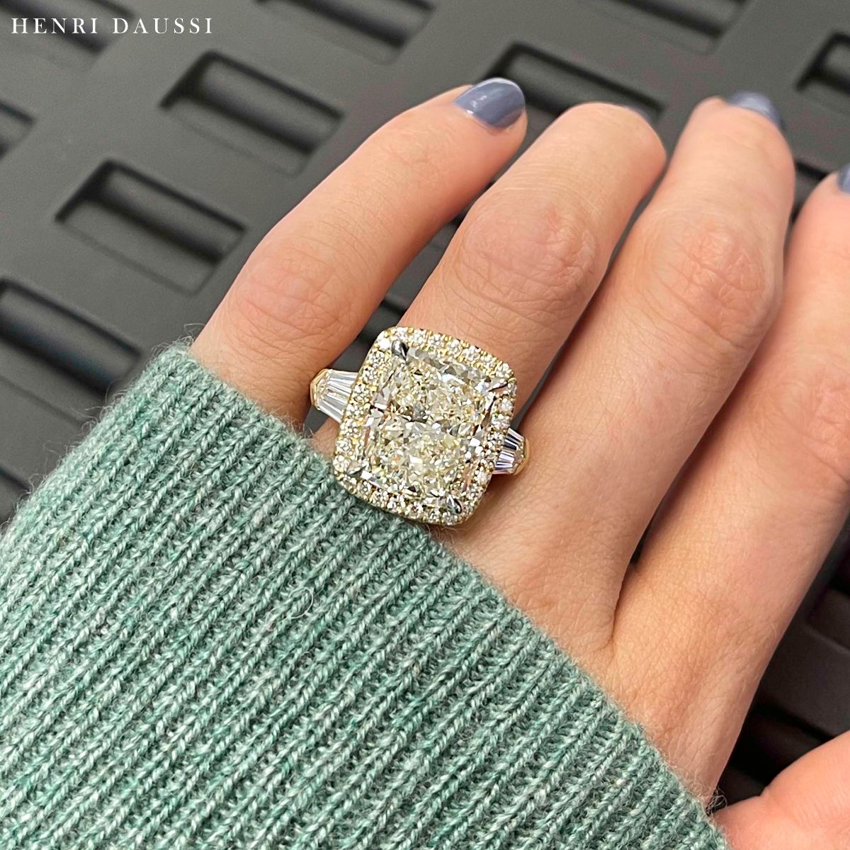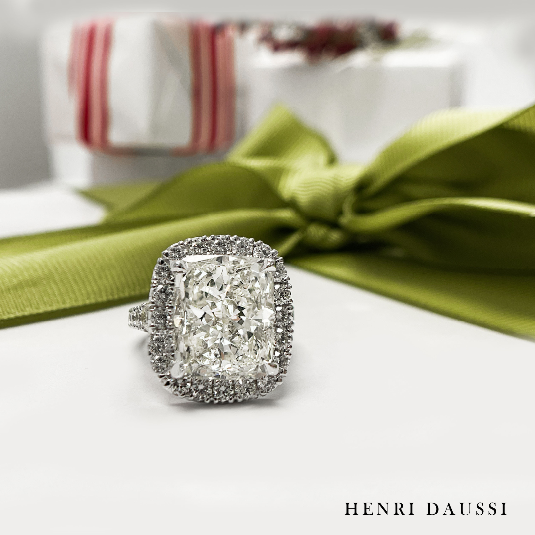This Henri Daussi 6.58ct t.w. 3 Stone Engagement & Anniversary Ring showcases an cushion cut center diamond with trapezoid side stones, framed in a timeless white gold setting. An exquisite designer piece certified by GIA and accompanied by the designer's signature, the ring is perfect for an unforgettable proposal or celebrating an anniversary.