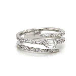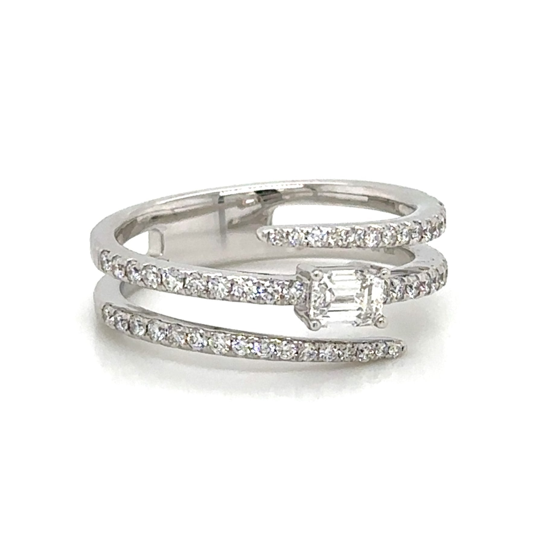 Experience the captivating elegance of our 0.72ct tw triple spiral with emerald-cut diamond wrap ring. This stunning ring features a triple spiral design and a sparkling emerald-cut diamond for a unique and timeless look. Make a statement with this beautiful piece of jewelry that will elevate any outfit.