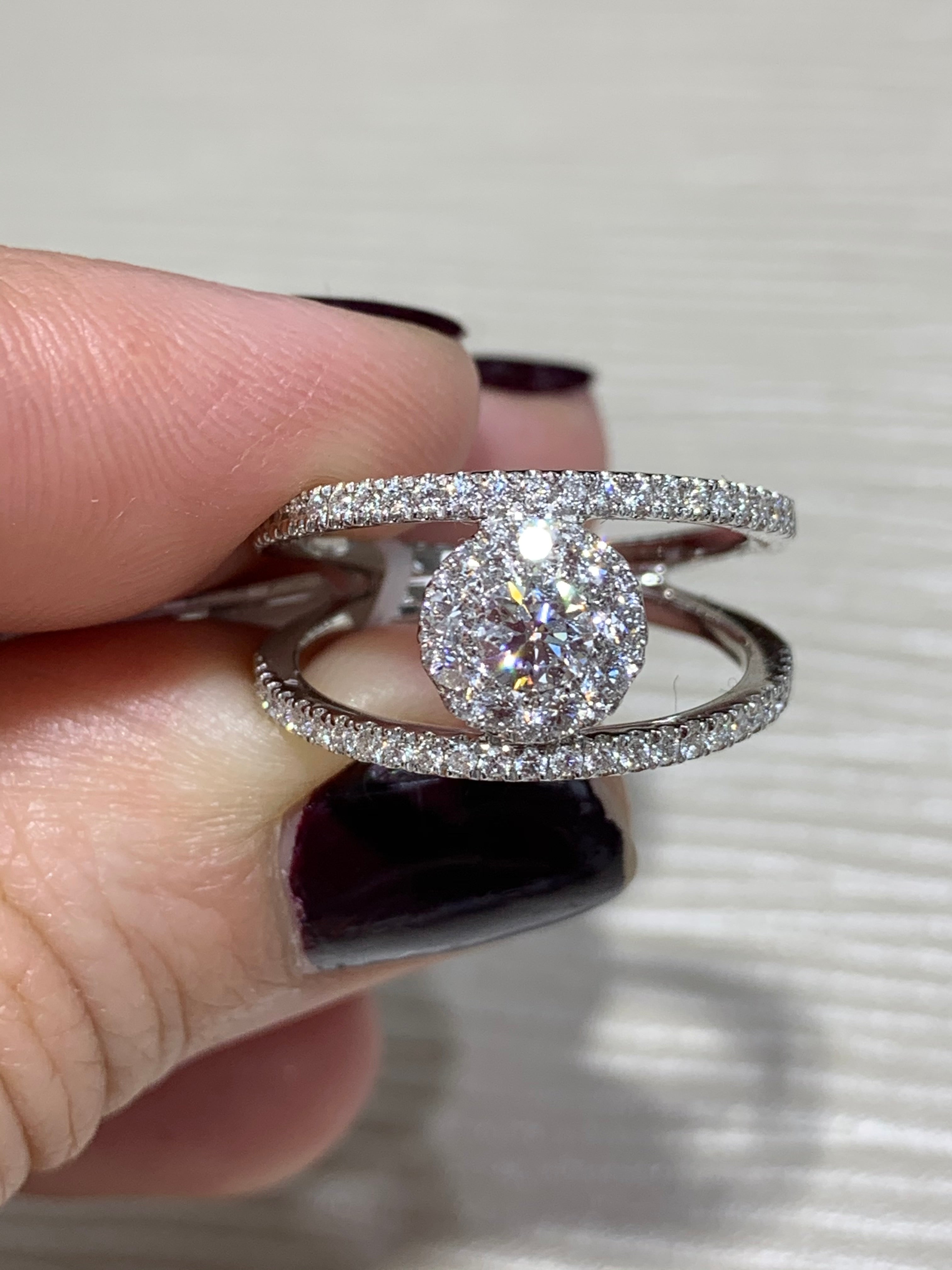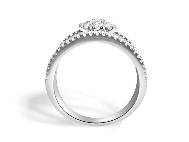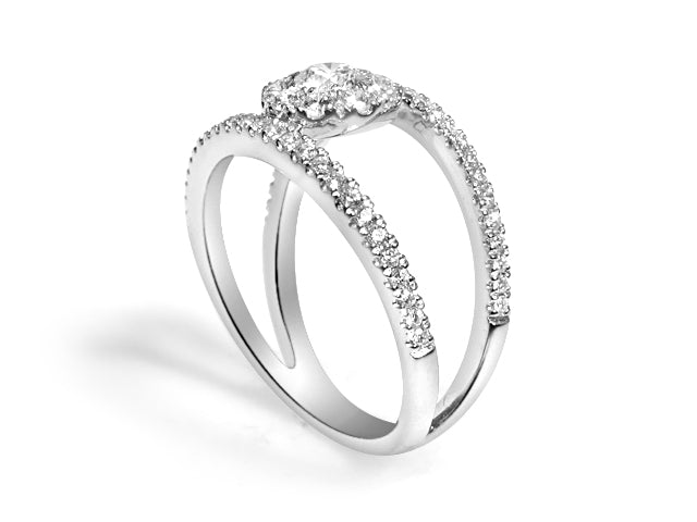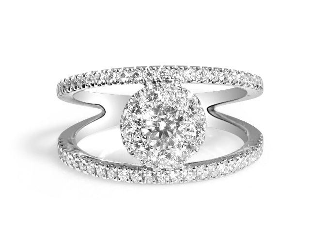 Diamond anniversary ring that can be worn as a fashion ring too. Wear it with jeans or with a sexy black dress diamonds will shine with every move of your hand. Metal: 18KT White Gold Diamond Weight: 0.82ct t.w. Diamond Shapes: Round brilliant Cuts Band Width: 11mm