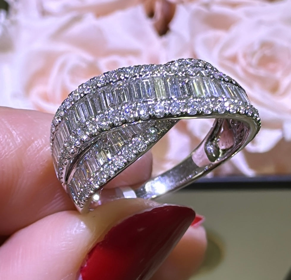 Add sparkle to your everyday look with our 1.37ct tw diamond baguette and round cut criss-cross ring. The unique criss cross design showcases the brilliance of baguette and round cut diamonds, totaling 1.37 carats. Elevate your style and shine bright with this stunning ring!