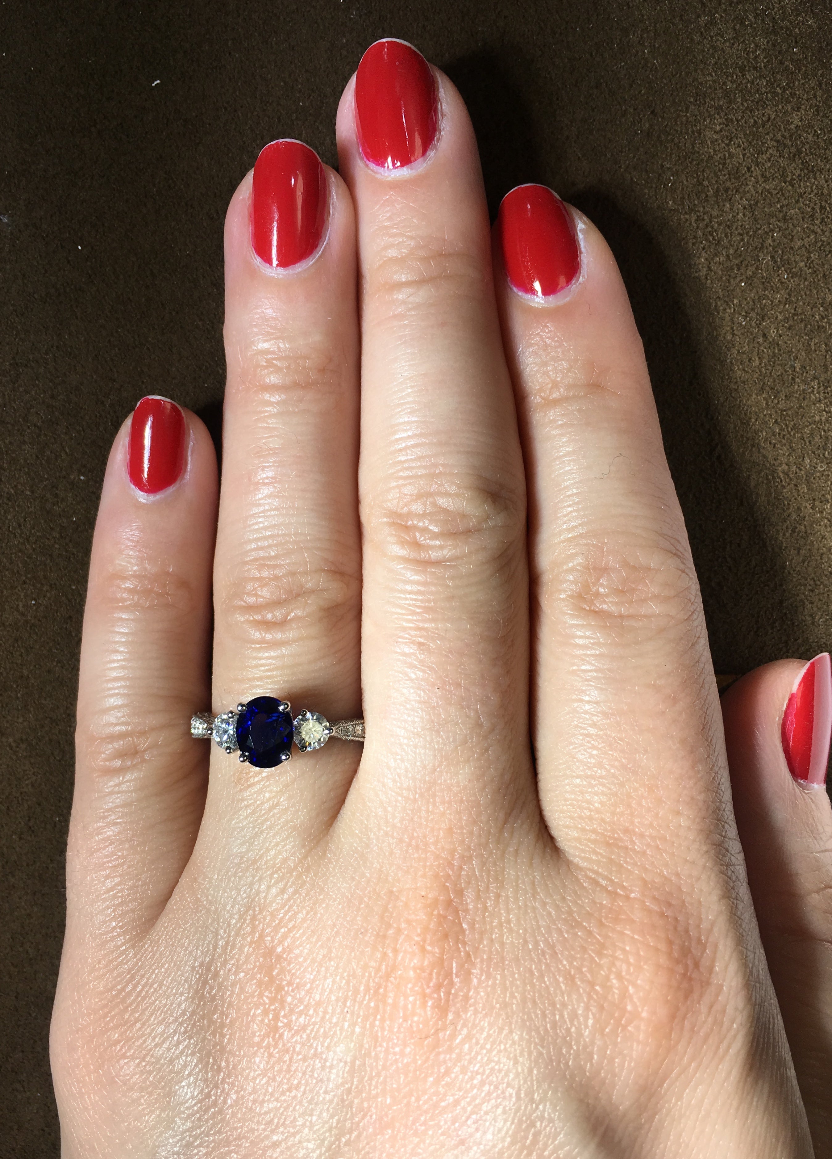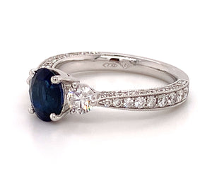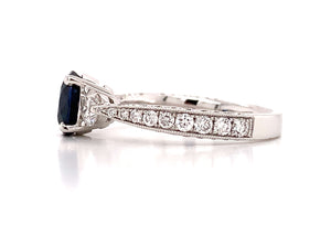 This deep blue sapphire engagement ring is simple yet elegant. The oval shape cut sapphire stone is accented by round brilliant diamonds down the ring shoulders and milgrain touch on the edges. This sapphire ring holds a total carat weight of 1.41ctw carats and is set in 18kt White Gold that is rhodium finished to ensure that it will never tarnish.