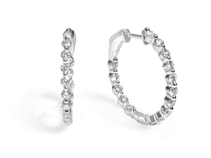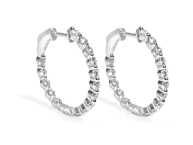 These round diamond hoop earrings have been given a stylish touch with elegant round cut diamonds placed inside and out. 18KT white gold hoop earrings are set with 1.56 carats in round diamonds . Every woman can always use a pair of classic diamond hoop earrings to add to their wardrobe. Accessorize with these hoop earrings for fun and casual looks, or formal occasions where you want focus to be on your outfit.