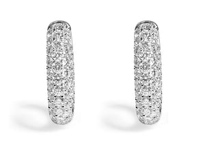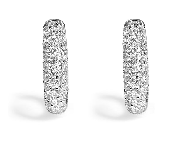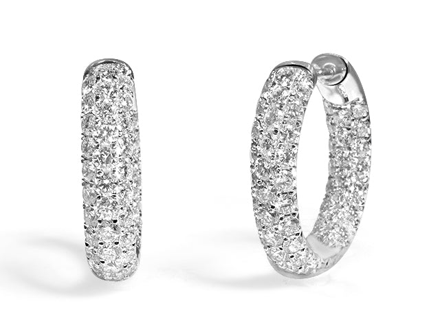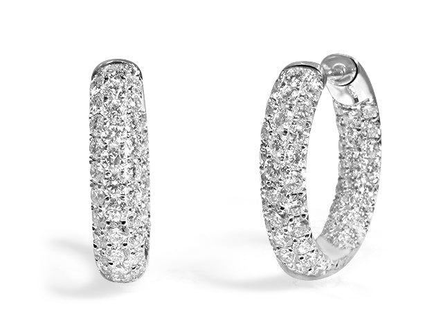 High quality full cut round diamonds are set in 18k White Gold. The large size is already an attention gather, but the stones add a glamour to it that you must see in person. Feel just like a Hollywood starlet when you accessorize with these diamond hoop earrings. You will be the envy of the room because these look just stunning! 3.17carats in diamonds will take your breath away every time you put them on.