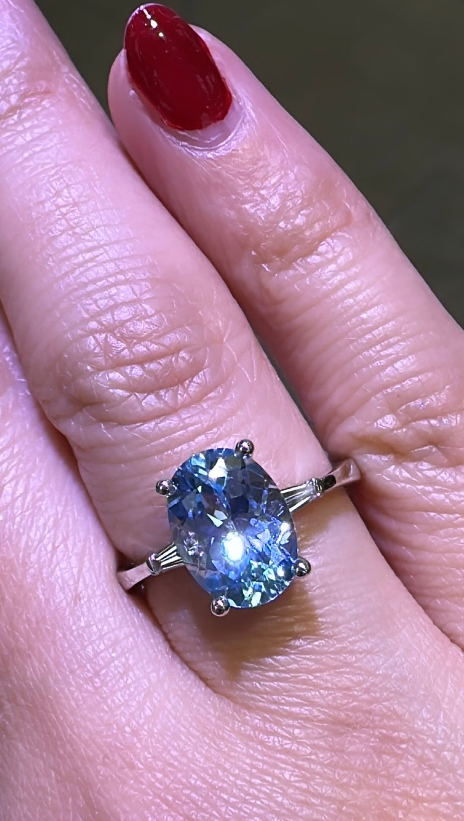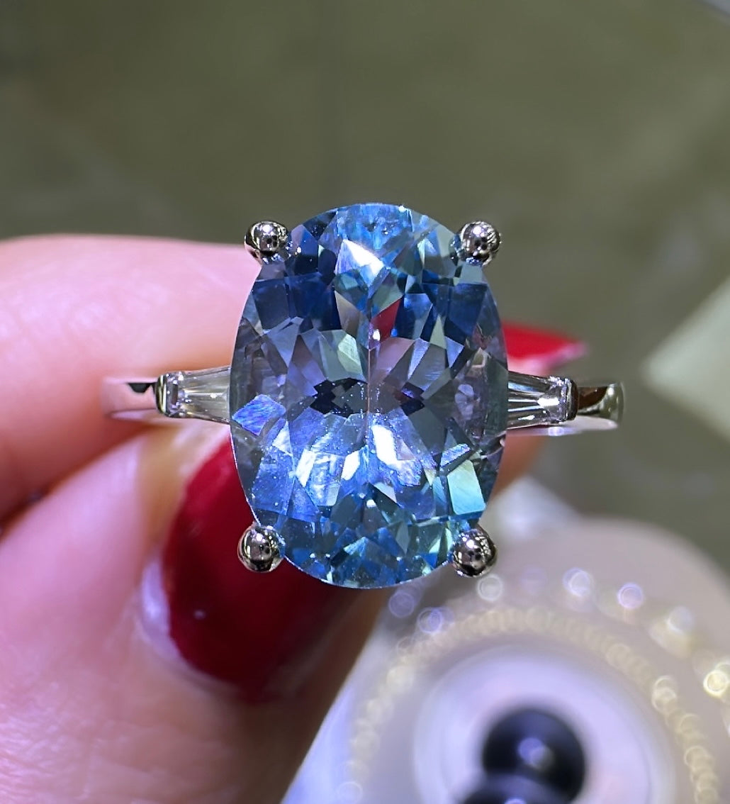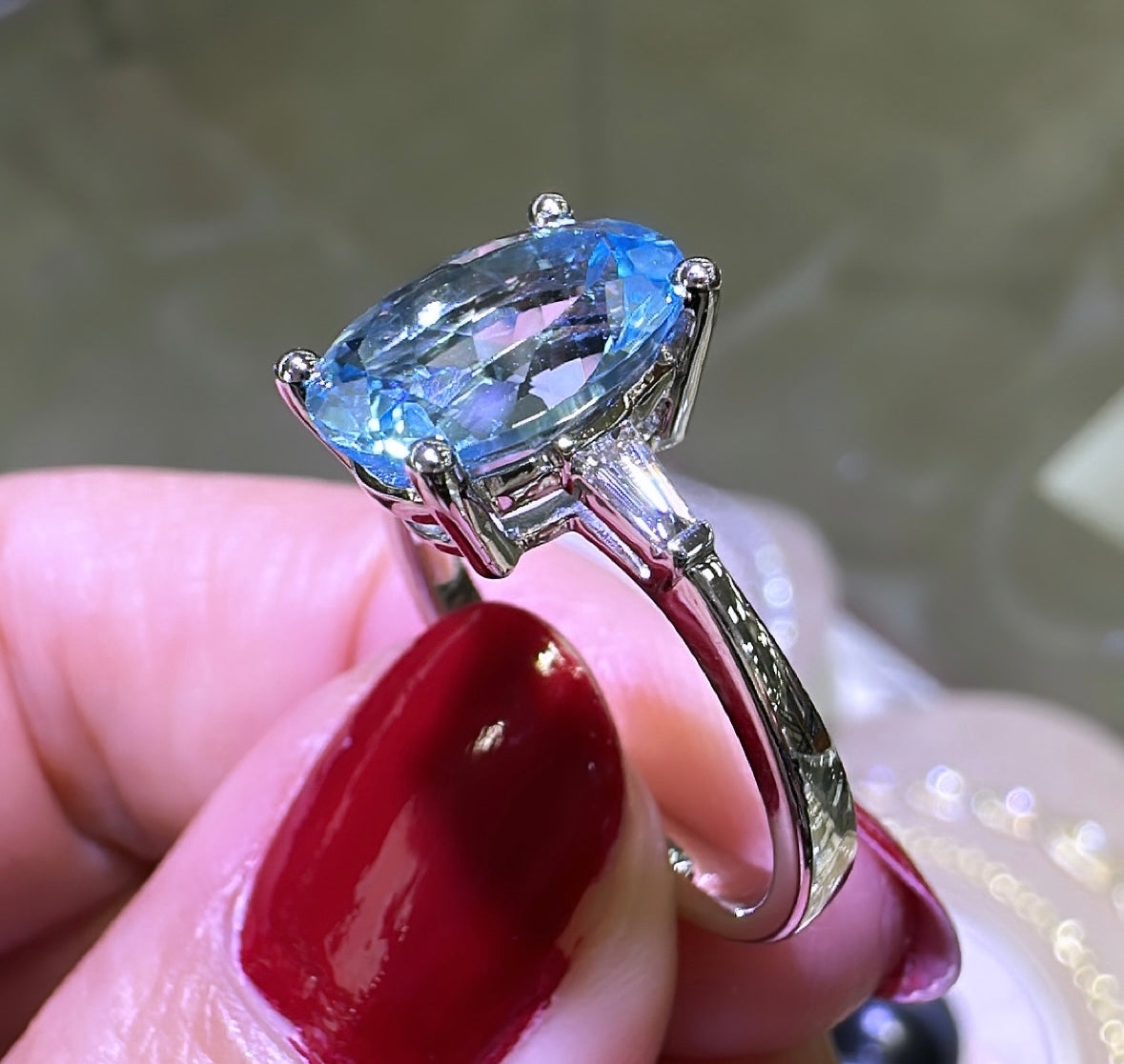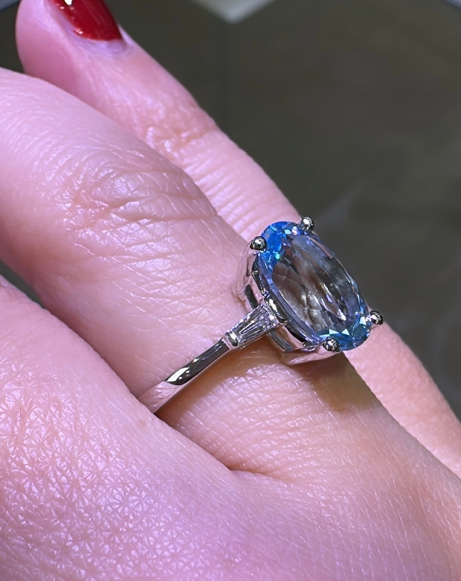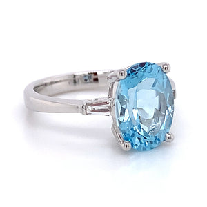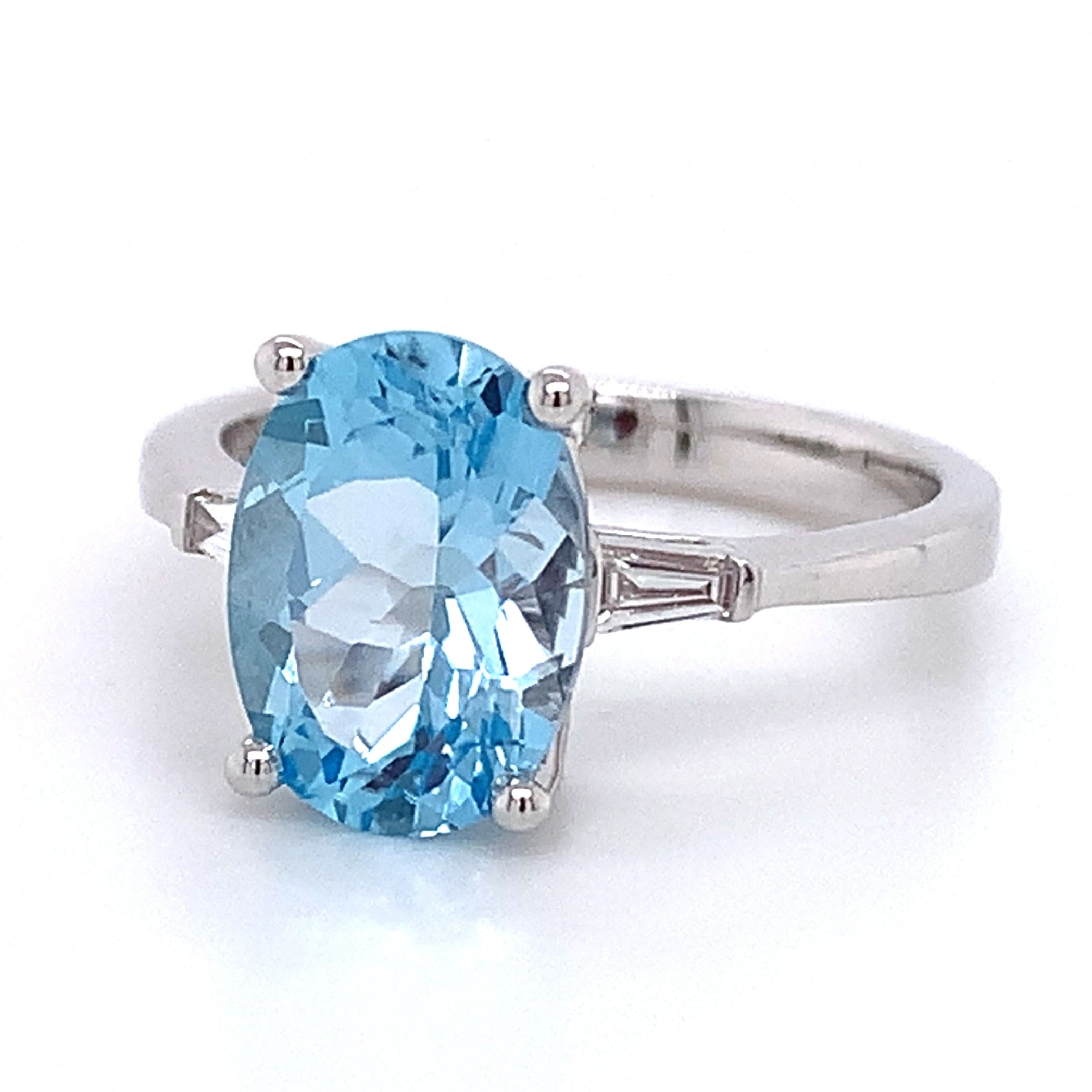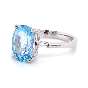 This stunning piece features a beautiful 3.53carat light blue topaz oval-cut set in a striking, diamond-studded setting. Perfect for making a bold statement, it will instantly become the showstopper of any outfit. Treat yourself to style and class and make heads turn with this one-of-a-kind piece.