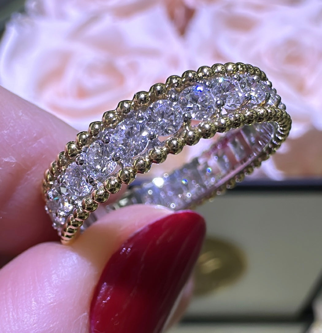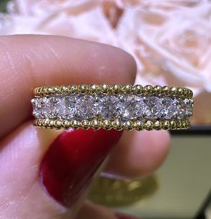 Elevate your style with our beaded three row diamond two tone ring! This stunning piece features three rows of sparkling diamonds totaling 1.34ct tw set in a unique two tone design. With its intricate beaded details and luxurious diamonds, this ring is sure to make a statement and catch everyone's eye. Make it a part of your jewelry collection and dazzle day or night!