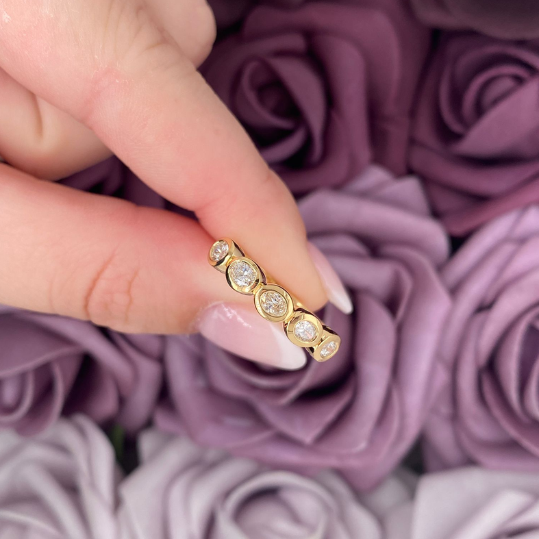 Experience timeless elegance with our designer oval-cut bezel diamond ring. Featuring a stunning 2.49ct tw, this horizontal partway set eternity band is crafted with utmost precision for a truly luxurious feel. Elevate any outfit with this statement piece, perfect for any occasion.