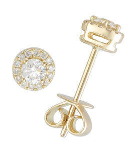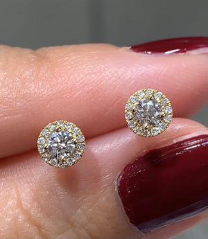 These stud like earrings feature beautiful round white diamonds. Center diamonds are surrounded by smaller round brilliant cuts which gives these studs a much bigger look for half the price. Crafted from lustrous 18kt yellow gold and 6mm in width you will find yourself wearing these every day.