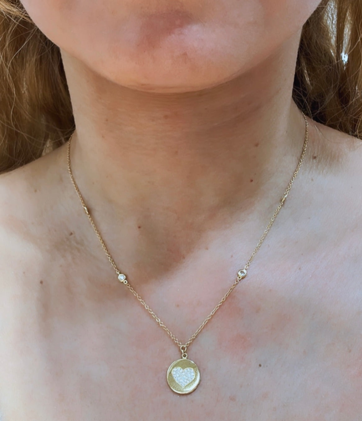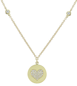 18K yellow gold heart shape madalion pave pendant necklace featuring 66 round shape diamond weighting 0.36ct tw. Chain with bezel set diamonds included.