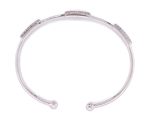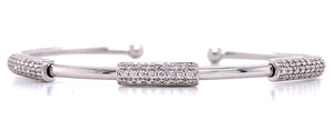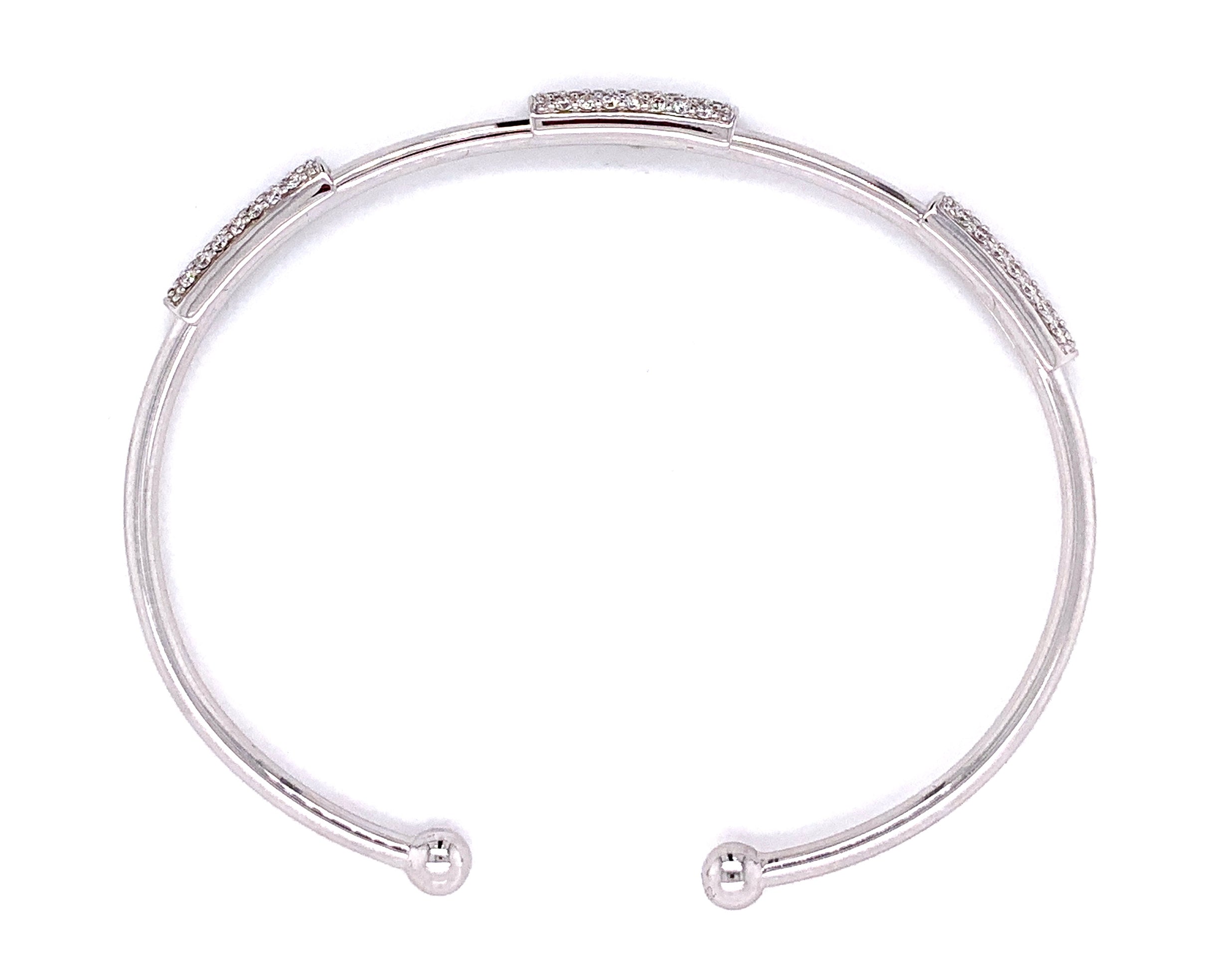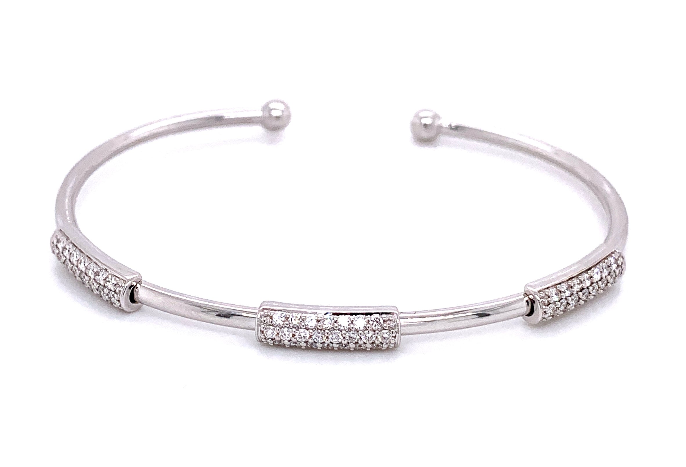 Bangles are great for stacking.This 18kt white gold bracelet is simply covered in 3 station pave round diamonds... Metal: 18kt White Gold Diamond Weight: 0.62ctw Diamond Shape: 66 Round