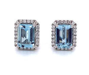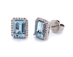 Emerald cut Aquamarine and Diamond Stud Earrings
