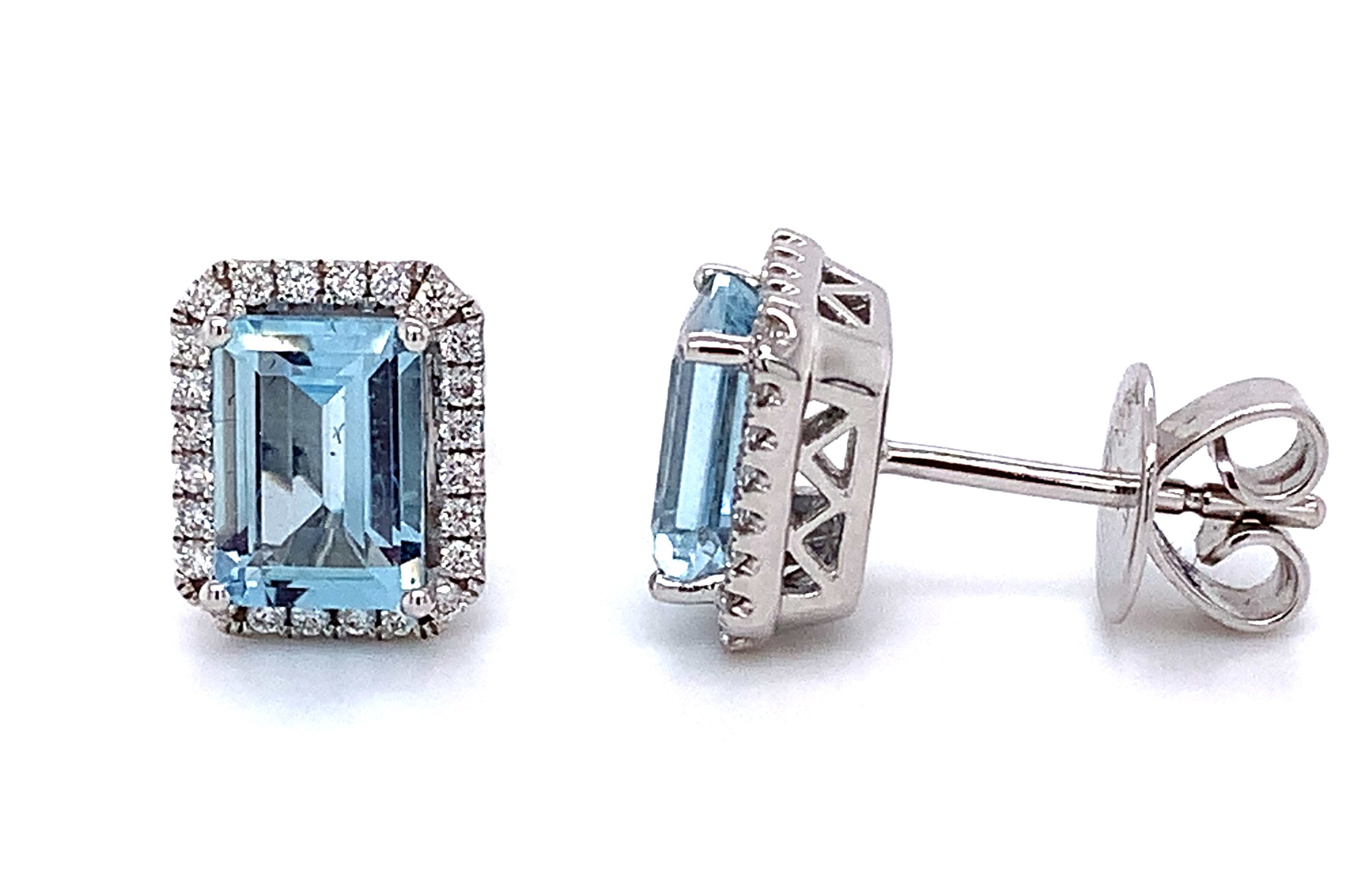 Emerald cut aquamarine and diamond stud earrings are a thing of beauty made in 18KT white gold and set with round diamonds these earrings are versatile and elegant. Stud earrings are a must-have for every women's jewelry collection, so we think that you should snag a set for yourself, as well as a pair for a loved one in your life. They make for a wonderful birthstone gift-giving option.