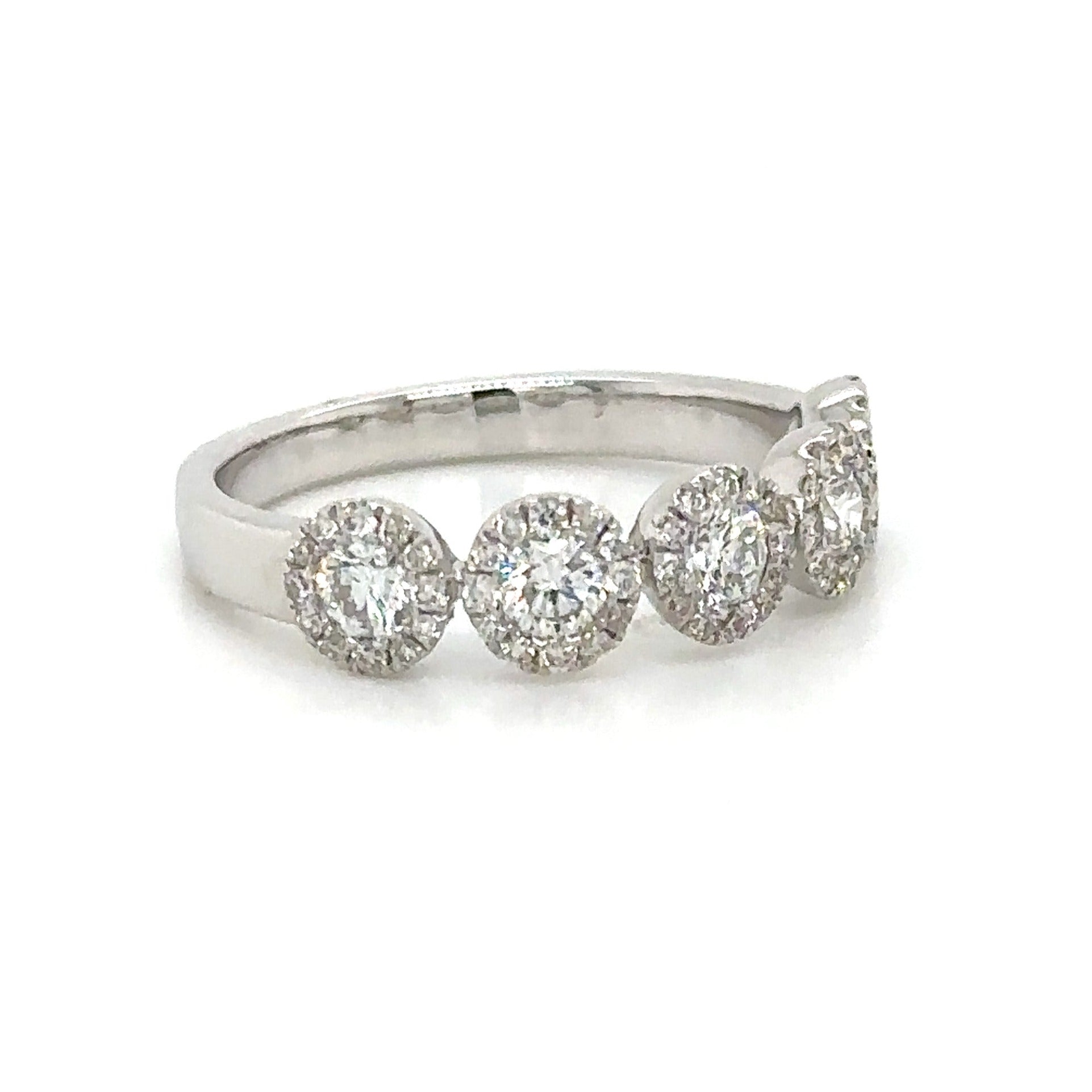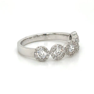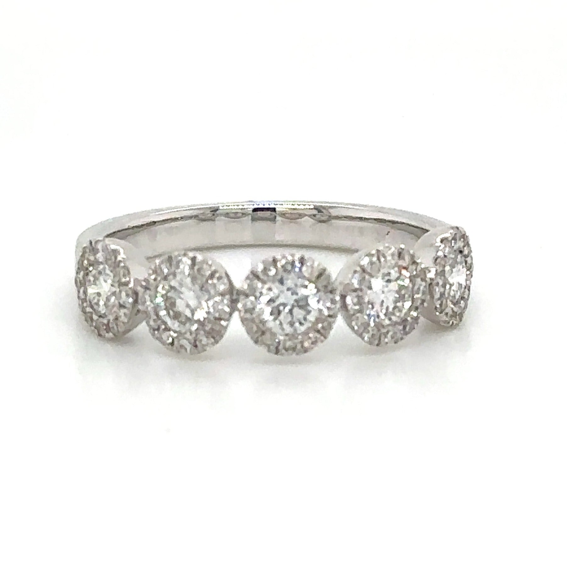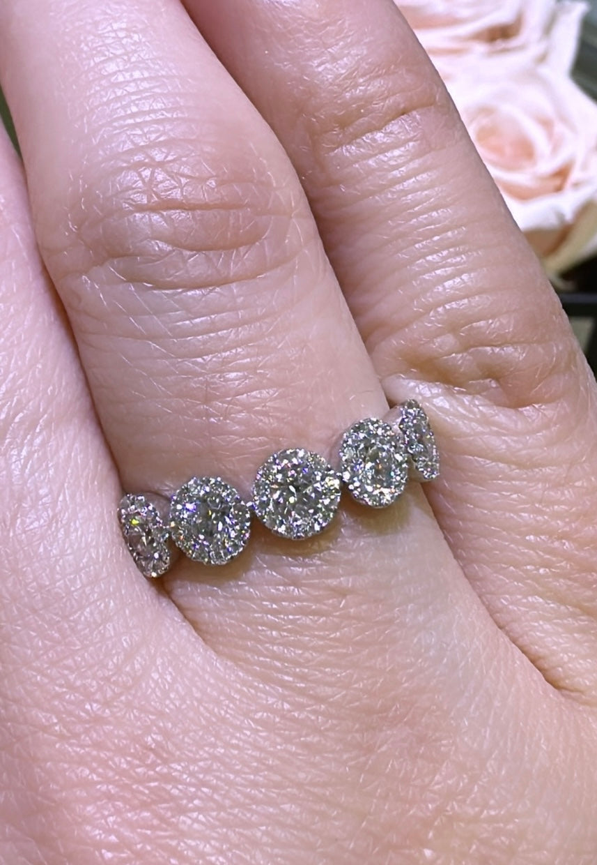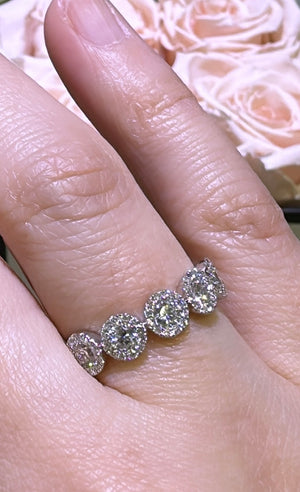 Indulge in pure luxury with our five stone round-cut with halo diamond ring. Featuring a stunning 0.83 carat total weight, this ring exudes elegance and sophistication. The sparkling diamonds are perfectly cut to catch the light, adding a touch of glam to any outfit. Make a statement with this timeless piece.