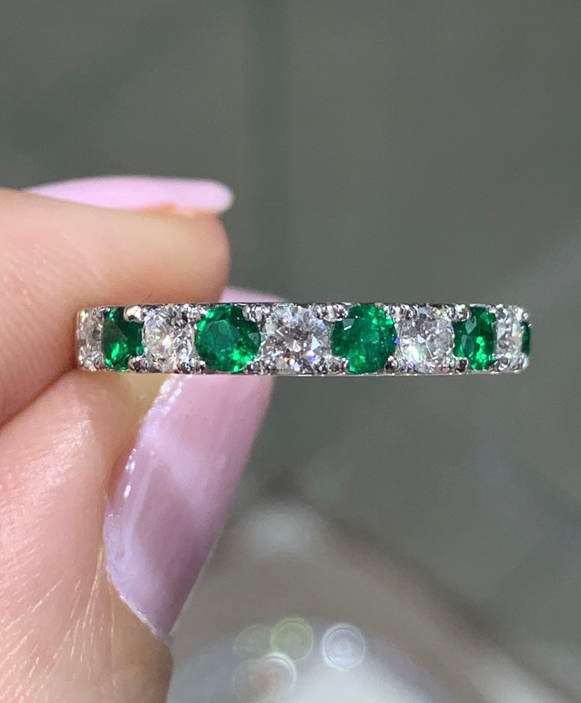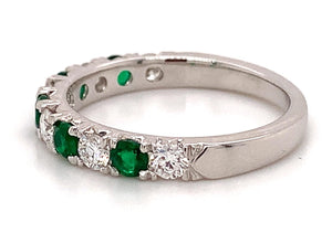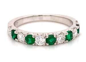 Alternating bands are fun and flirty! You can pretend it's a right hand ring or wear it as a wedding band - you decide one thing we know you will love the shine and dazzle of white diamonds and green emeralds.