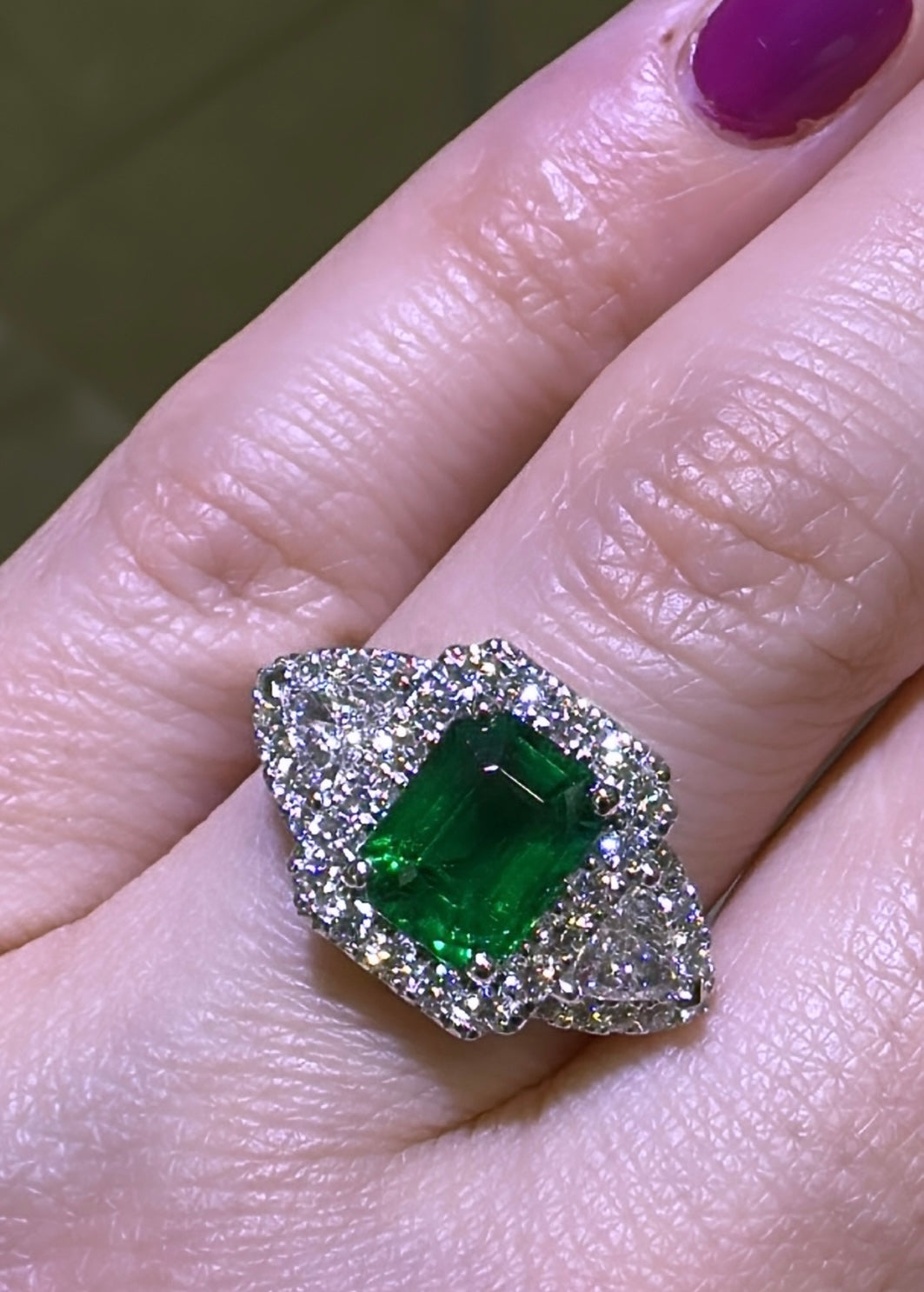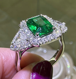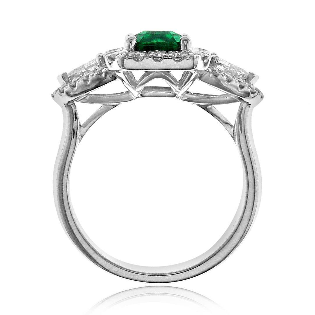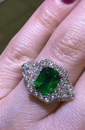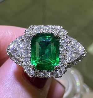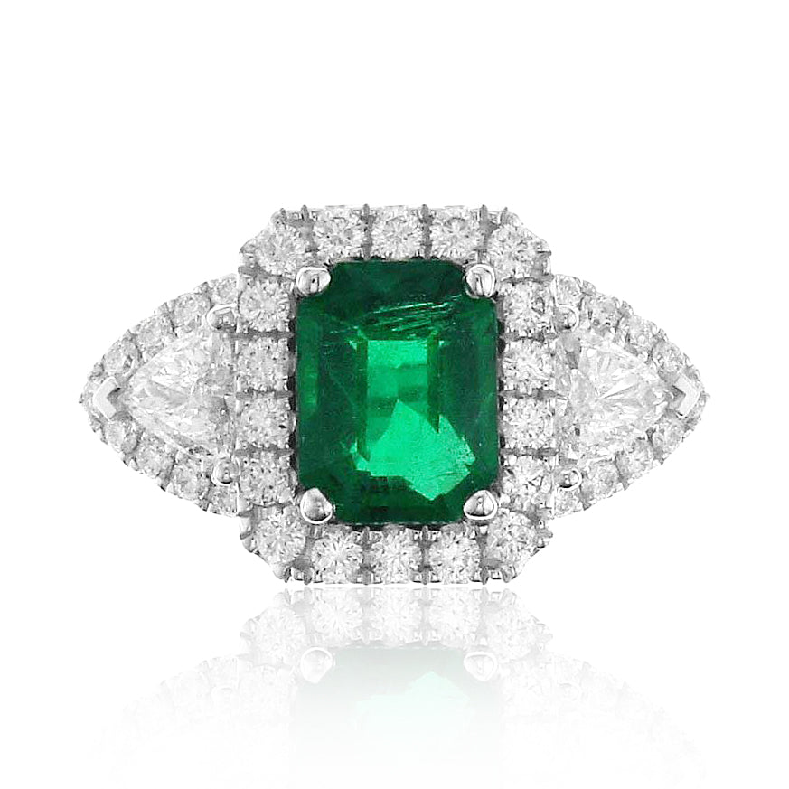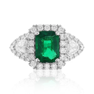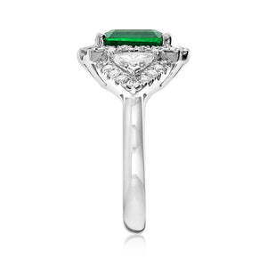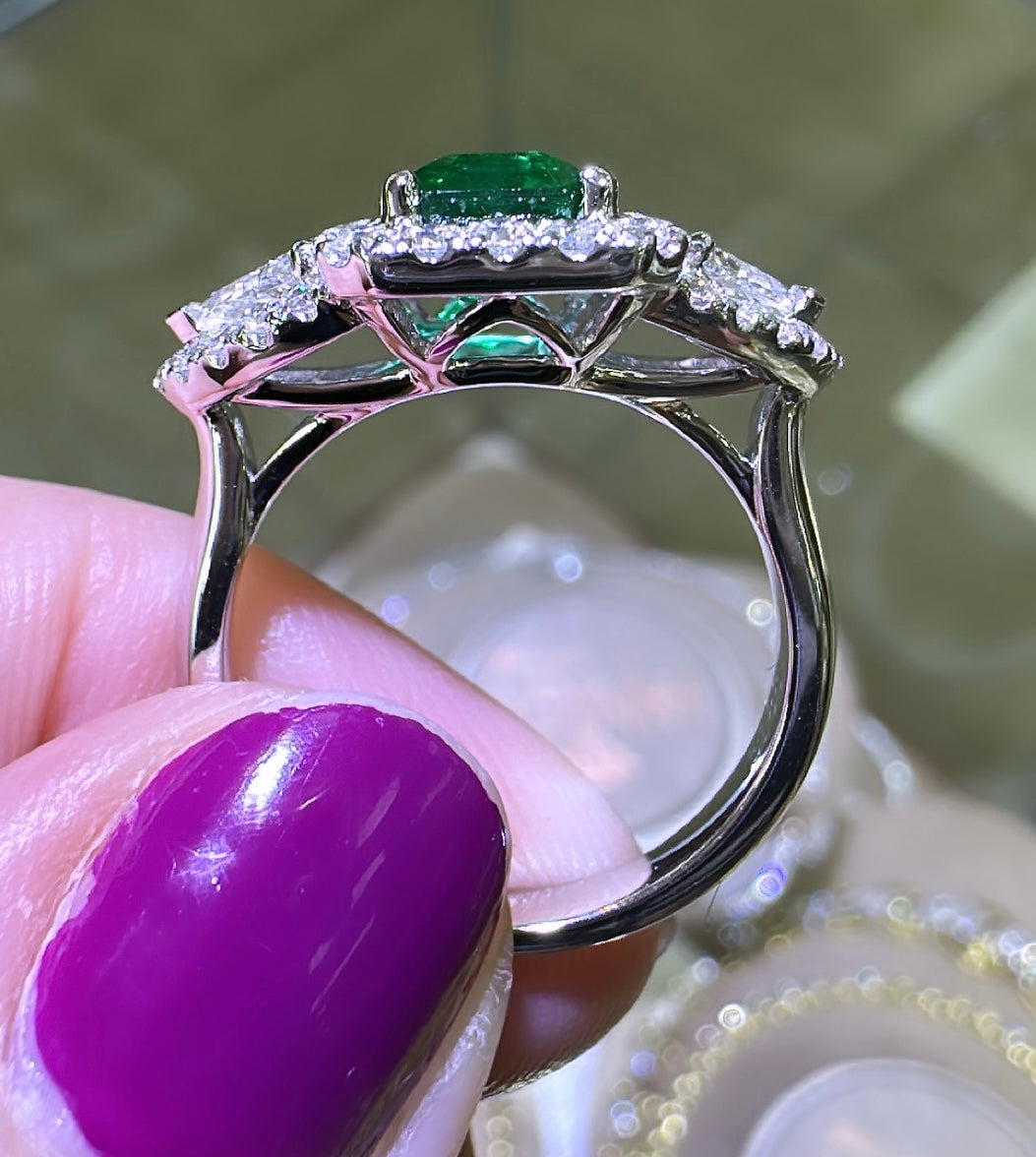 An Emerald statement cocktail ring is a great way to create an elegant, glamorous look. The center stone is emerald-cut in shape and has gorgeous facets. For extra sparkle, it has been framed by 0.42ct tw trillion side and 36 round brilliant-cut diamonds 0.50ct tw forming a beautiful halo around. Metal: 18K White Gold Diamond Weight : 2 Trillion 0.42ct tw, 36 Round-cuts 0.50ct tw GRS Certified: GRS2022-092156 / Zambian Emerald Weight: 1.88carat Width: 13mm x 20mm