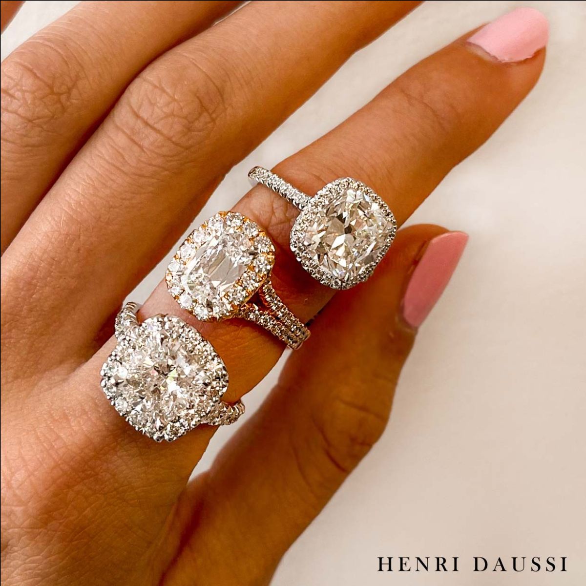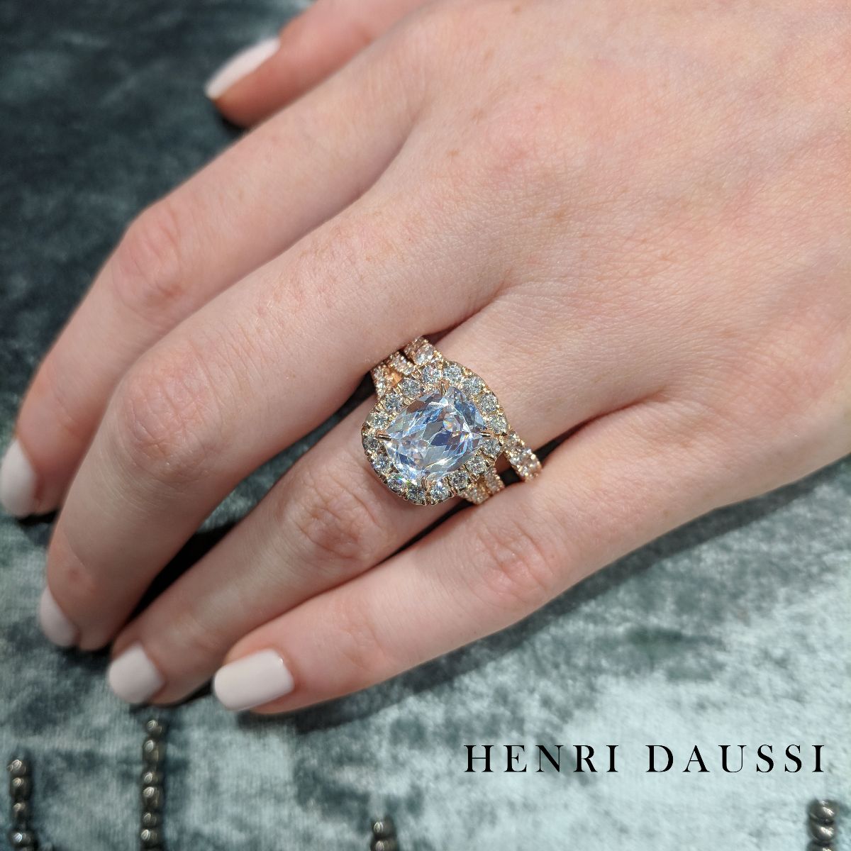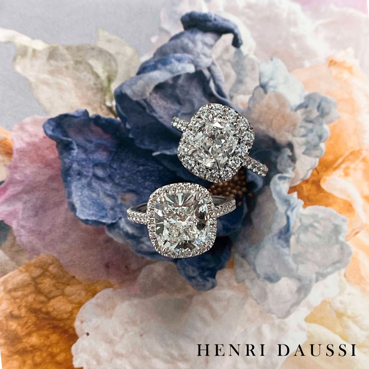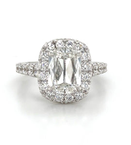 This Henri Daussi diamond ring is a sophisticated statement of luxury. Crafted with a signature cushion cut, each diamond is hand-selected by the renowned designer himself. GIA Certified 2.00carat center diamond featuring a pave halo and totaling 3.15carats, this exquisite piece of jewelry will be cherished for many years to come.