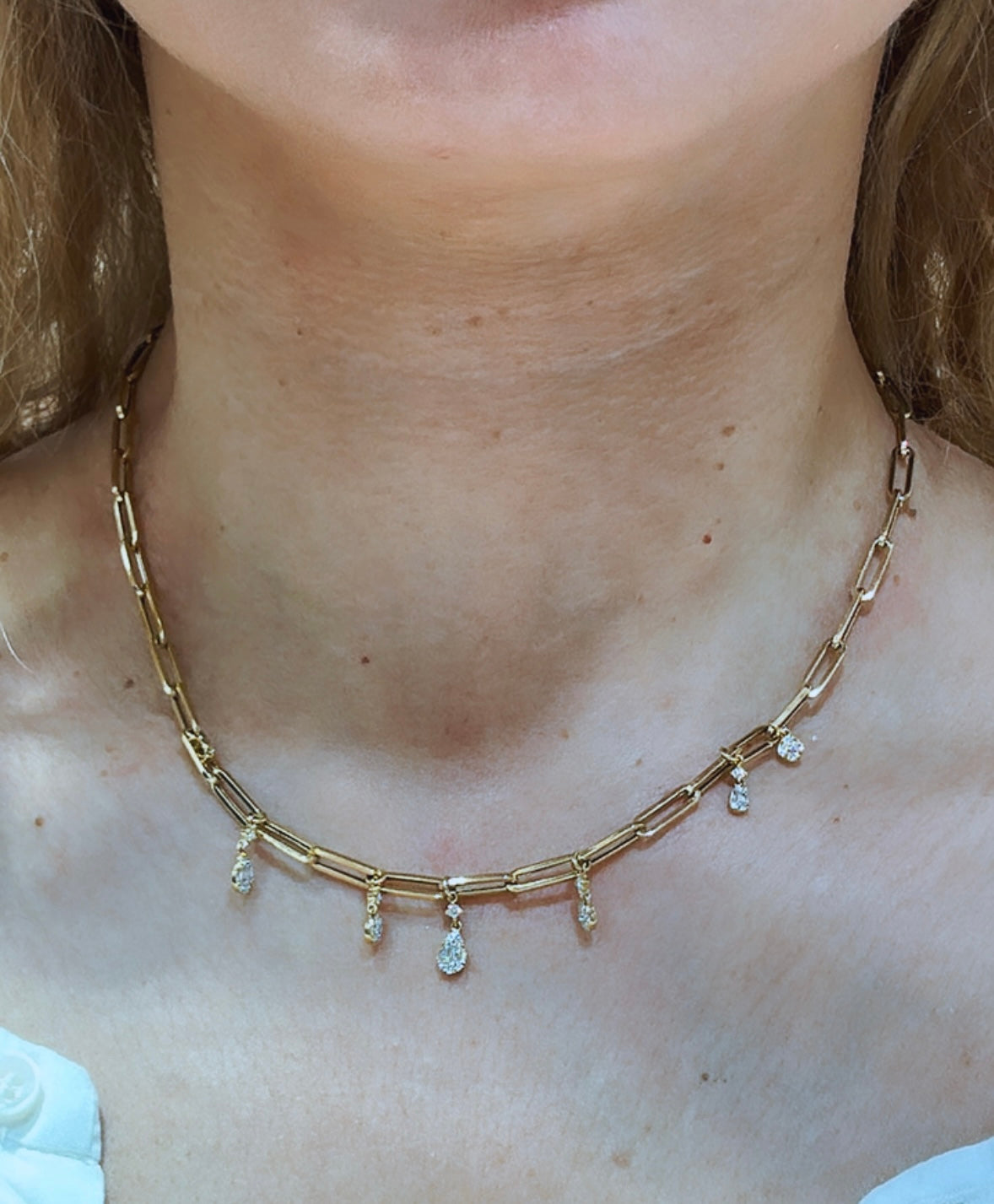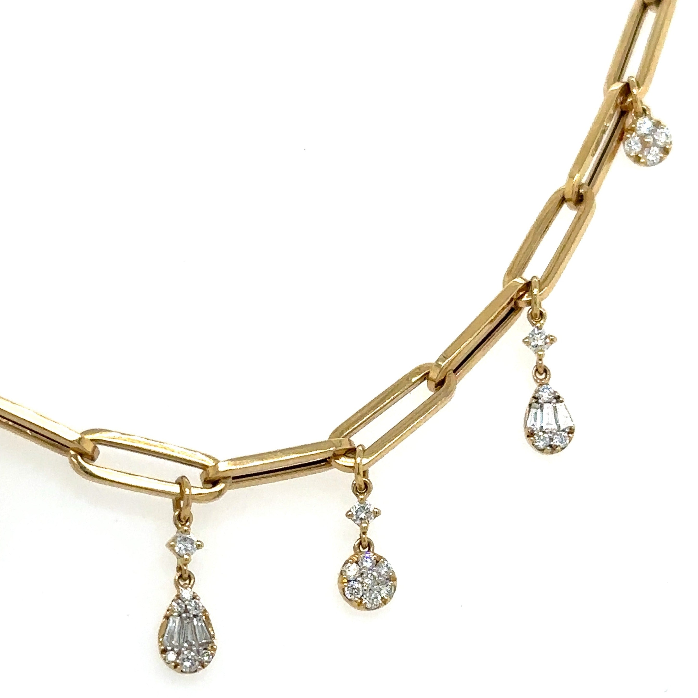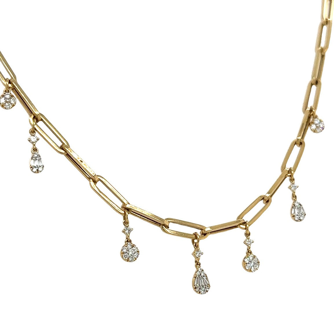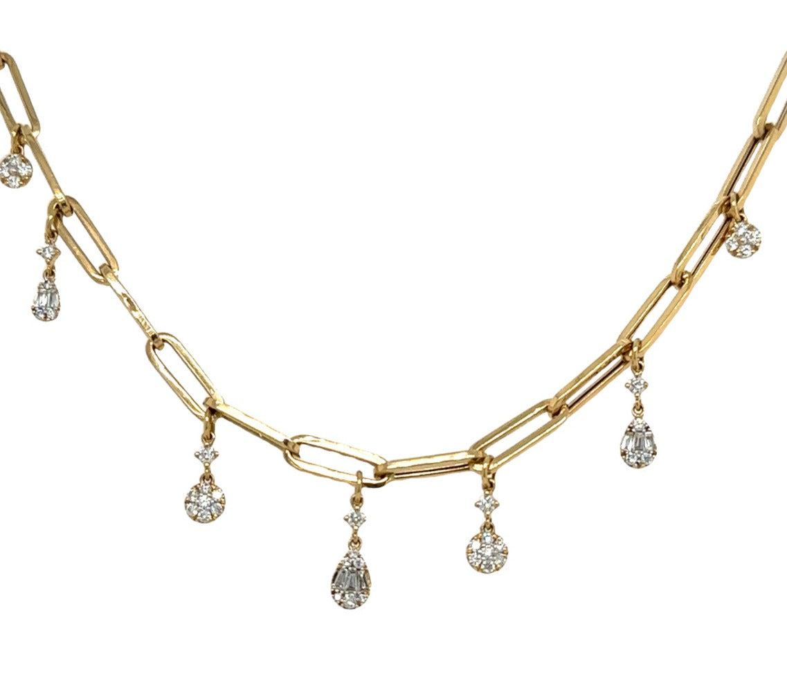 Indulge in the dazzle and delight of this ladies paper link diamond necklace. The mix-shape design adds a unique touch, while the dangling style brings playful movement to your neckline. Perfect for a night out or to add a touch of glamour to any outfit.