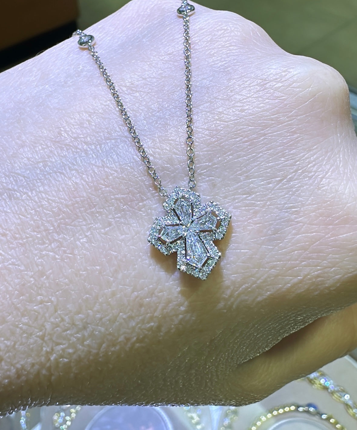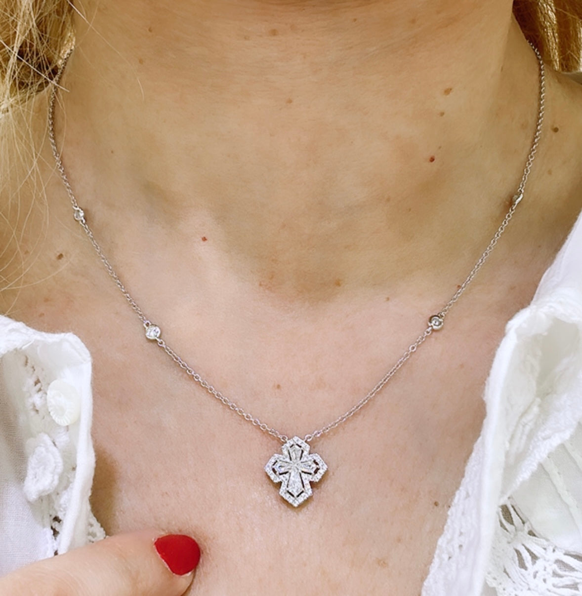 Elevate your style with our trapezoid diamond cross with halo 0.71ct tw pendant necklace. This unique pendant features a trapezoid diamond cross surrounded by a sparkling halo, adding both elegance and significance to your look. Show your faith while making a statement with this stunning necklace.