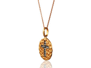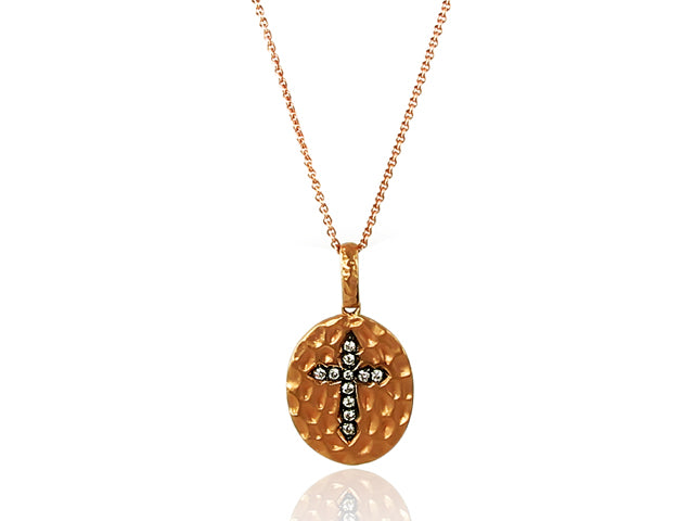 Elegantly crafted in 18kt rose gold, our diamond cross pendant is an ideal present for yourself or a loved one. 0.12ct t.w. of diamonds are arranged in a classic cross design that's inlaid on a gold hammered oval plaque. Metal: 18kt Rose Gold Diamond Weight: 0.12ctw Diamond Shape: Round Pendant Length: 25mm Chain Length: 16-inch