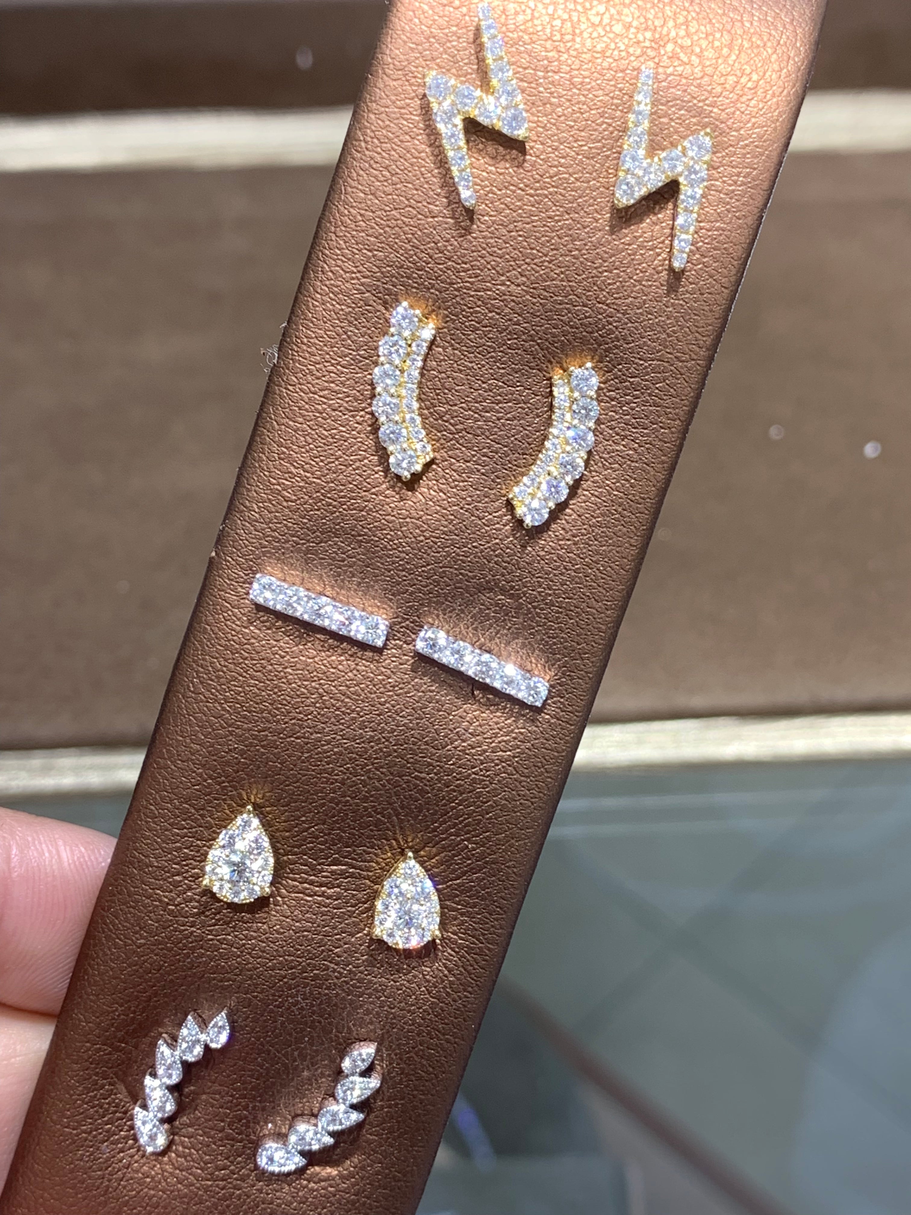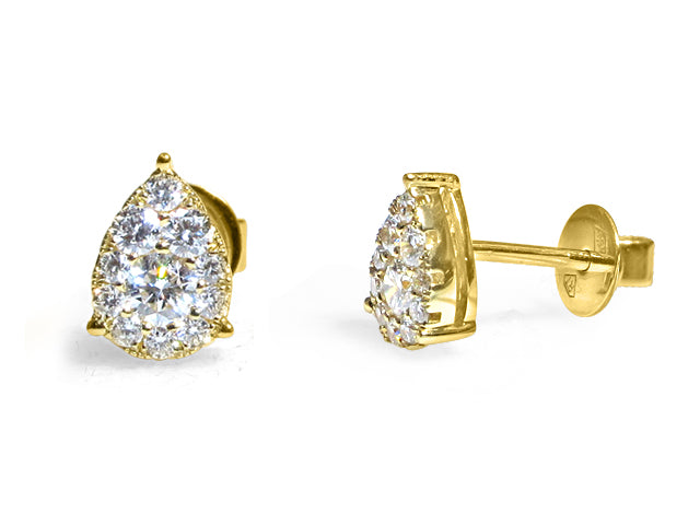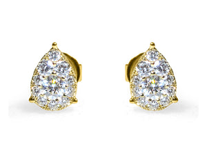 Designed to have the illusion of a larger stone, these exquisite diamond cluster stud pear shape earrings are a modern twist on the traditional diamond stud earrings. Metal: 18K Yellow Gold Diamond Weight: (22) Round Brilliant 0.39ct tw Backing: Push Backs