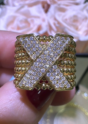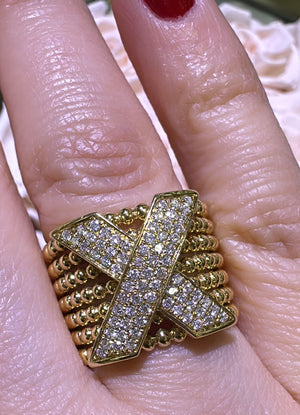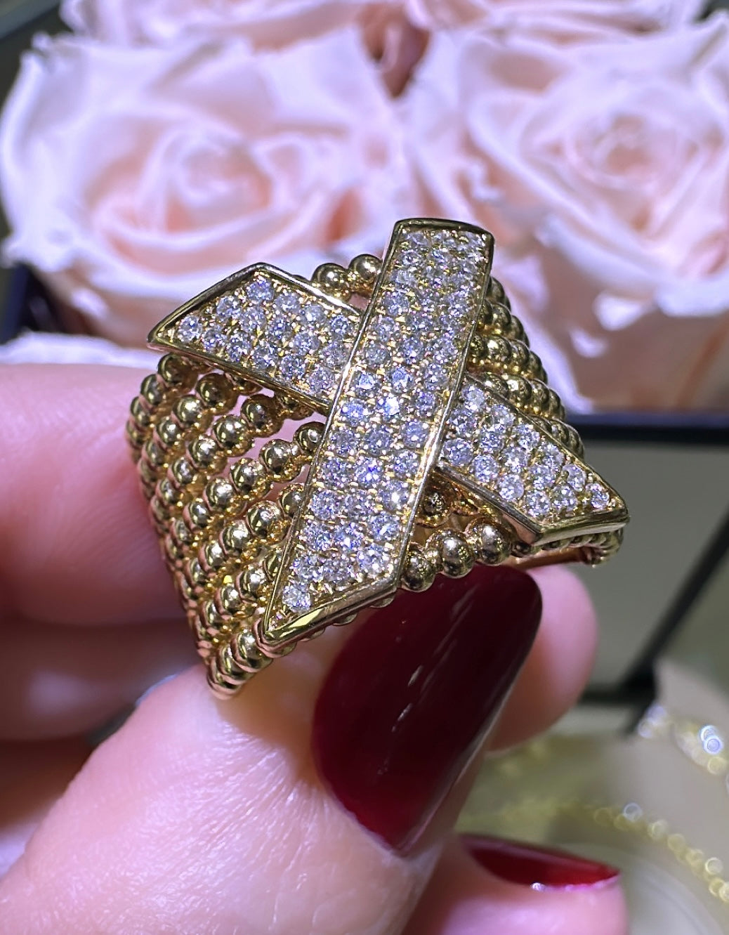 Indulge in luxury with our 0.43ct t.w. seven row beaded gold and diamond statement Ring. Featuring 0.43 carats of sparkling diamonds in a unique seven row beaded design, this ring is a true showstopper. Elevate any outfit with its exquisite elegance and dazzle in the light.