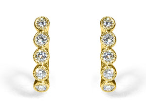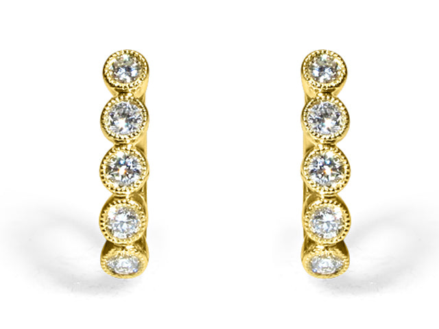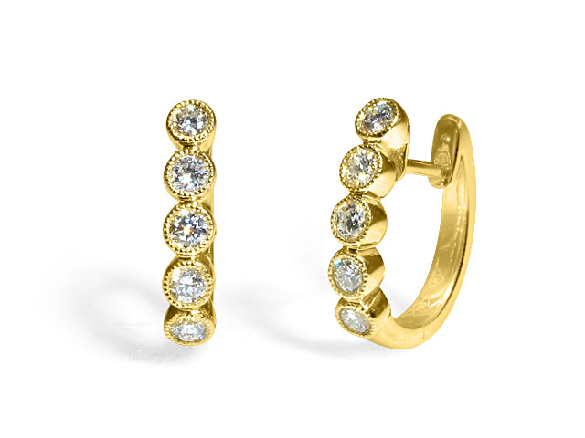 Fabulous petite diamond hoop earrings are inlaid with a total of 0.43carats diamonds. They are fashion forward, but wonderful for any special occasion that you might have coming up. Metal: 18K Yellow Gold Diamond Weight: 0.43ctw Diamond Shape: 10 Round Brilliant Hoop Length: 15mm