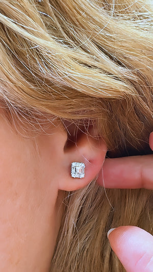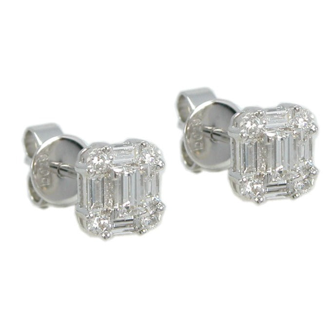 This design is so elegant she will never take these off her ears. Invisible set baguette and round diamonds makes them so unique and beautiful. Great for everyday wear. Metal: 18K White Gold Diamond Weight: 0.53ct tw Diamond Shapes: 8 Rounds/ 10 Baguette Measurements: 7mm wide X 7mm length Backing: Push Back