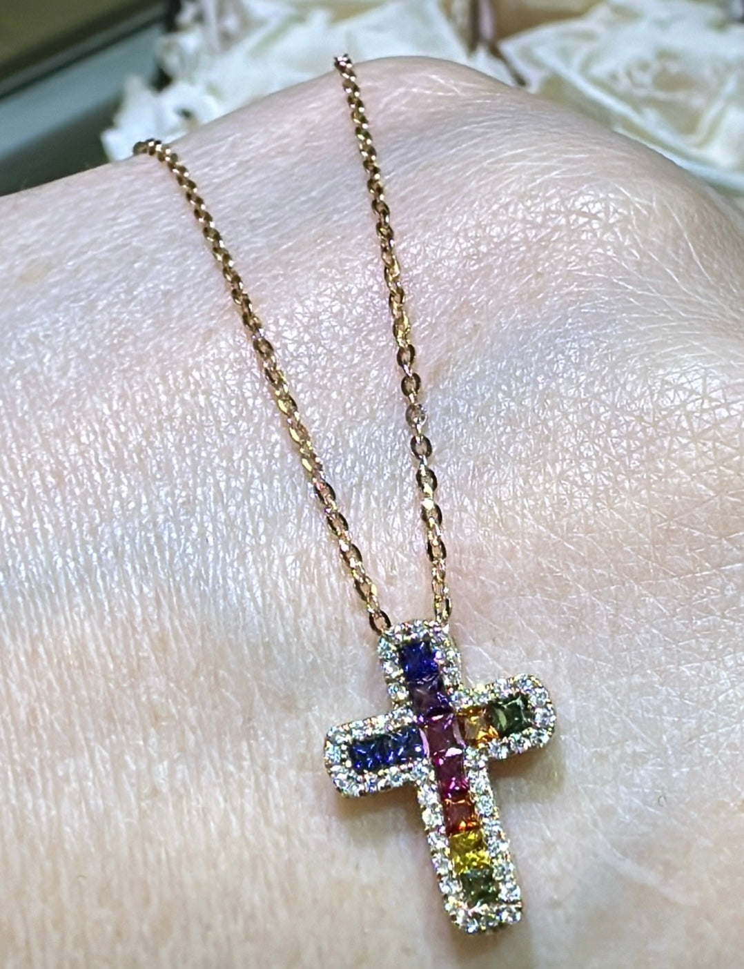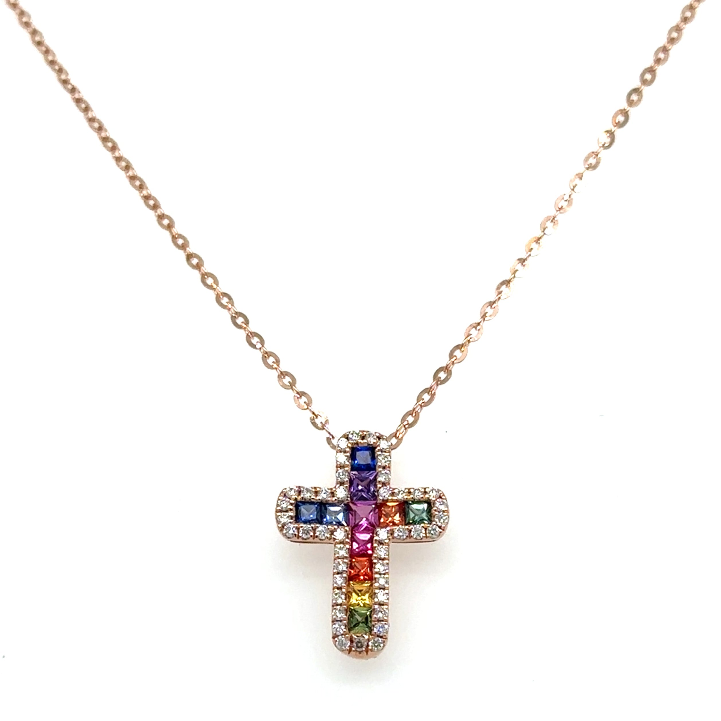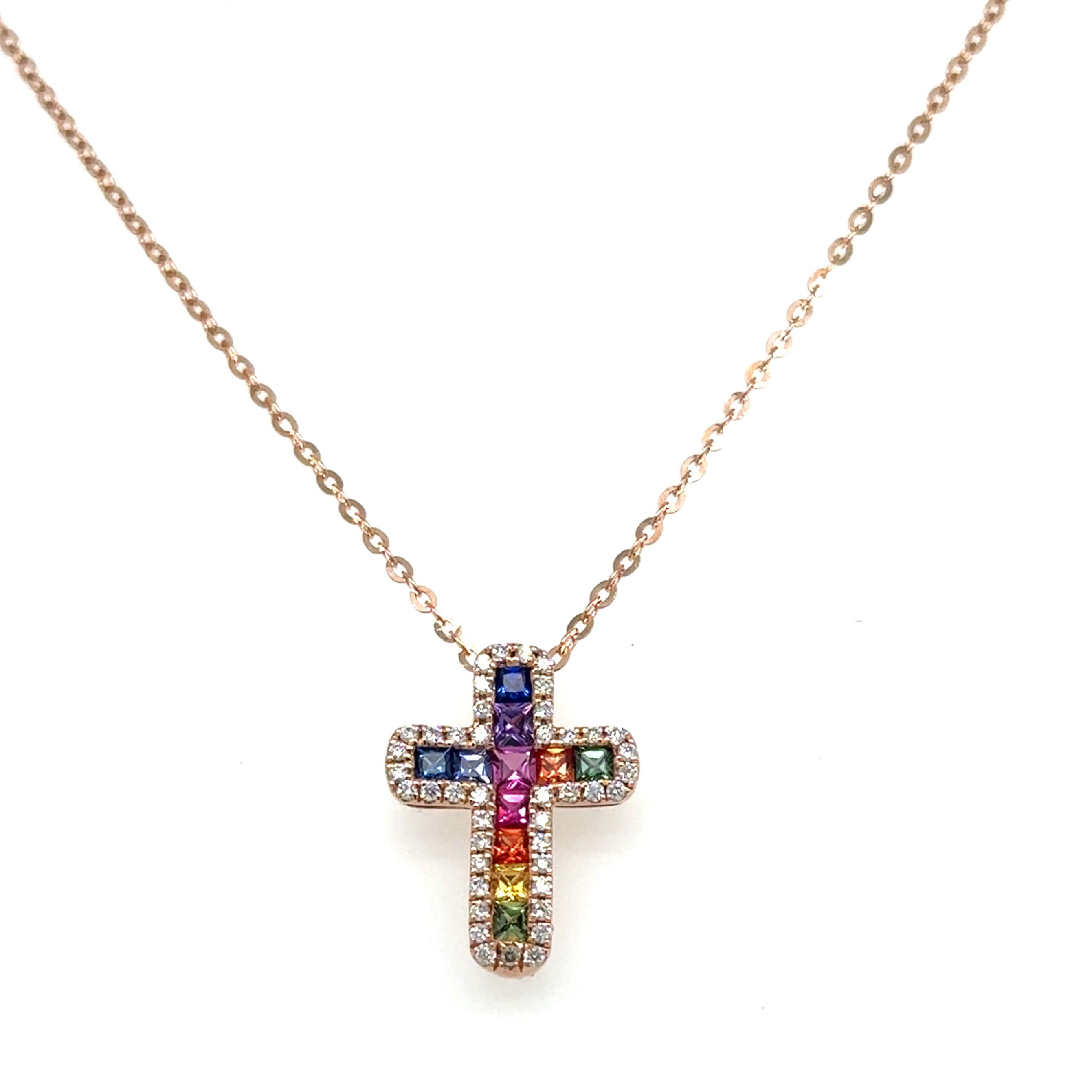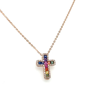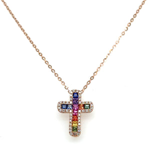 This stunning cross pendant necklace features a 0.65ct tw rainbow sapphire and diamond design, making it a truly unique and eye-catching piece. The vibrant colors and sparkling diamonds make it a beautiful addition to any jewelry collection. Perfect for those who appreciate bold and sophisticated accessories.