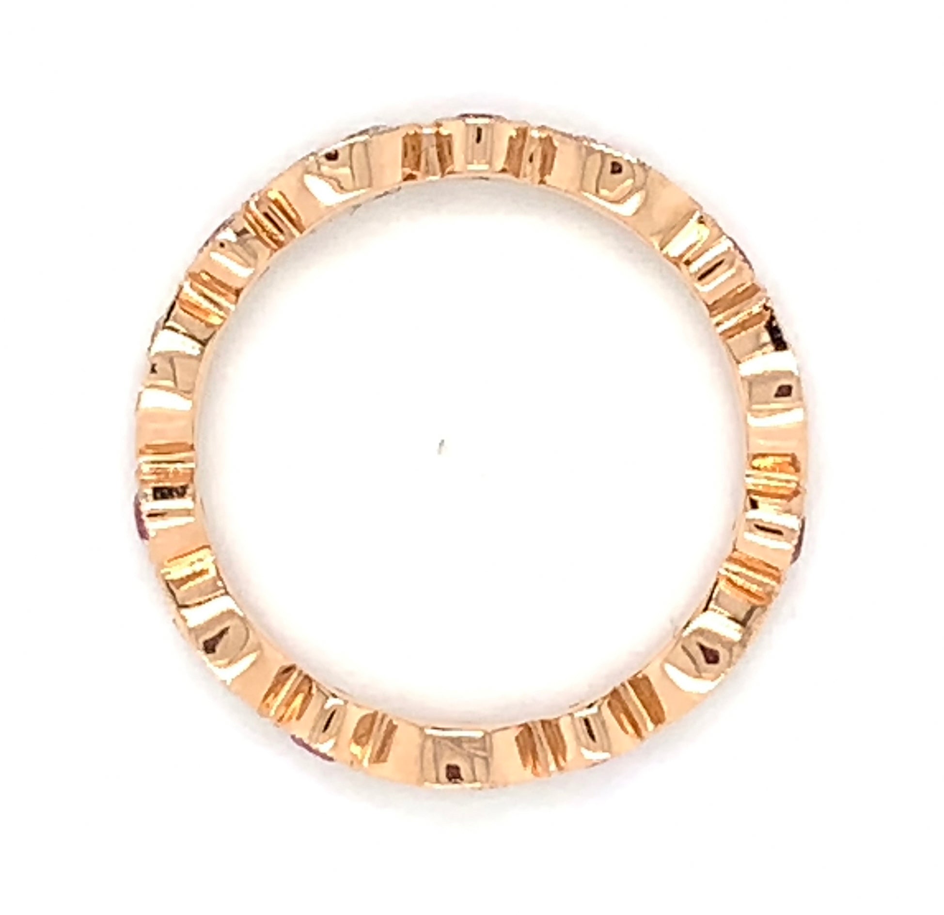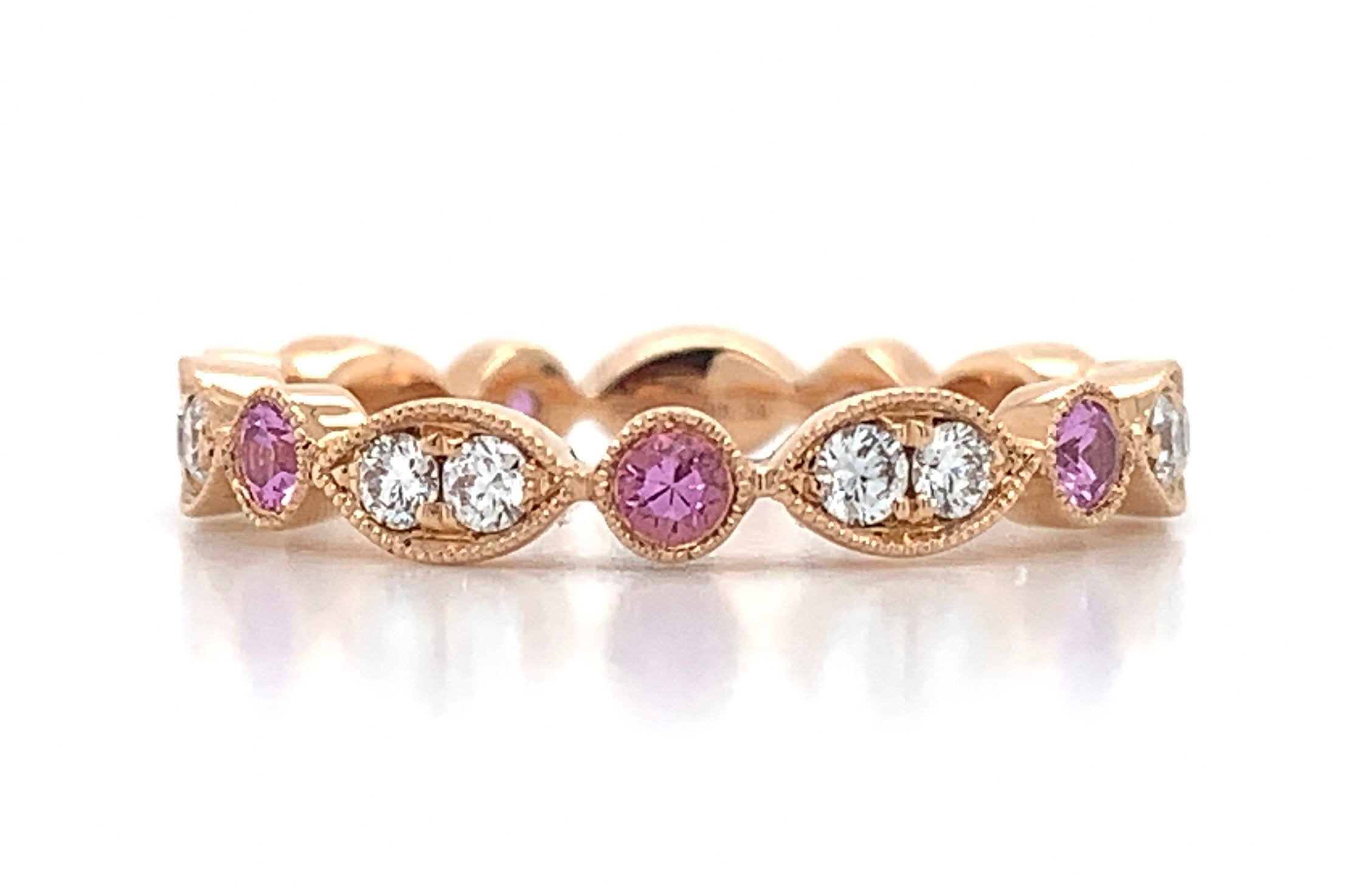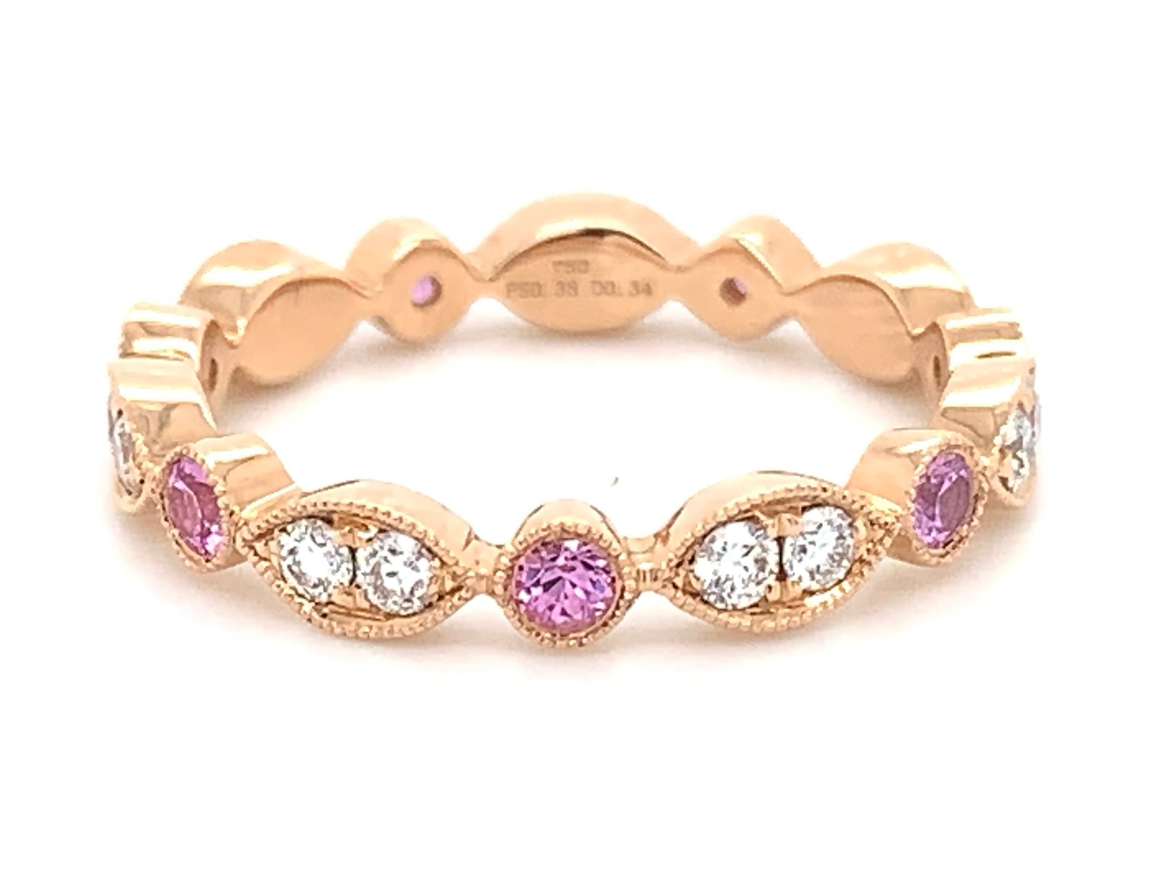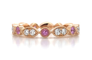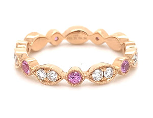 You don't have to break your bank to stay elegant and stylish. This diamond eternity band with 7 pink sapphire 14 round brilliant diamonds is one of our all time faves that has been around for years. 0.70ct in round diamonds and pink sapphire will leave everyone speechless and you will catch yourself looking at it all the time! Metal:18kt Rose Gold Diamond Weight: (14) Round Brilliant Cuts 0.34ct t.w. / (7) Pink Sapphire 0.36ct t.w. Size:6