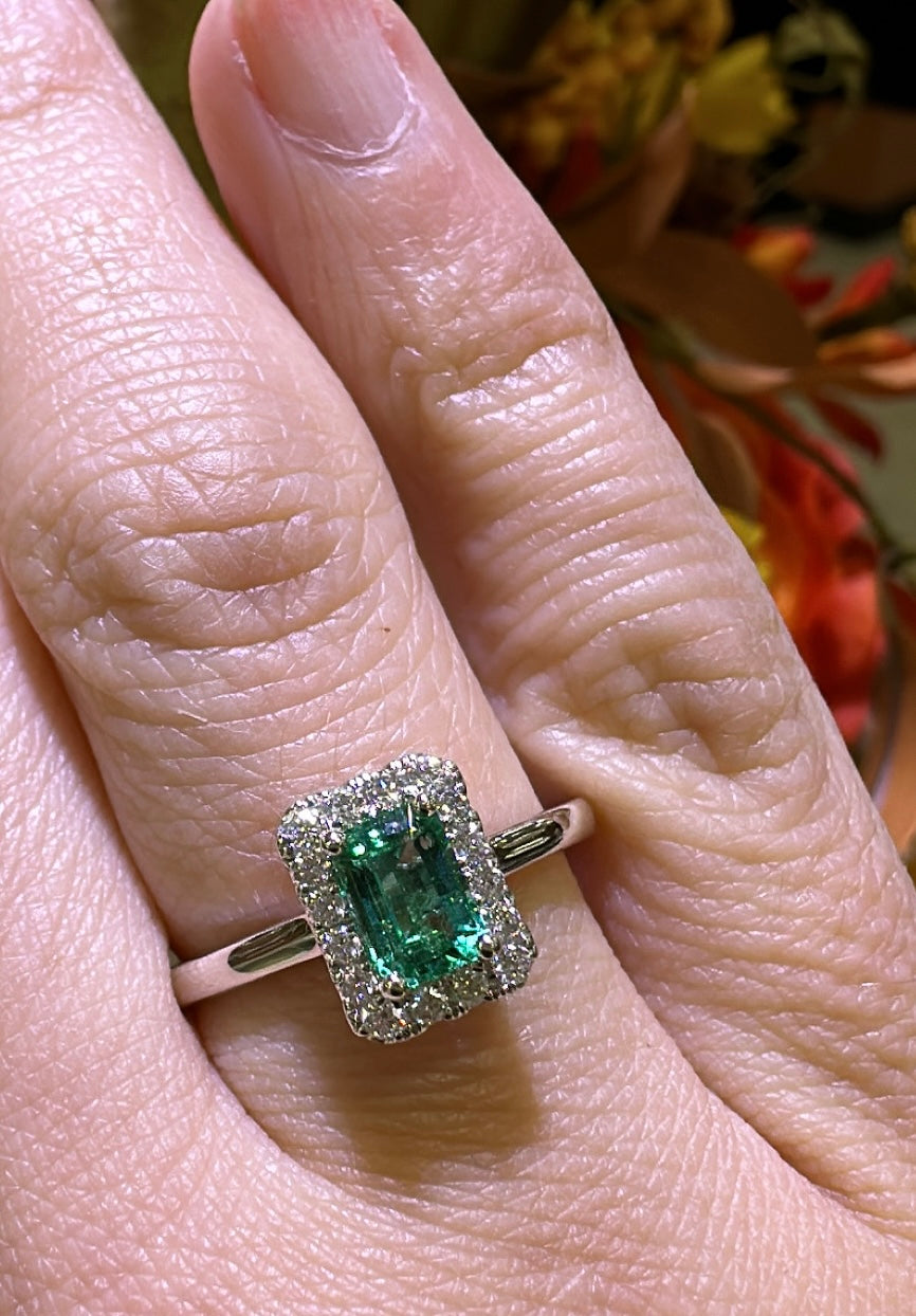 This stunning 0.75carat emerald-cut Emerald and diamond ring will make heads turn with its elegant design and sparkling gemstones. The vibrant green emerald is complemented by dazzling diamonds.