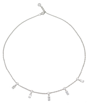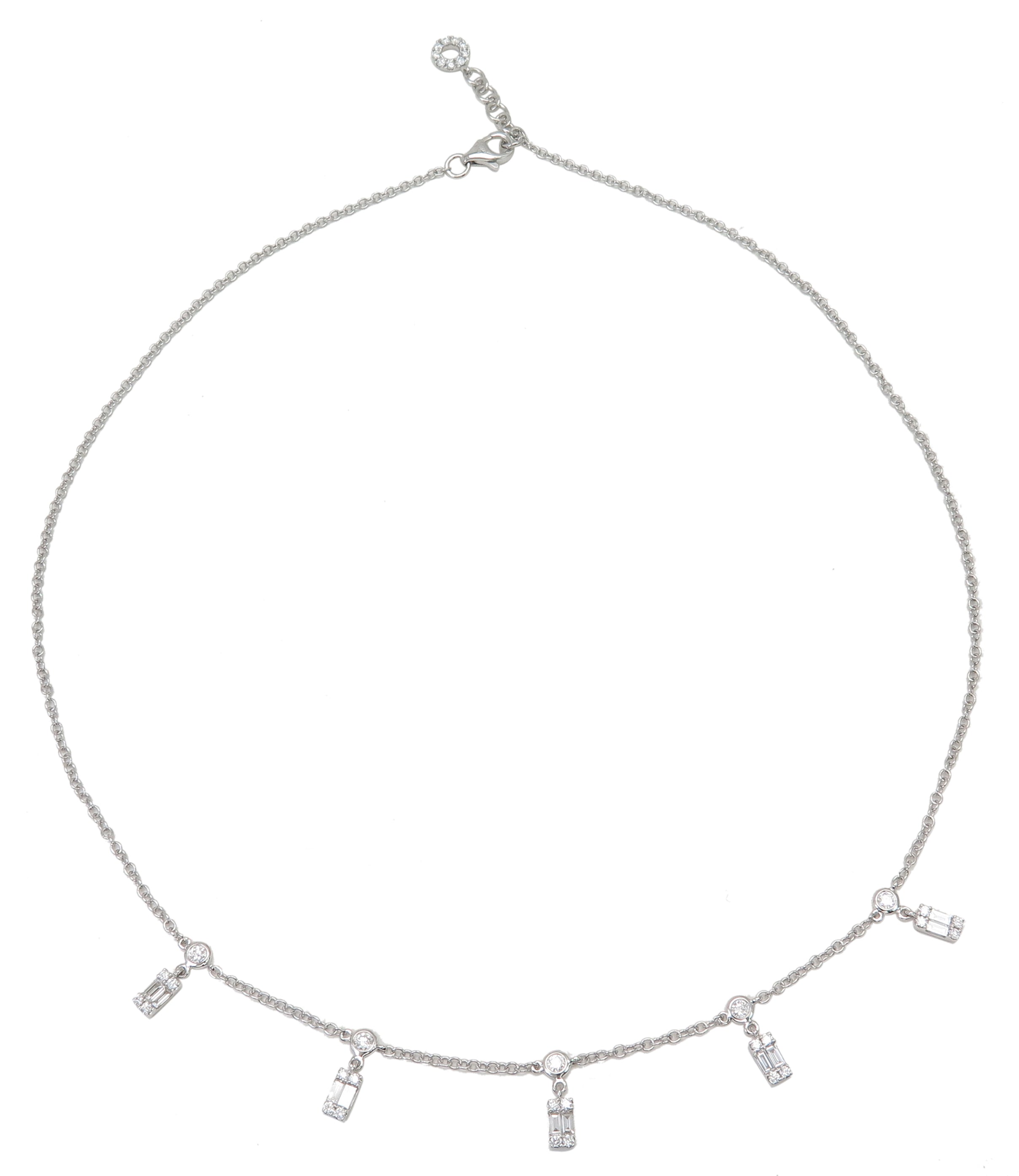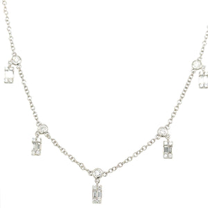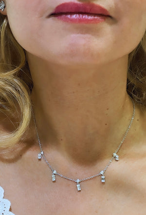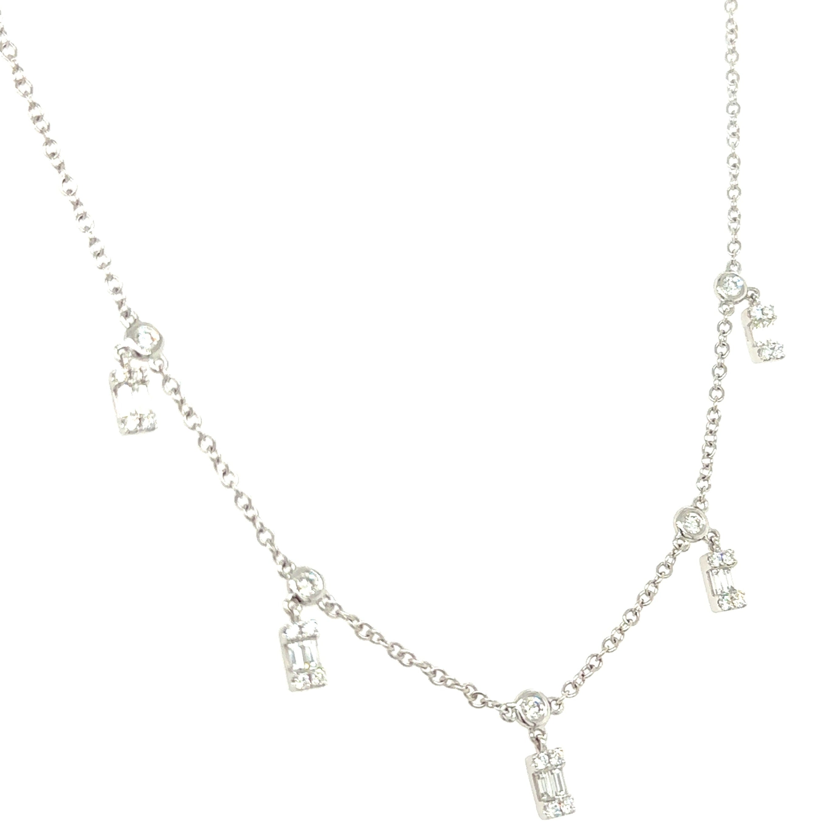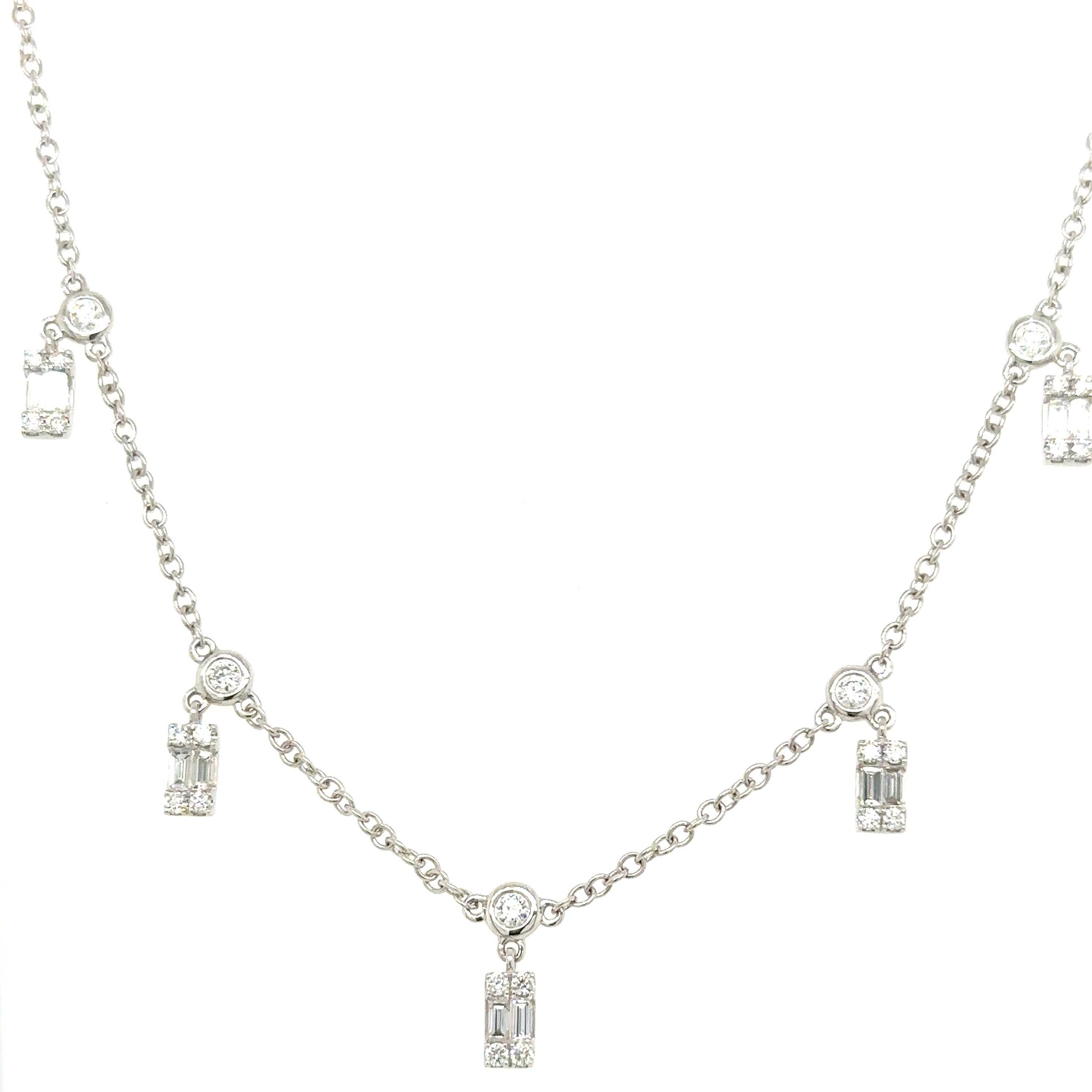 Adorn yourself with the sparkling sophistication of this 0.78ct tw bezel set dangling with cluster emerald-cuts diamond by the yard necklace. Crafted in gleaming 18k gold, this piece is sure to turn heads with its 0.78 carat twinkling diamonds and bold emerald-cut cluster accents. Feel the luxury of your next special occasion!