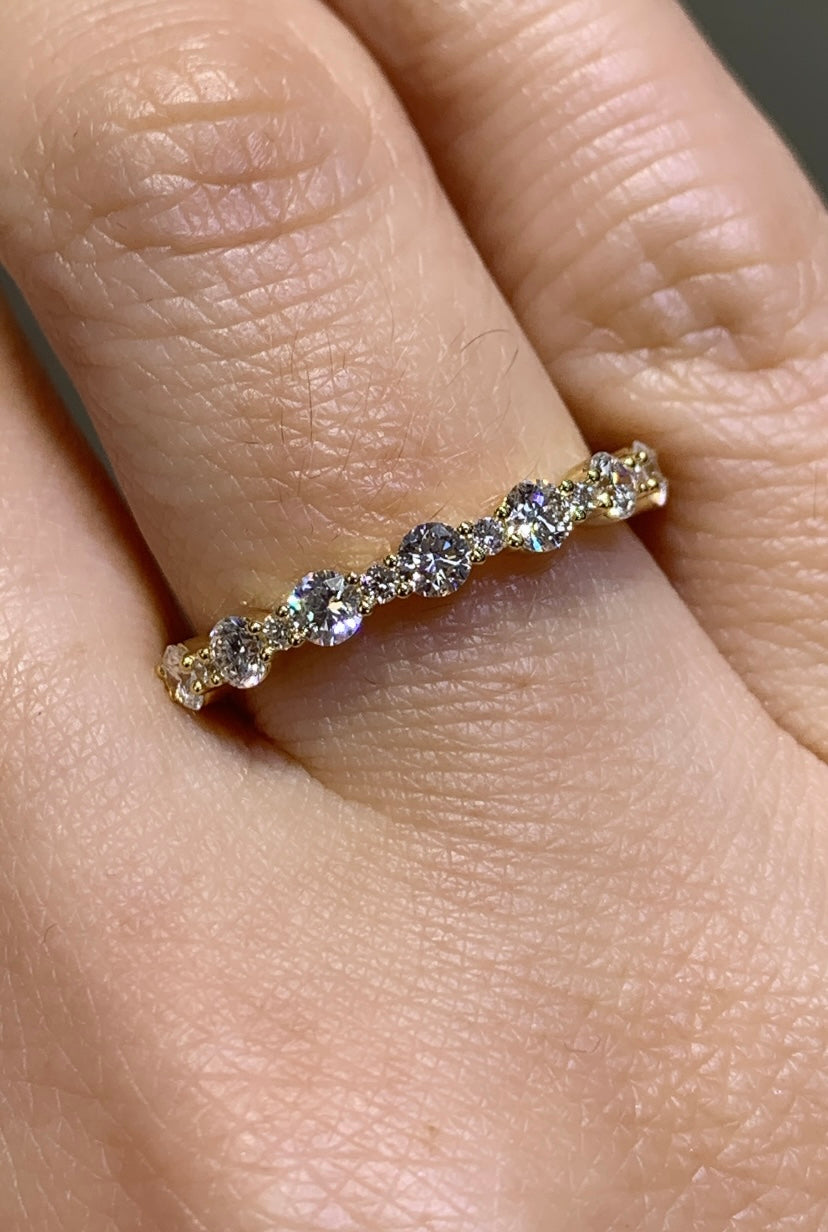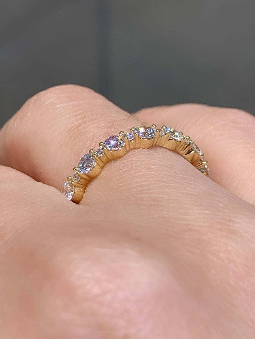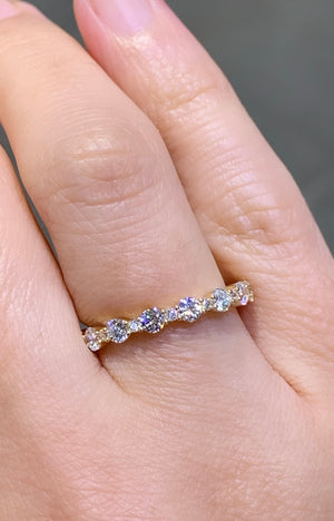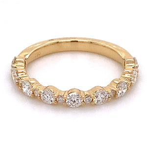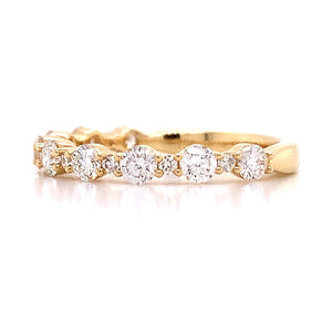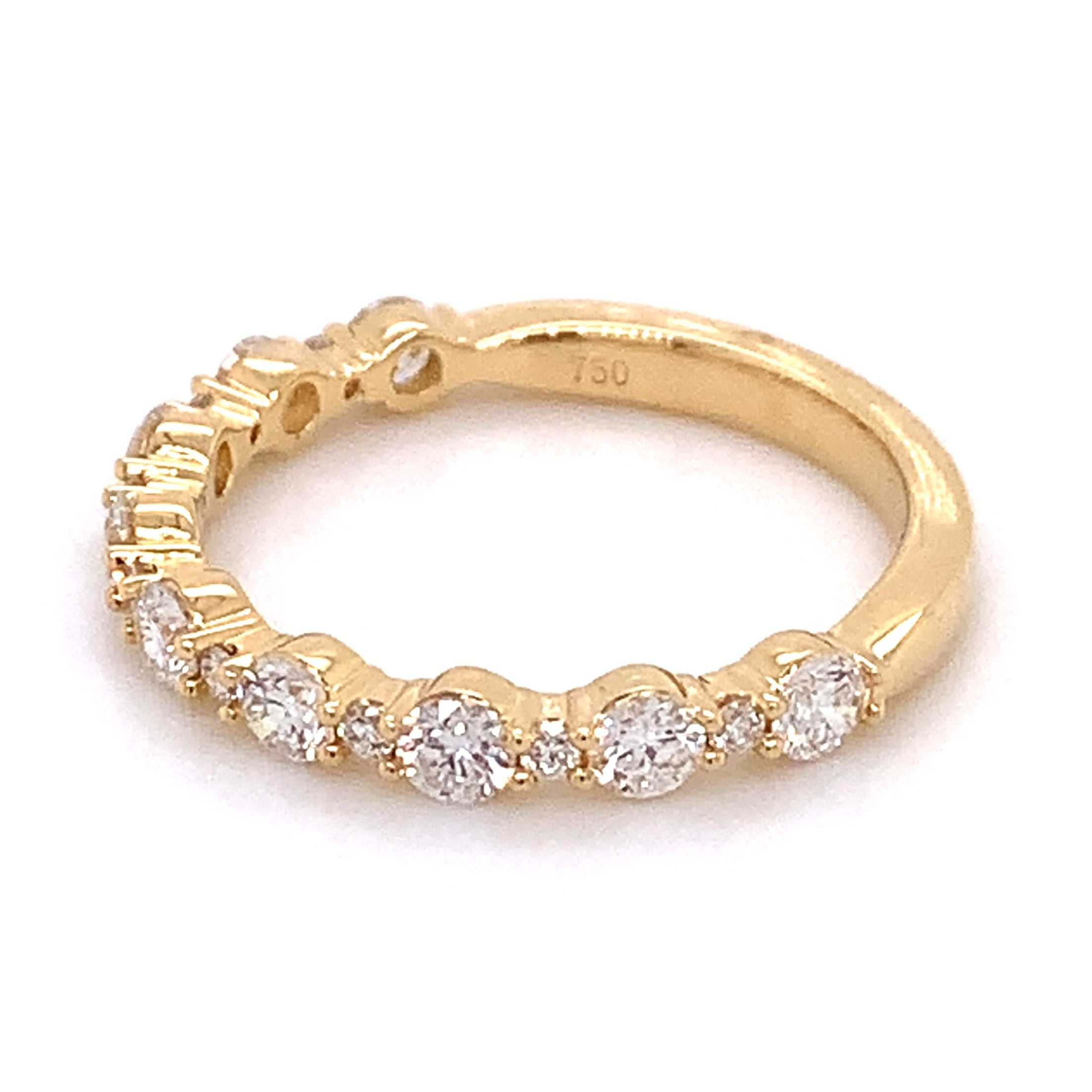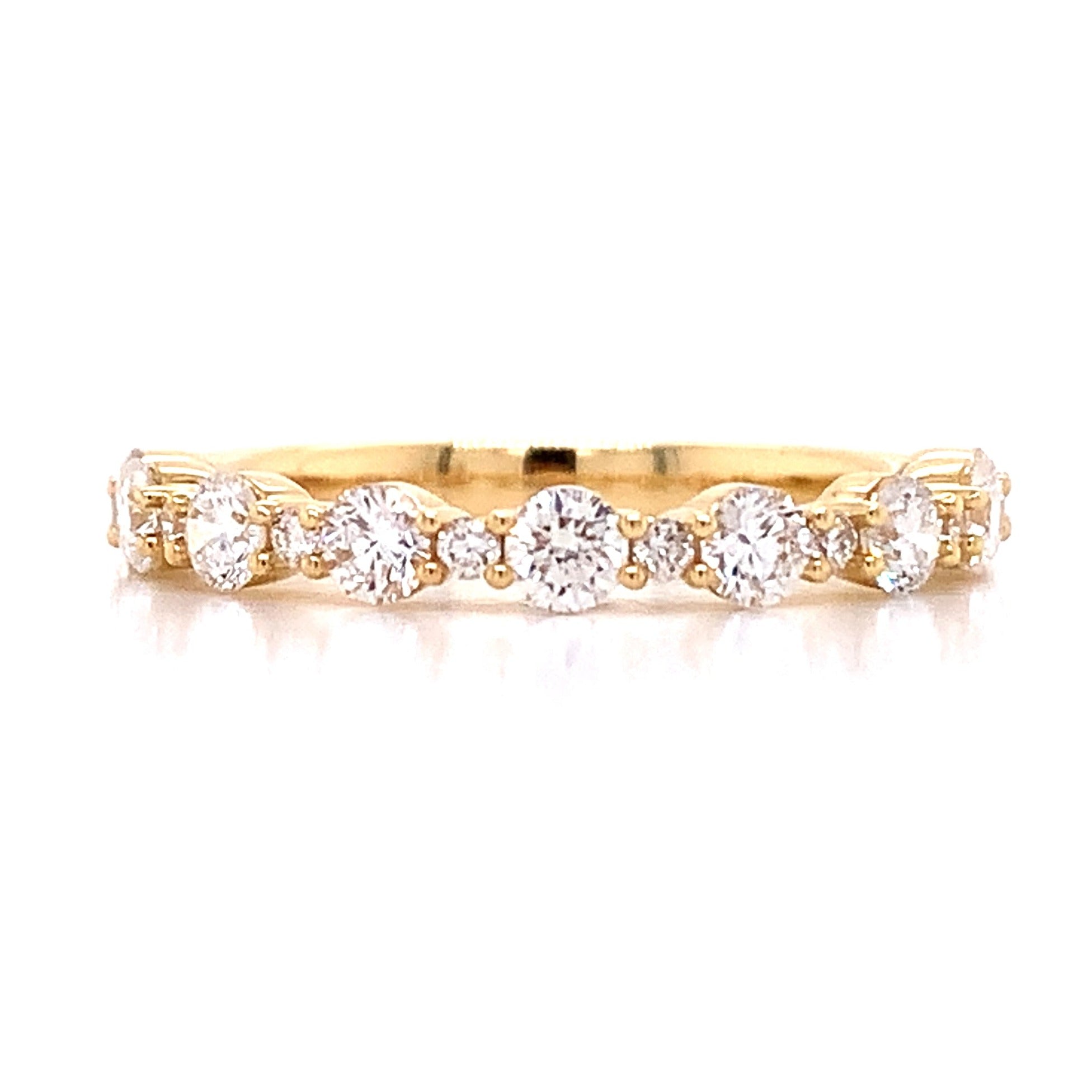 Ladies diamond eternity ring made in 18K yellow gold and is prong set with 30 round brilliant diamonds. Total carat weight 0.81ct tw Metal: 18K Yellow Gold Diamond Shape: 17 Round Brilliant Diamond Carat Weight: 0.81ct tw Band Width: 3 mm - Size: US 6.5 Sizable Setting Type: Prong Finish Type: High Polish