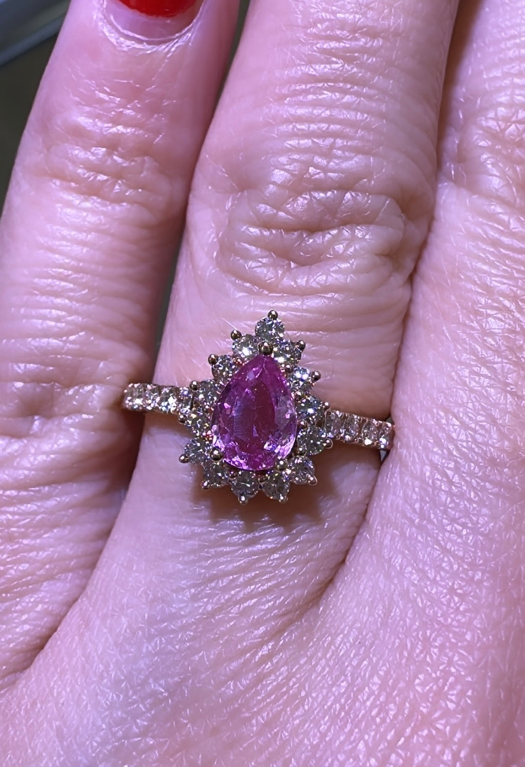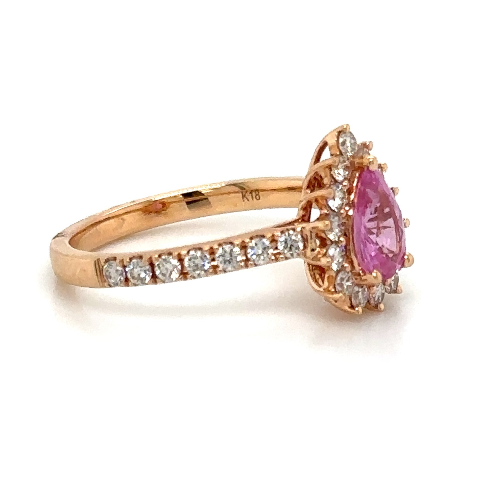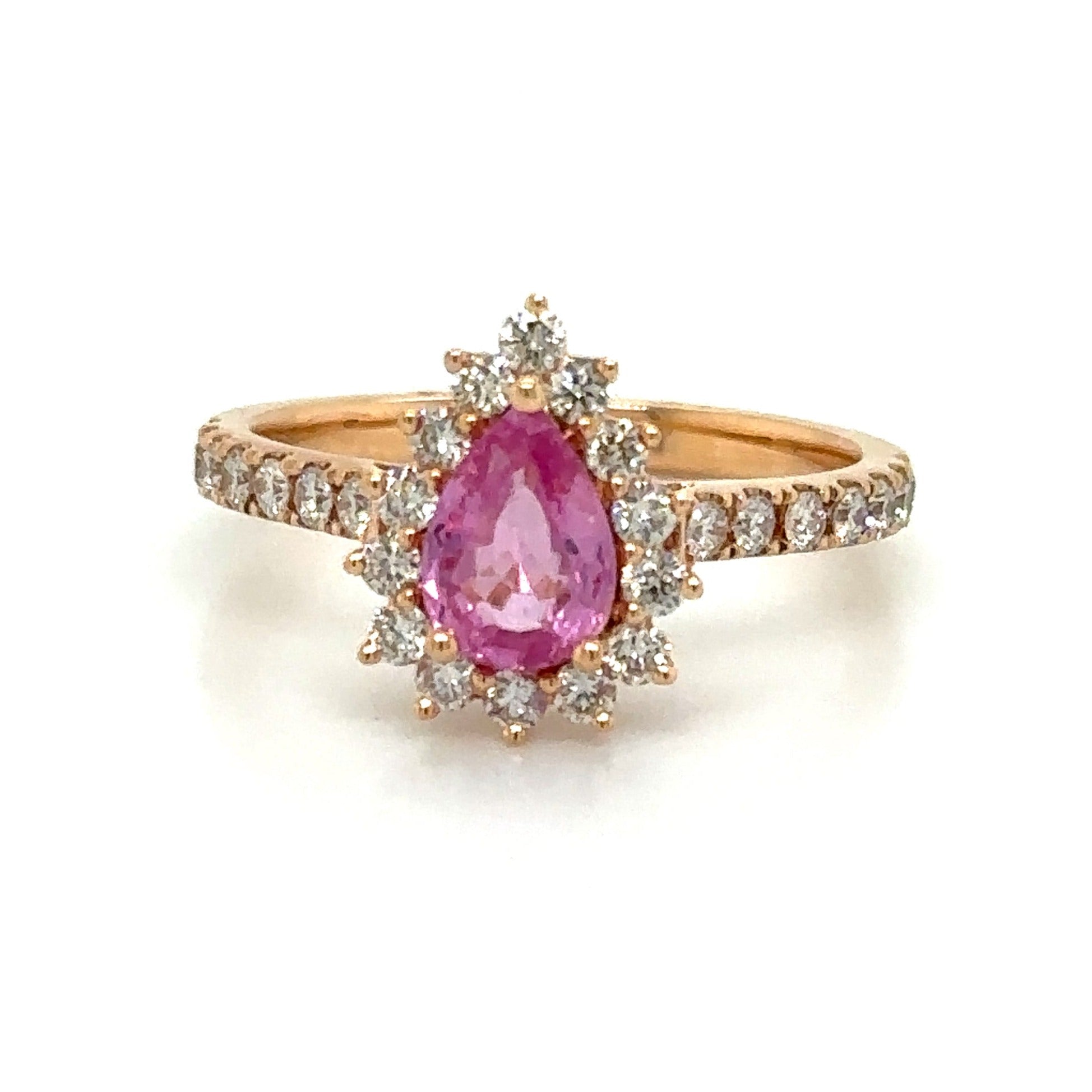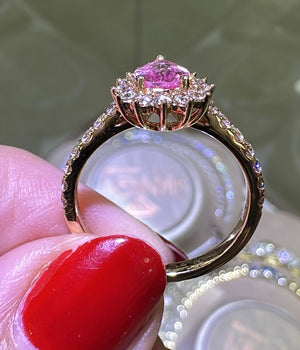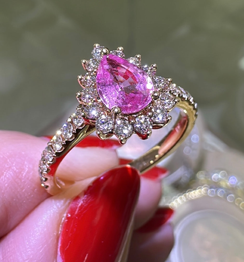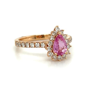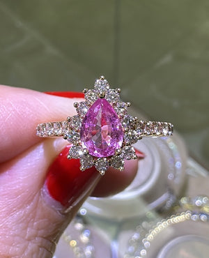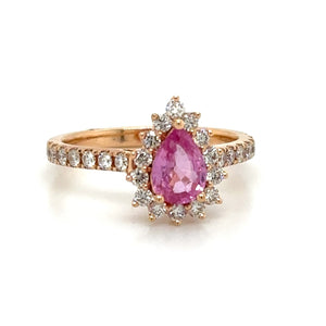 Adorn yourself with elegance and opulence with this 1.38ct tw pear-shape pink sapphire & diamond ring. This stylish and versatile piece features a captivating pink sapphire surrounded by sweet diamonds, making it the perfect statement accessory anytime, anywhere. Glisten in the light and sparkle in style with this must-have ring!
