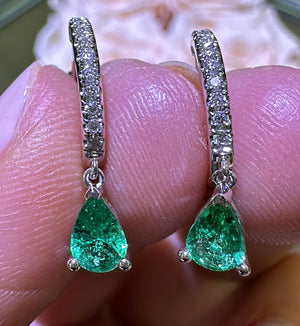 Elevate your style with our stunning 0.89carat pear shape green emerald huggie diamond earrings. These earrings feature a vibrant 0.89carat pear-shaped green emerald dangling from diamond 11mm huggie setting. The perfect accessory for any occasion, add a touch of elegance and sophistication to your look with these exquisite earrings.