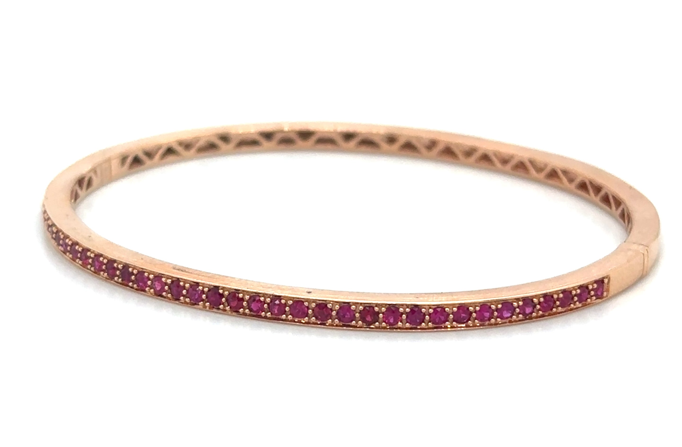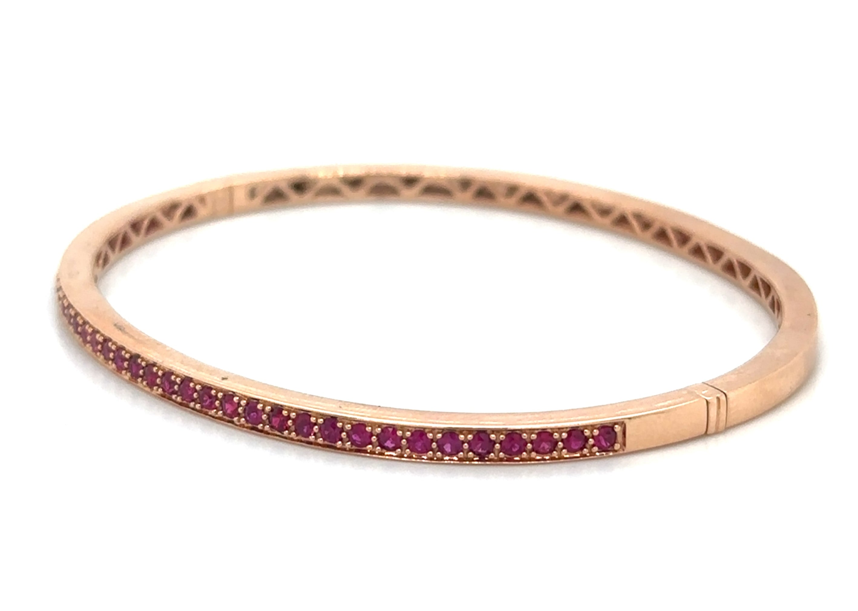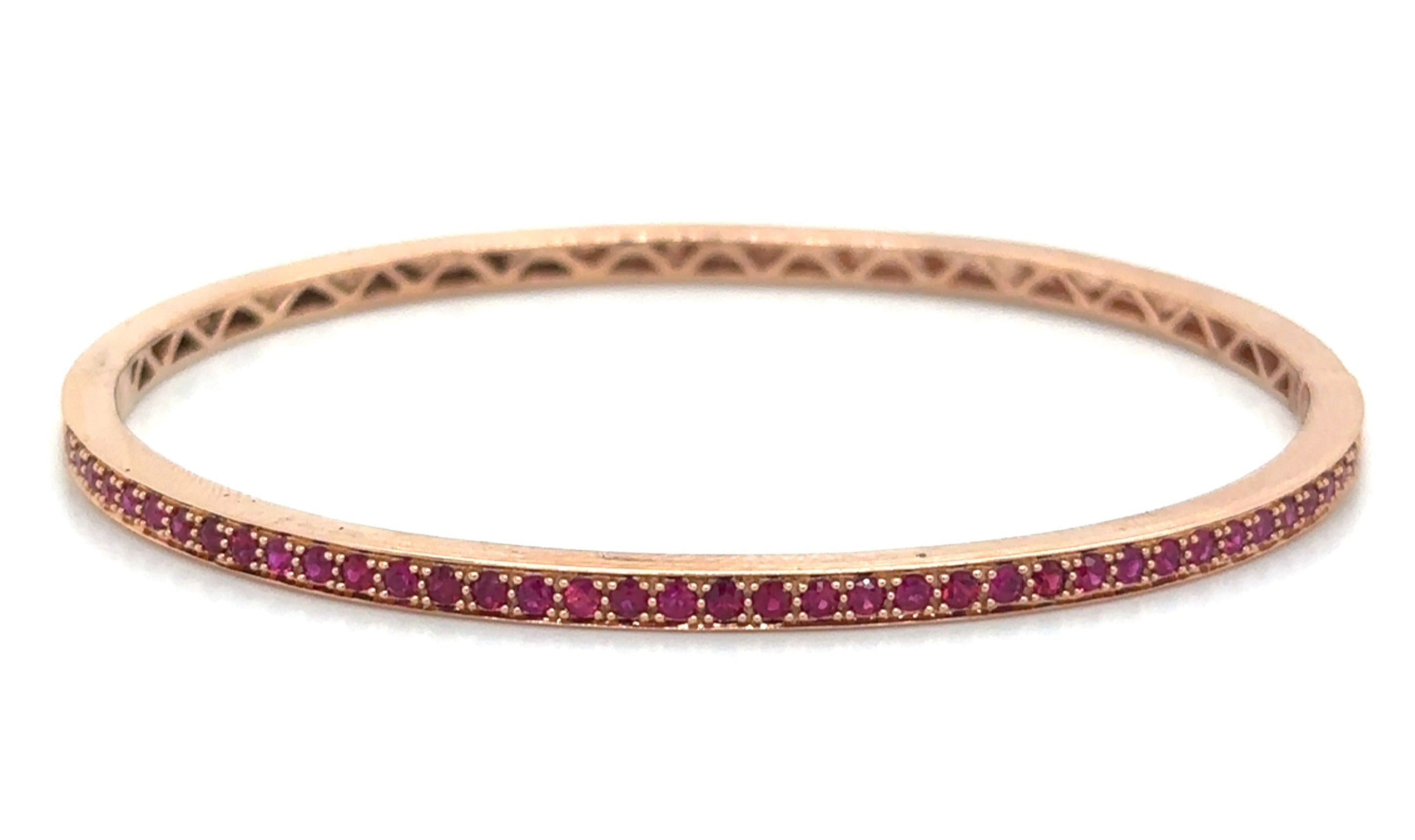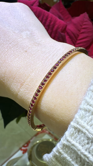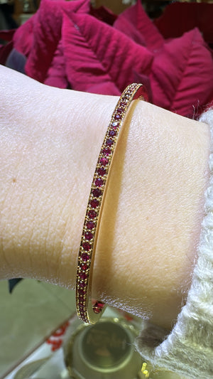 Indulge in the luxurious beauty of our 0.89ct t.w. ruby gold bangle bracelet! Adorned with stunning rubies, this elegant bracelet will elevate any outfit. With its sleek design and high-quality materials, it's the perfect addition to your jewelry collection.