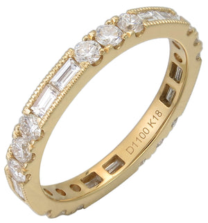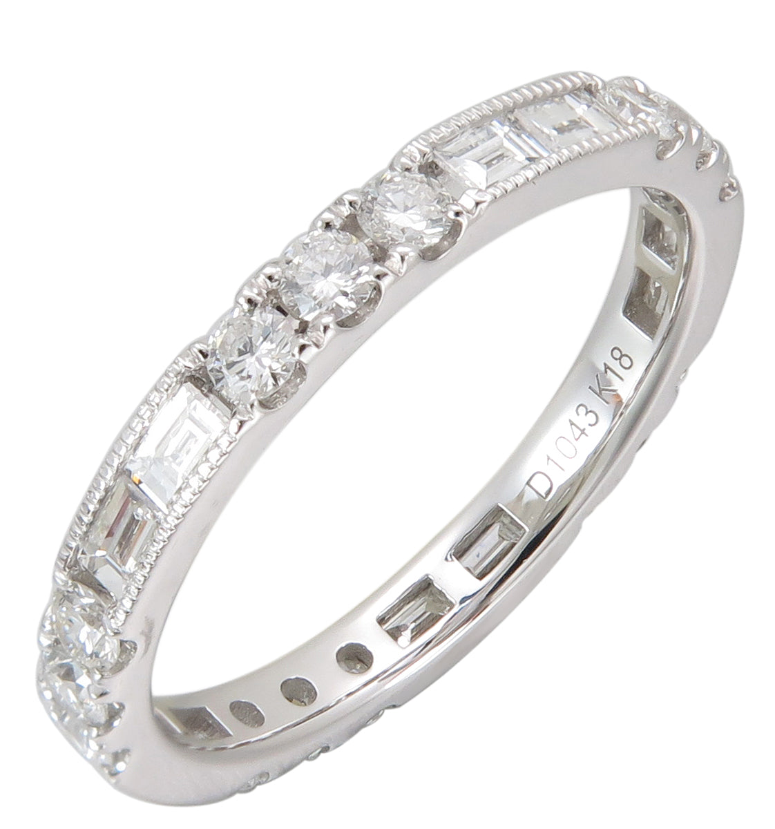 Sparkle with timeless elegance in this unique, 0.97ct tw mix-shape baguette and round alternating diamond eternity ring. Featuring an exquisite combination of baguette and round cut diamonds, this luxurious eternity ring is sure to become a treasured piece you can cherish for years to come!