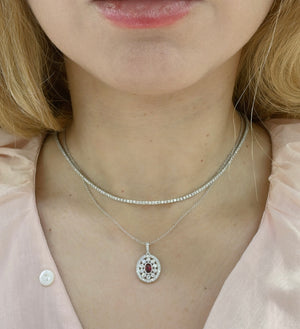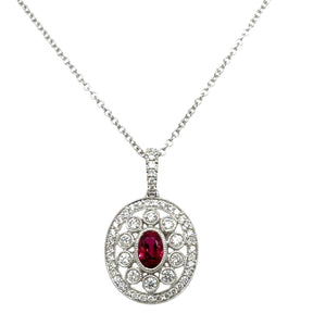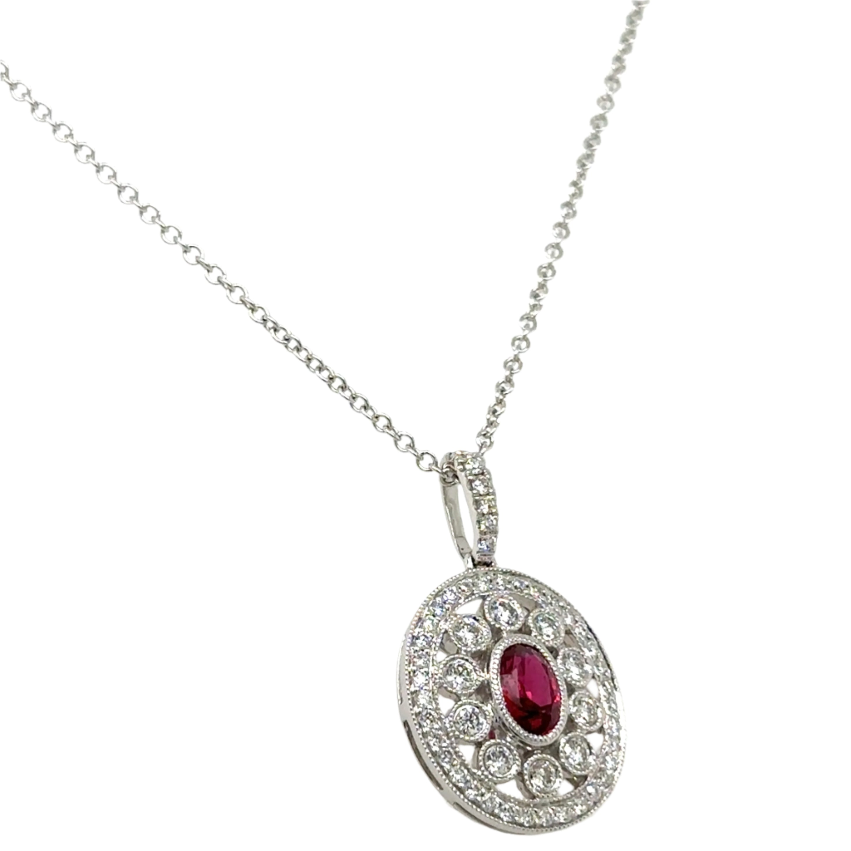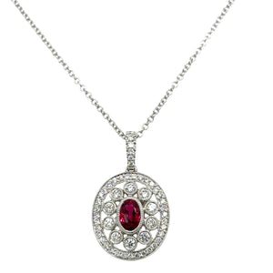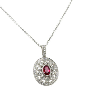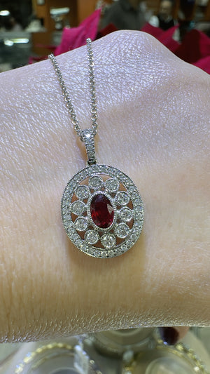 Indulge in classic elegance with our 1.00ct tw ruby and diamond pendant necklace. featuring a brilliant ruby and sparkling diamonds, this necklace will add a touch of luxury to any outfit. Perfect for a special occasion or a statement piece for everyday wear. Elevate your style and make a lasting impression!
