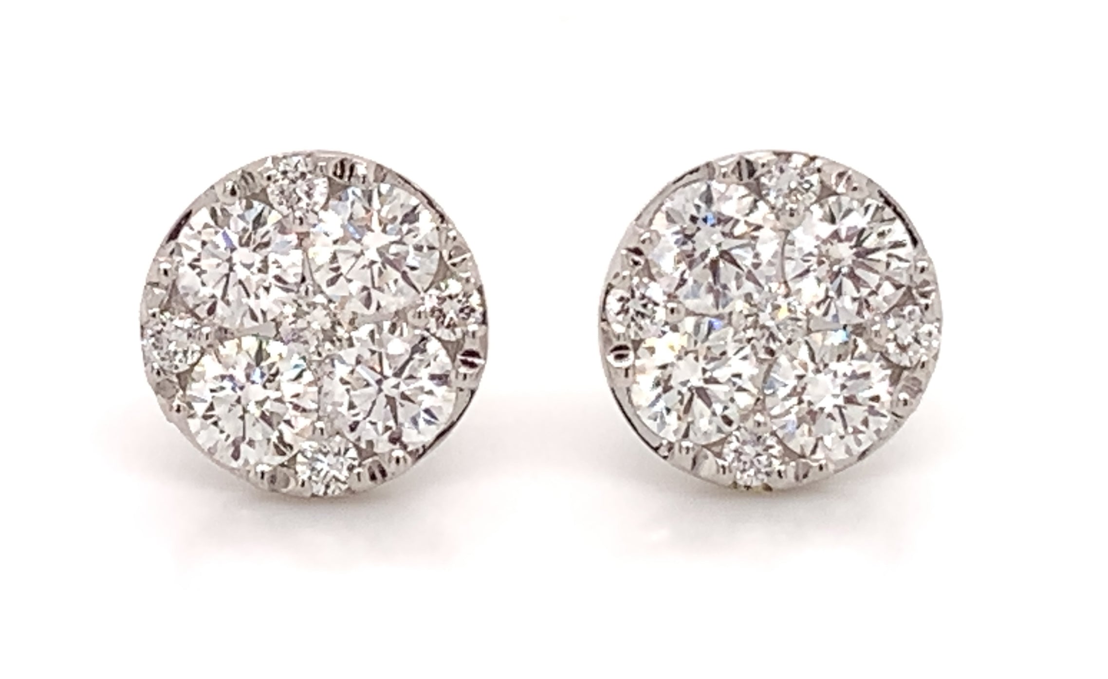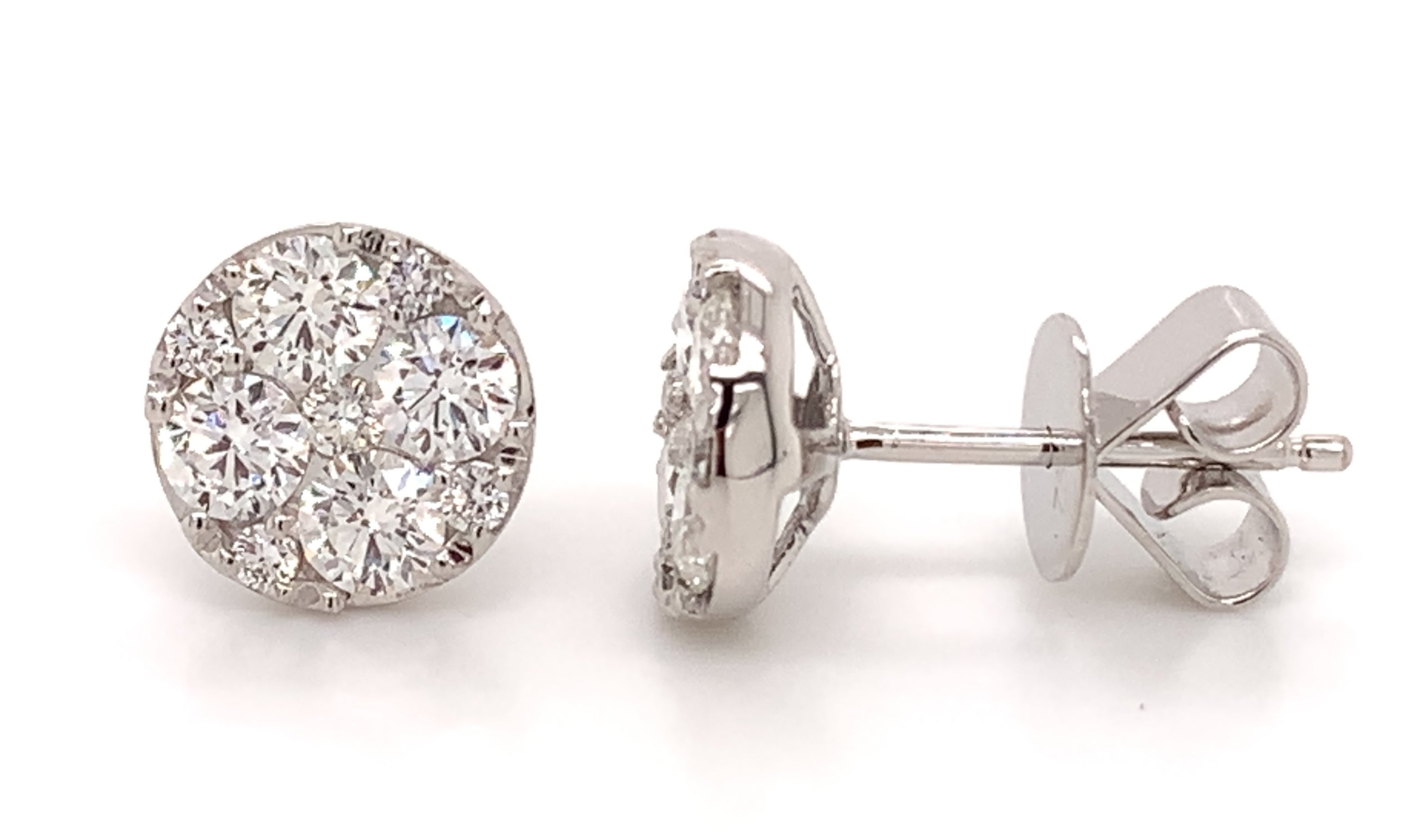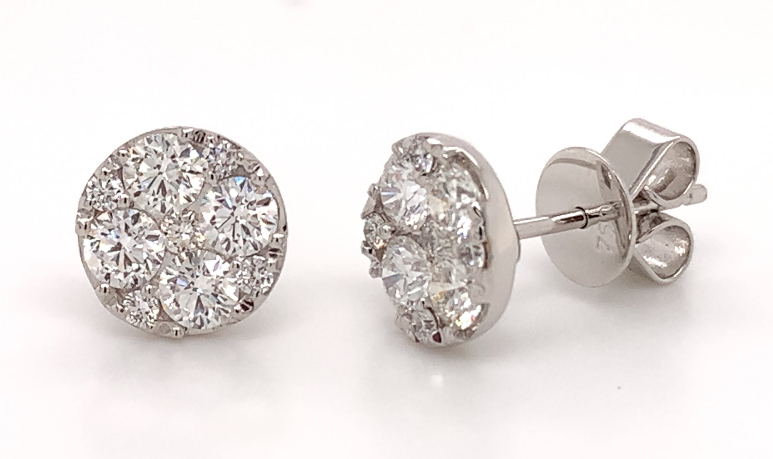 These stud earrings feature beautiful round white diamonds. Multiple round brilliant cuts which gives these studs a much bigger look for half the price. Crafted from lustrous 18Kwhite gold 8mm in diameter you will find yourself wearing these every day.