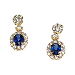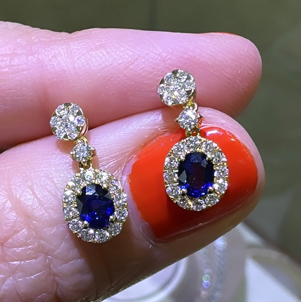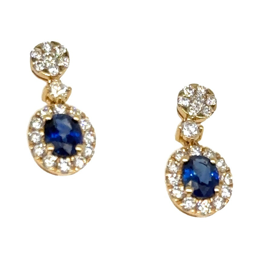 These elegant earrings will add a touch of sophistication and glamour to any outfit. Featuring sparkling diamonds and a striking blue oval sapphire, these earrings are the perfect statement of style. Slip them on and revel in their breathtaking beauty!