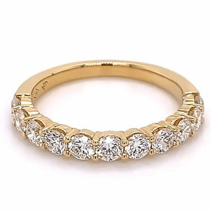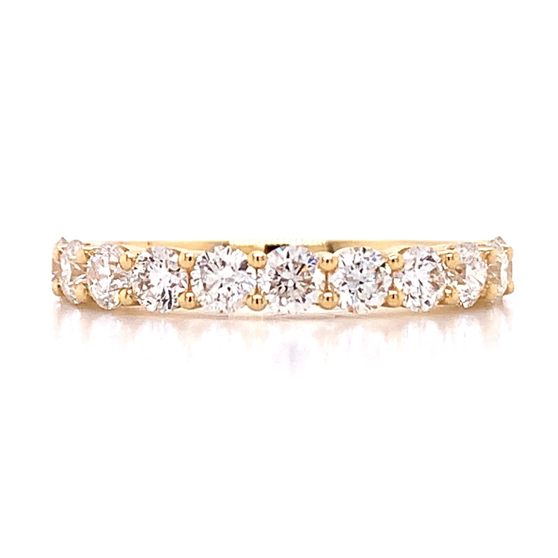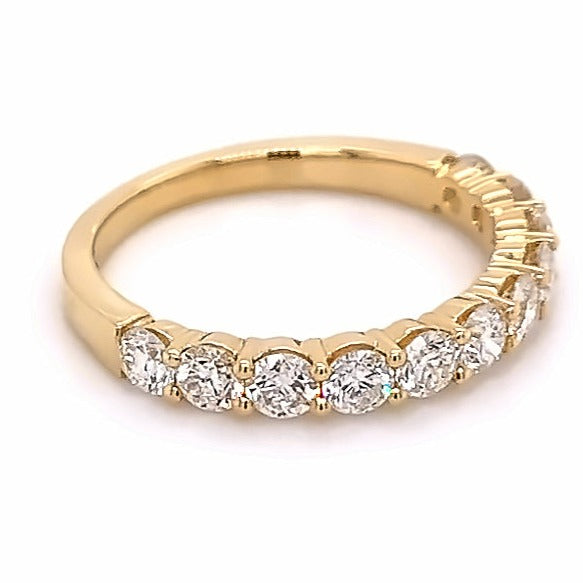 Ladies diamond eternity ring made in 18K yellow gold and is complemented by 11 round brilliant diamonds totaling in 1.10ct tw. Wear it alone or create a bold look by wearing it next to your engagement ring. Metal: 18K Yellow Gold Diamond Shape: Round Brilliant Number Of Diamonds: 11 Diamond Carat Weight: 1.10ct tw Diamond Quality: G - H / VS - SI Setting Type: Prong Finish: High Polish
