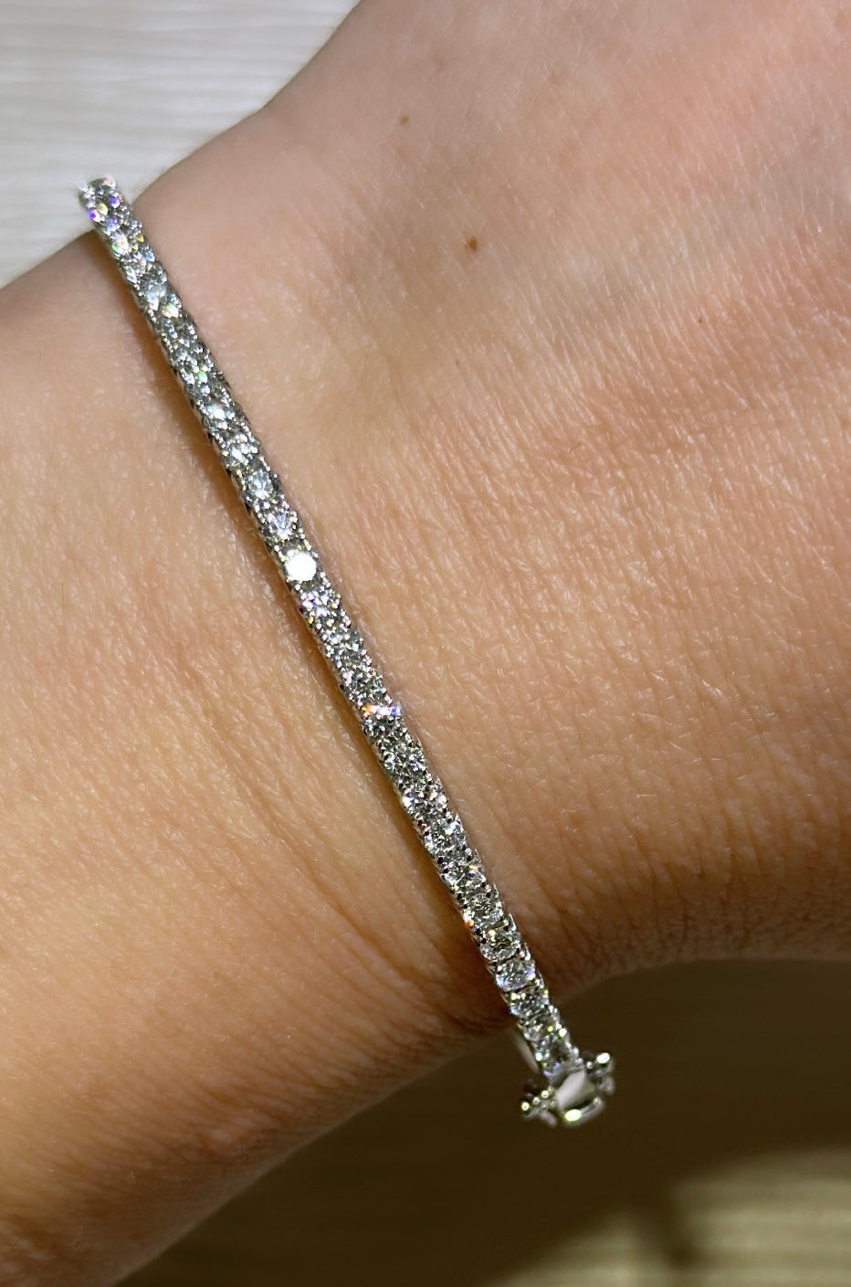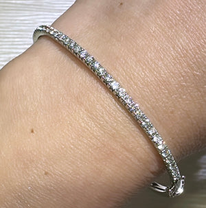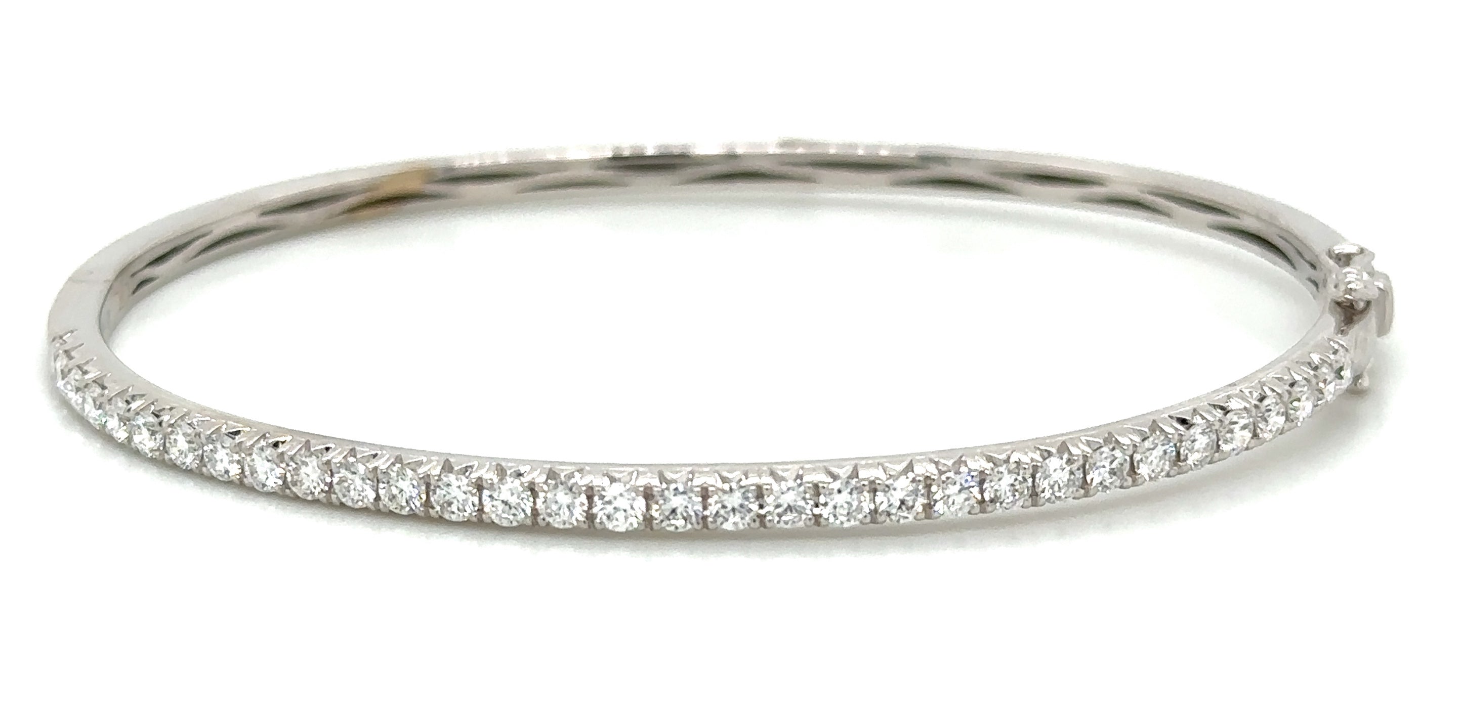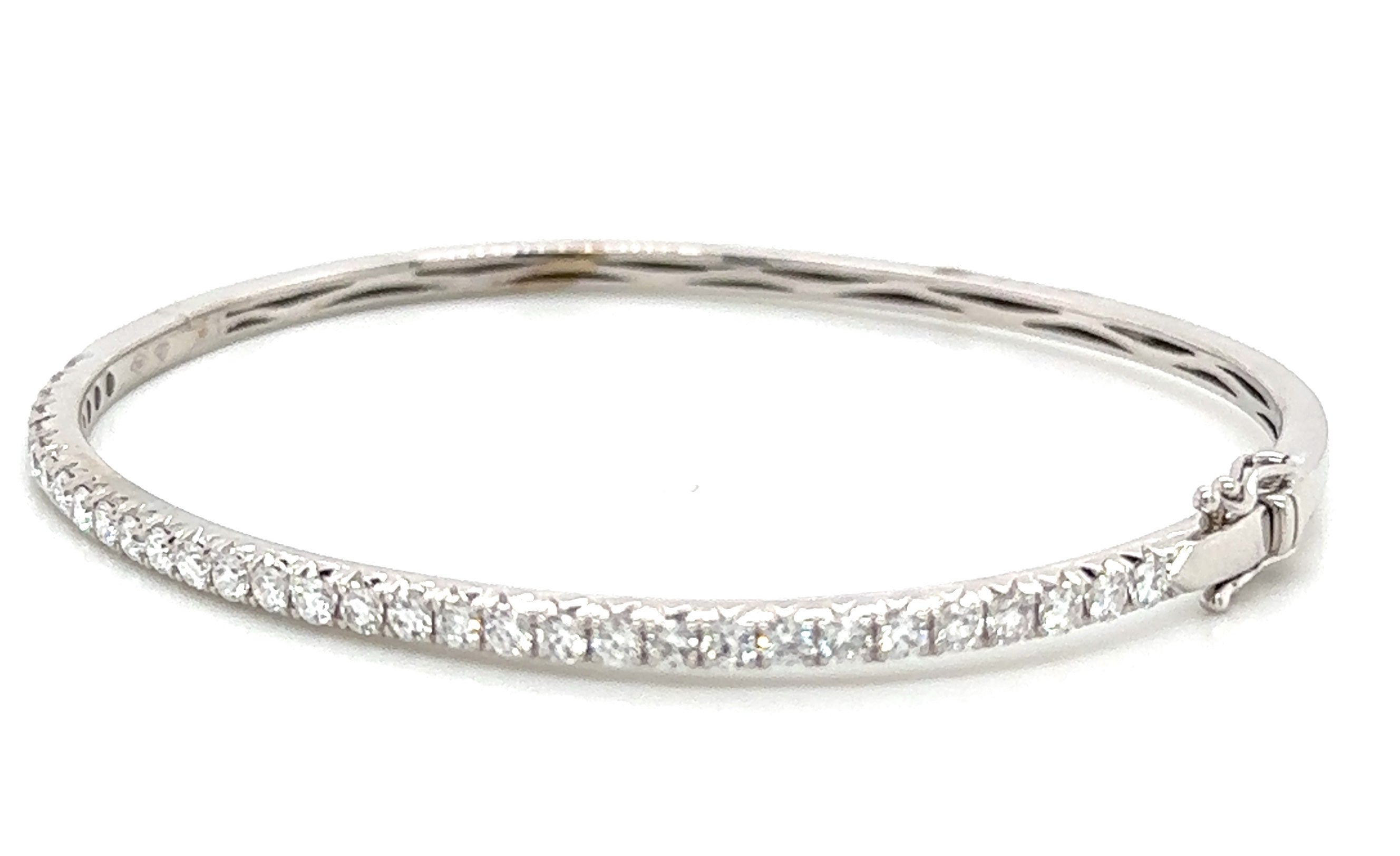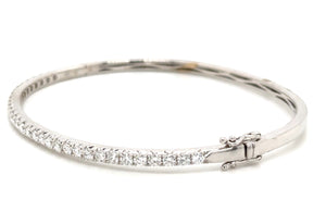Bangles are great for stacking, but with this bold and beautiful diamond bangle bracelet, you only need one! This 18K white gold bracelet is simply covered in pave round diamonds...