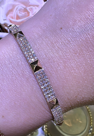 Indulge in luxury with our 1.25ct tw triple row pave diamonds rose gold bangle bracelet! The sparkling studs add elegance and sophistication to this statement piece. Perfect for adding a touch of glamour to any outfit. Treat yourself or a loved one to the ultimate accessory!