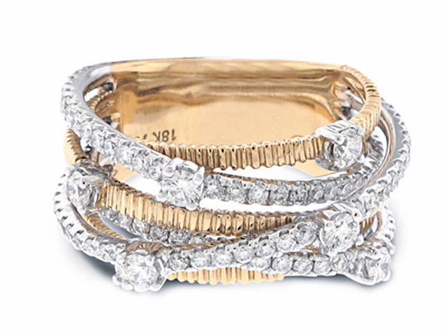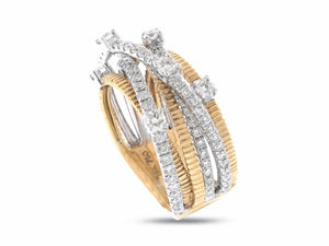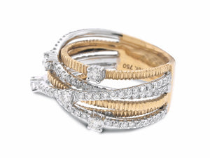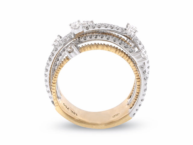Designer inspired multi-row ring in 18kt two tone gold with diamond accents will take your breath away. Slip it on whenever you need to make a statement or make it your right hand ring and wear it every day. Set with 107 round brilliant diamonds will send lots of complements your way.
