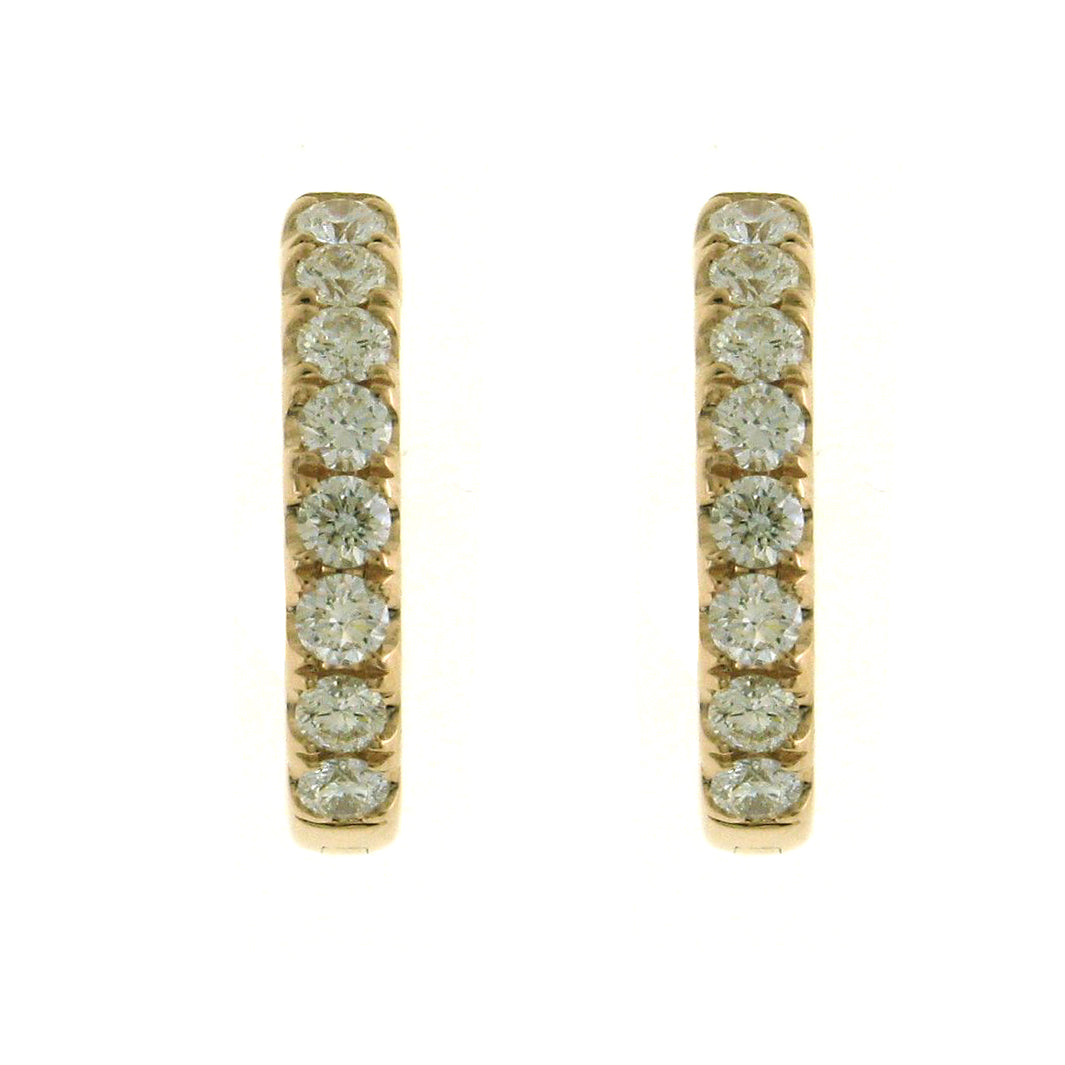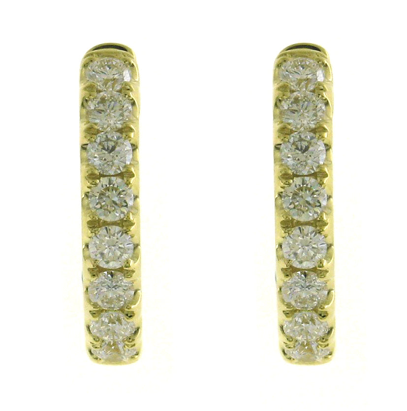 These oval diamond hoop earrings have been given a stylish touch with elegant round cut diamonds placed inside and out. 18K yellow gold hoop earrings are set with 1.32 carats in round diamonds . Every woman can always use a pair of classic diamond hoop earrings to add to their wardrobe. Accessorize with these hoop earrings for fun and casual looks, or formal occasions where you want focus to be on your outfit.